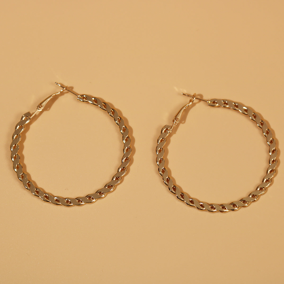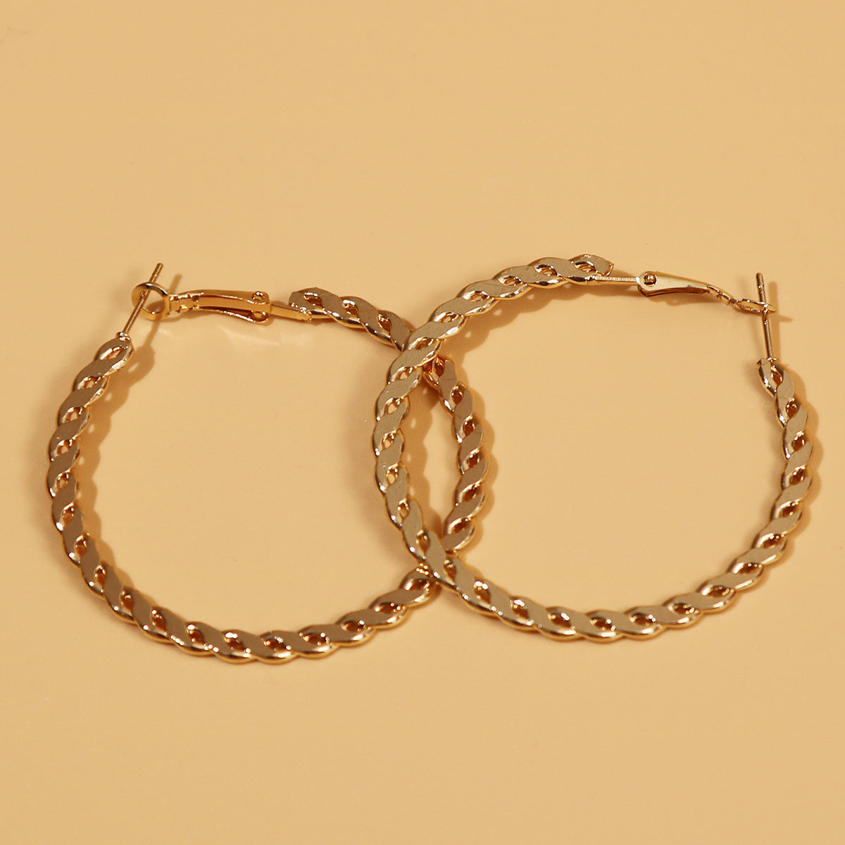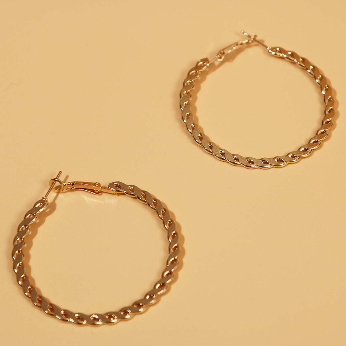 Complete your look with these elegant golden flat chain circle earrings that add a touch of sophistication to any outfit.