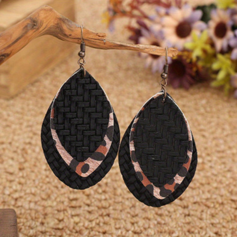 Leaf Leopard Pattern Sequins Decor Retro Dangle Earrings PU Leather Gift