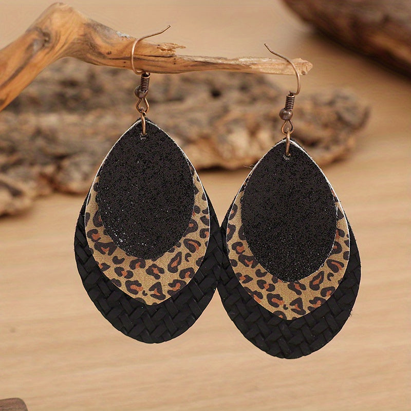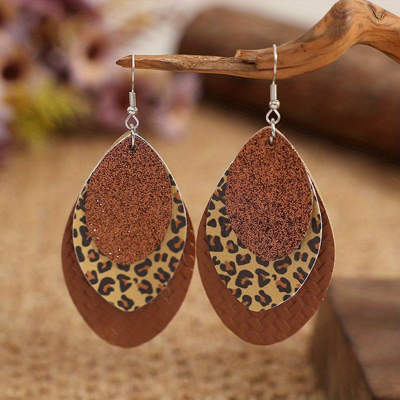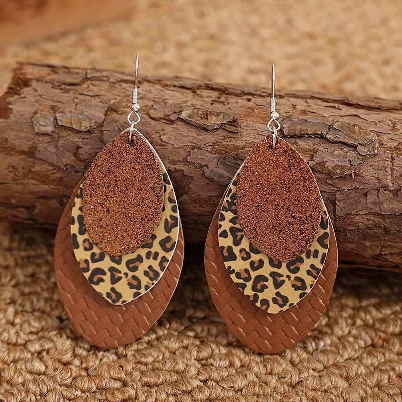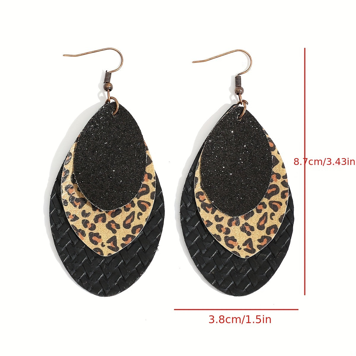 These dangle earrings feature a 3-layer design with leaf, leopard pattern, and sequins decorations. Made of PU leather, they are perfect for daily casual wear and make a great gift for women and girls.
