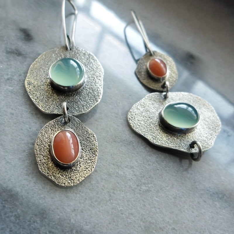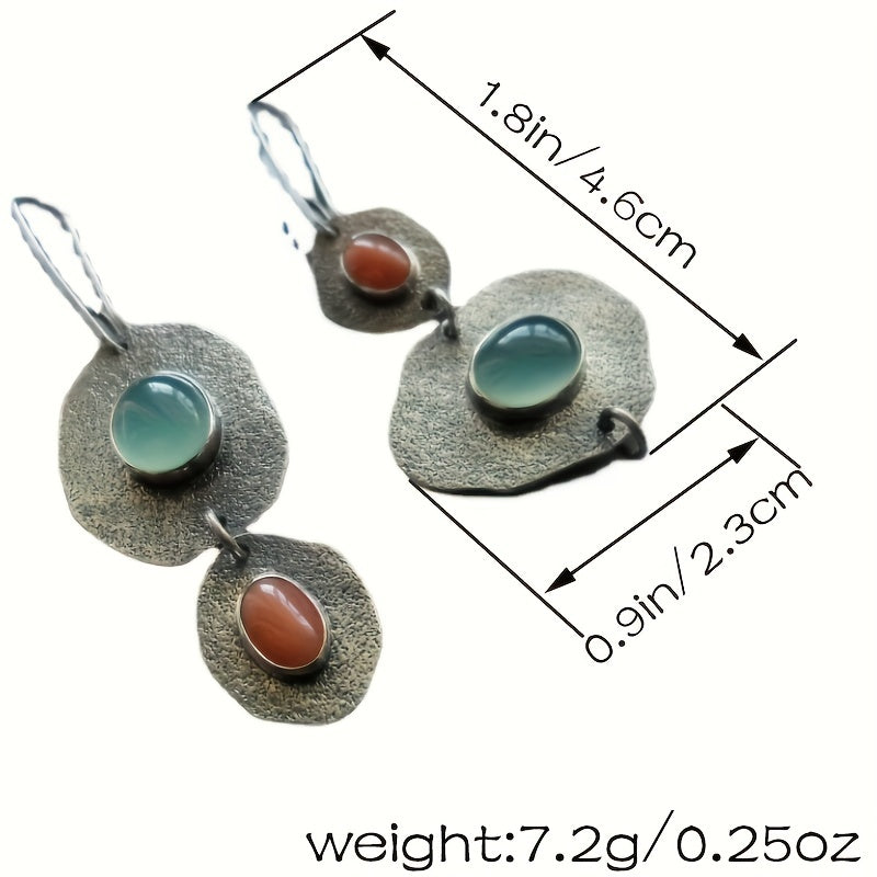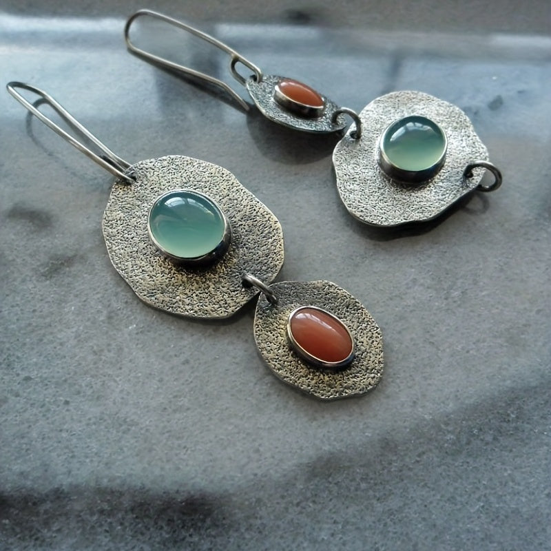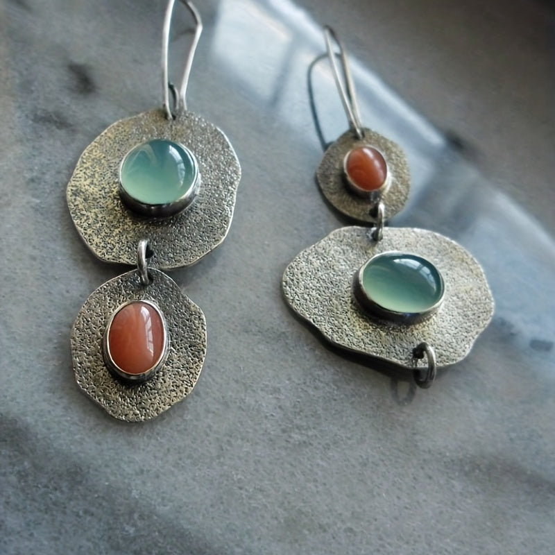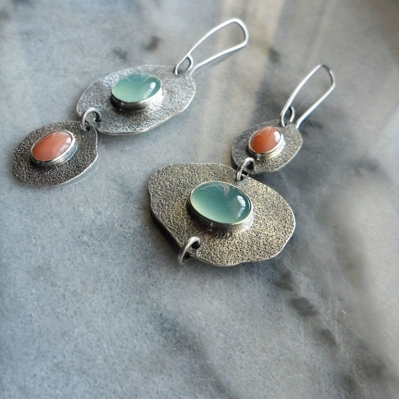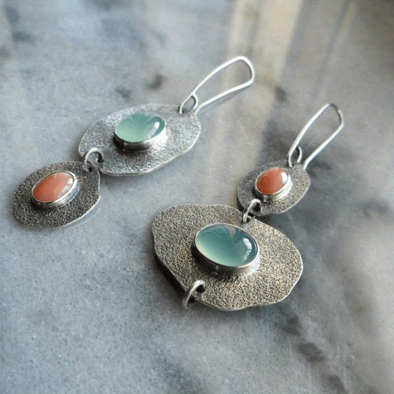 Add a touch of creativity with these unique asymmetrical earrings featuring mint green chalcedony and artificial coral. The retro design adds a vintage vibe to any outfit.