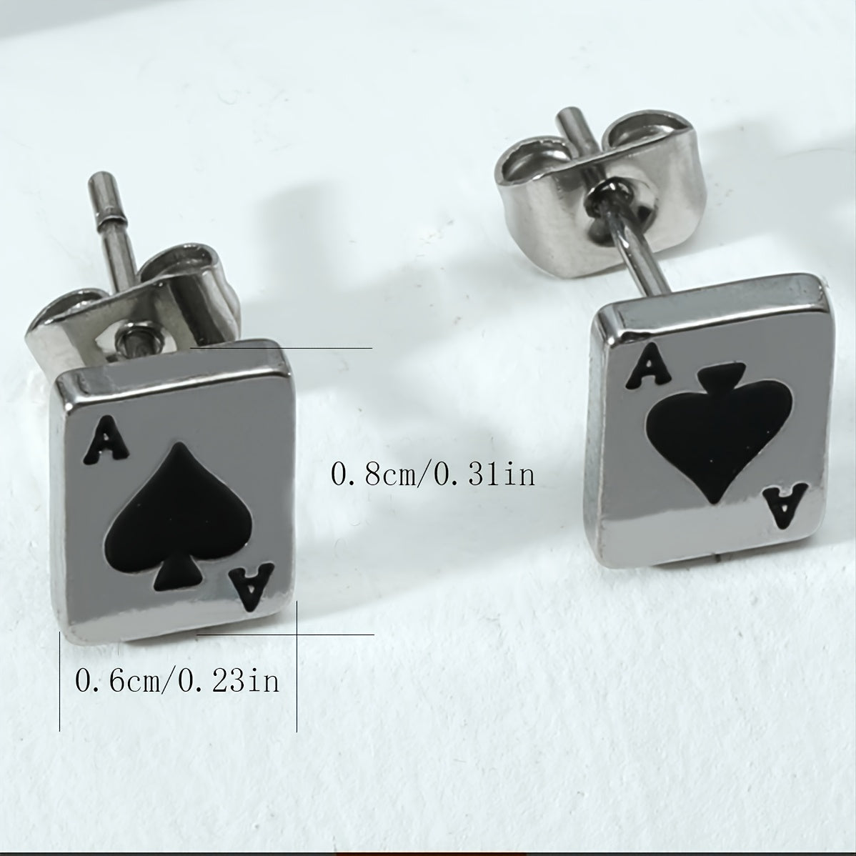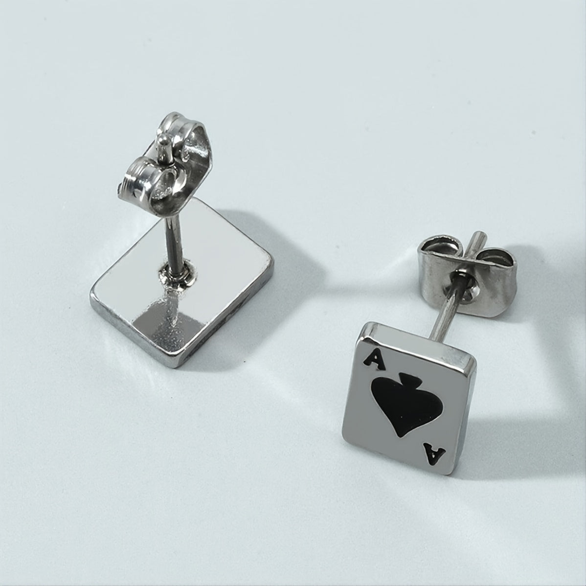These stylish stud earrings feature playing card designs, perfect for poker enthusiasts. Made for men who love to play card games with style.