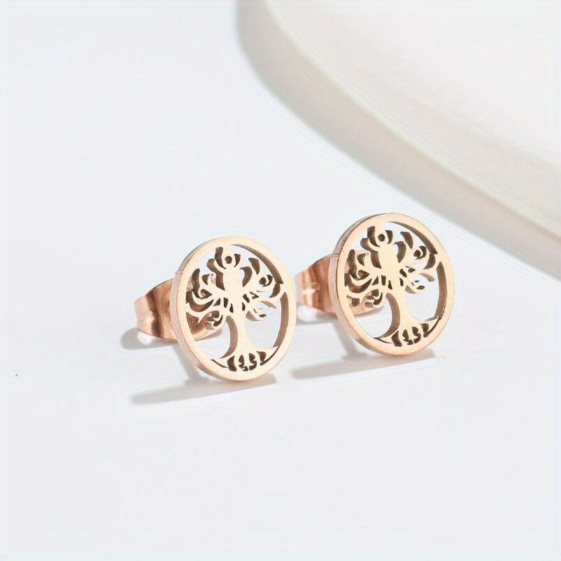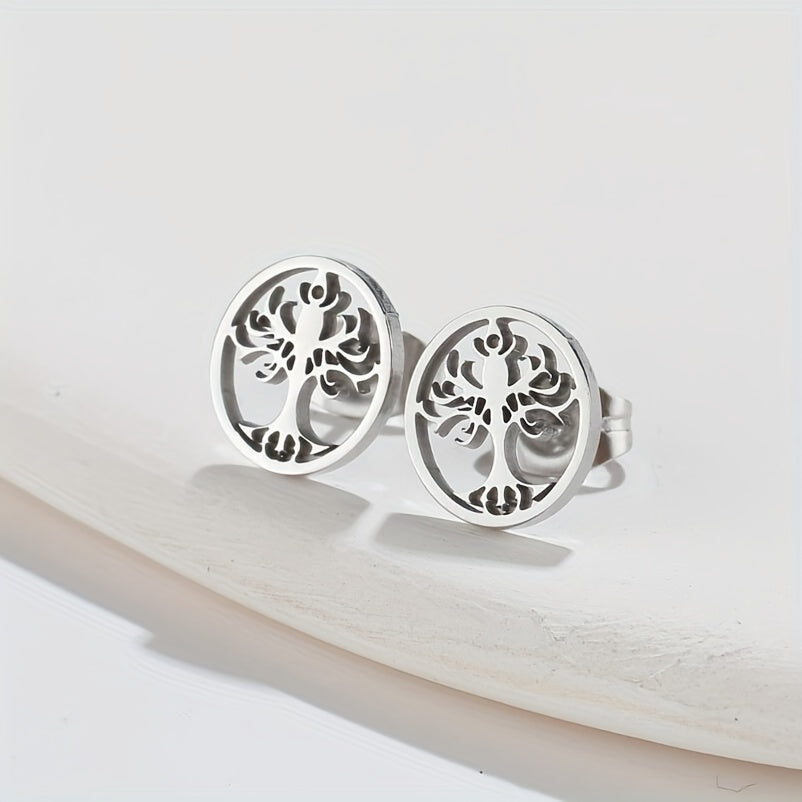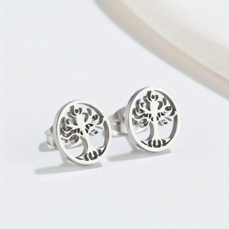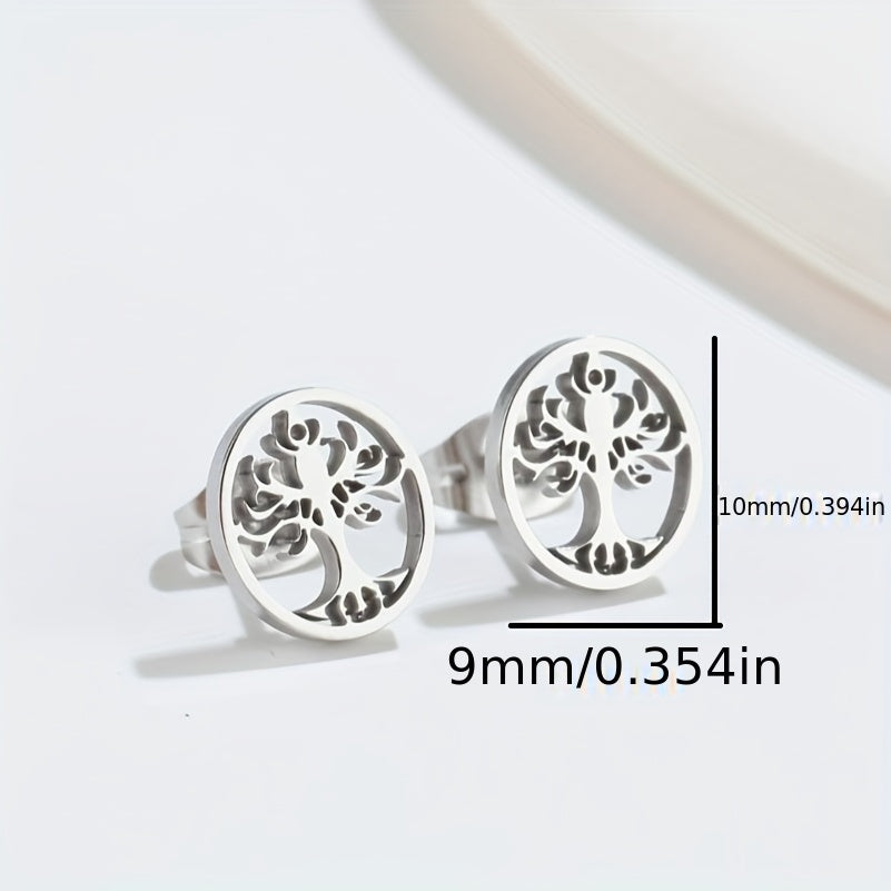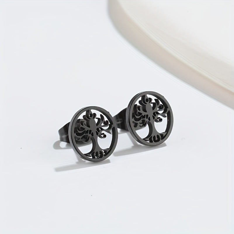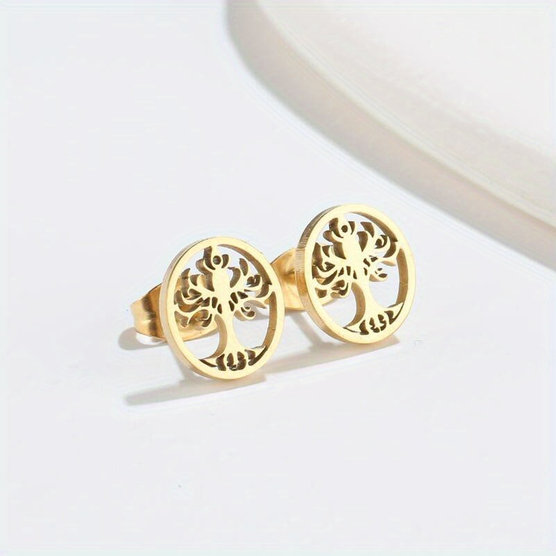 These men's stainless steel earrings feature a golden and silver hollowed-out life tree design. They are retro and round, suitable for all matching styles.