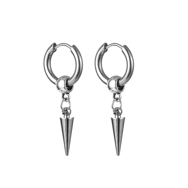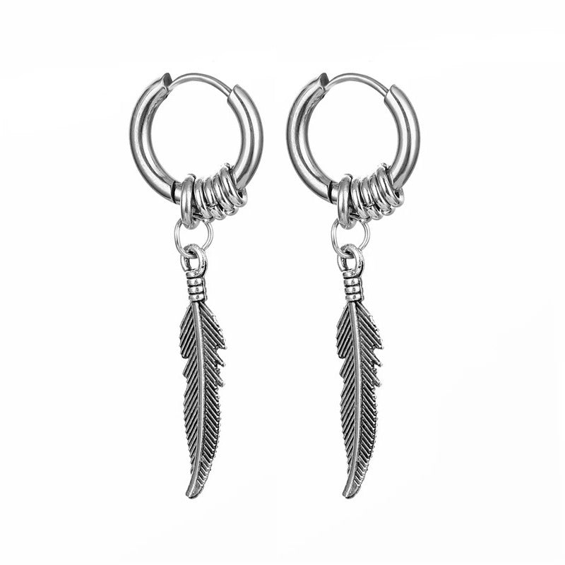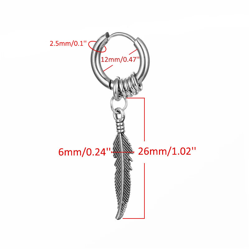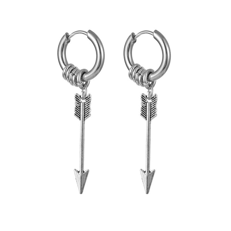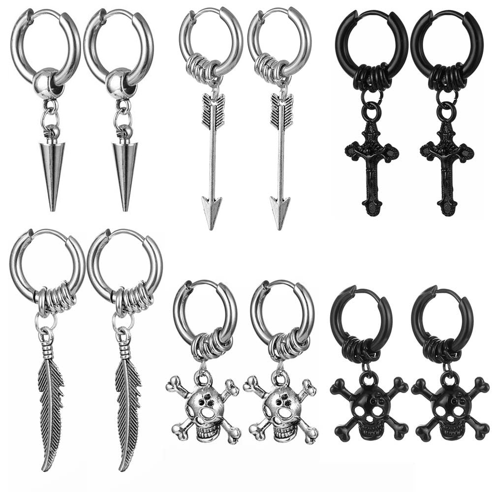 Add a stylish edge to your look with these stainless steel dangle earrings featuring arrow, cross, skull, and feather pendants on hoops.