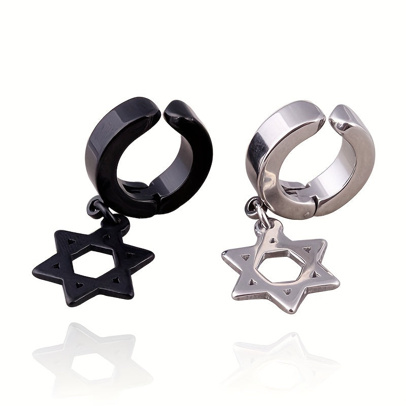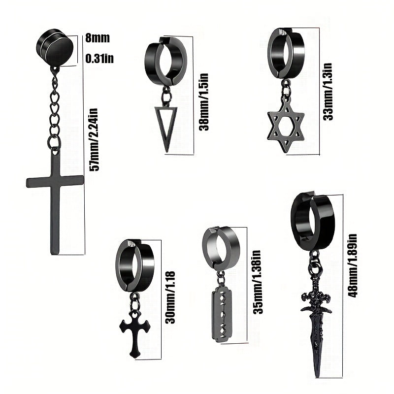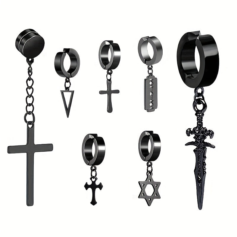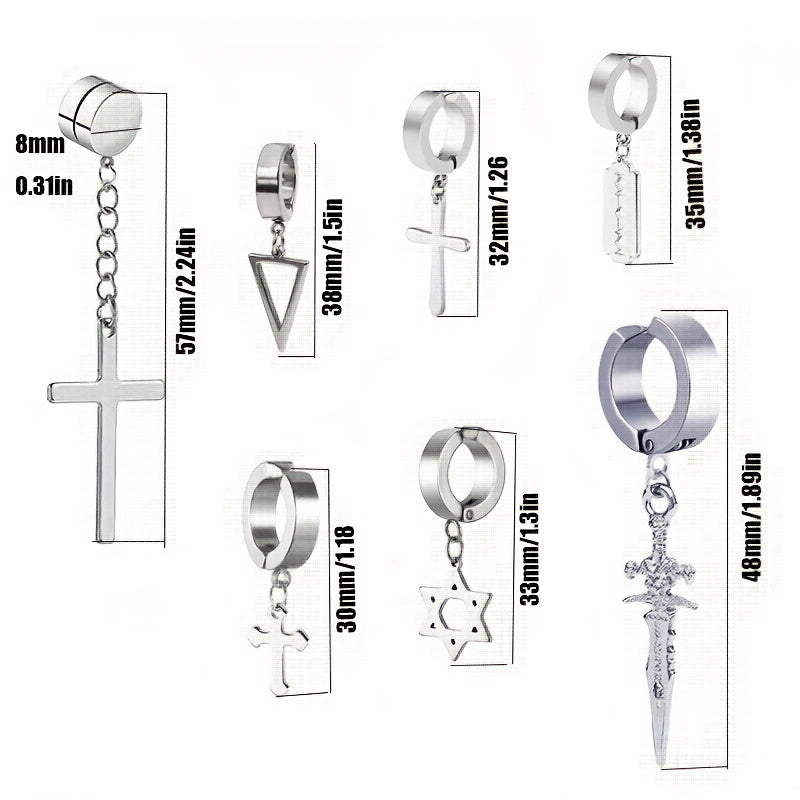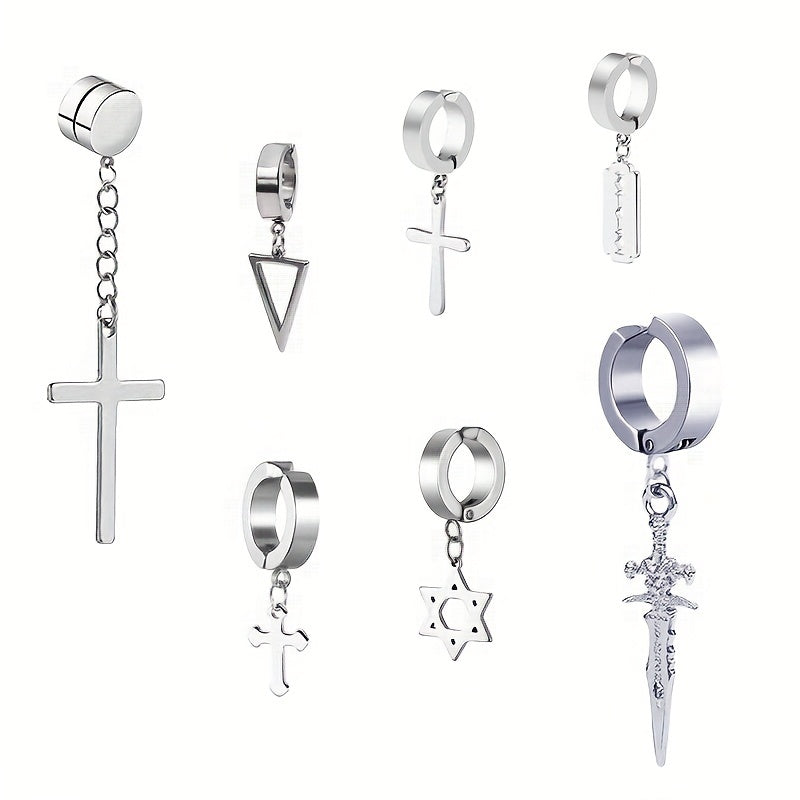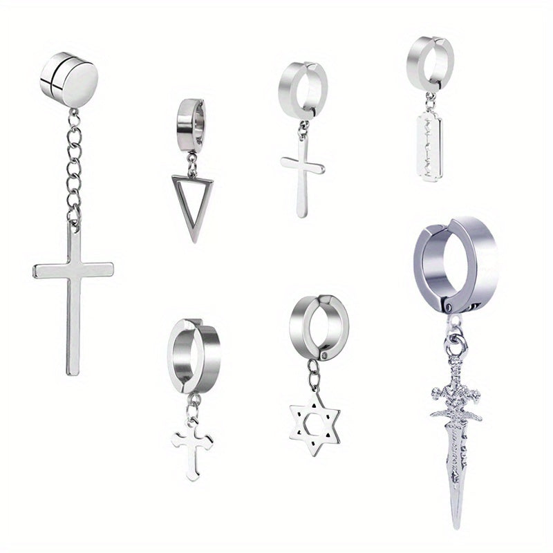 Elevate your style with this 7-piece set of fashionable men's stainless steel jewelry. Includes cross ear clip, tassel fishbone ear buckle earrings. Perfect for men without ear holes.