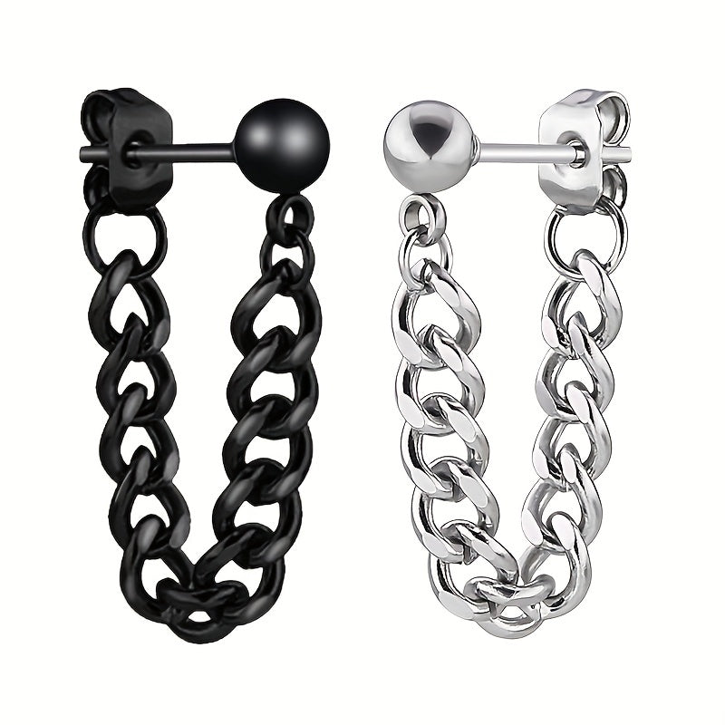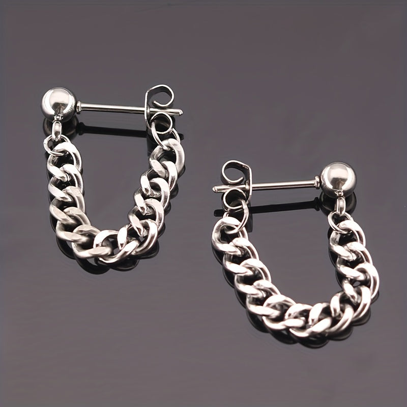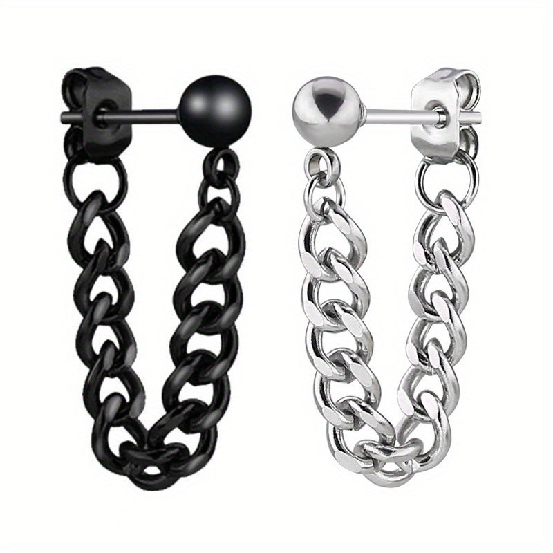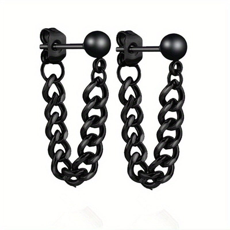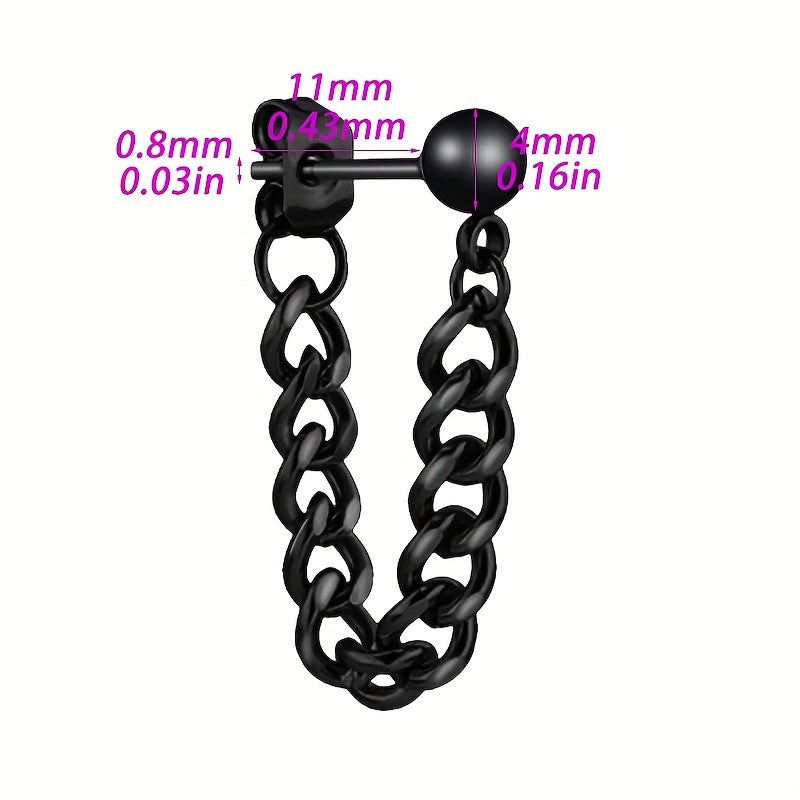 These stainless steel earrings feature a small steel ball stud design with a chain ear buckle. Perfect for everyday wear or special occasions.
