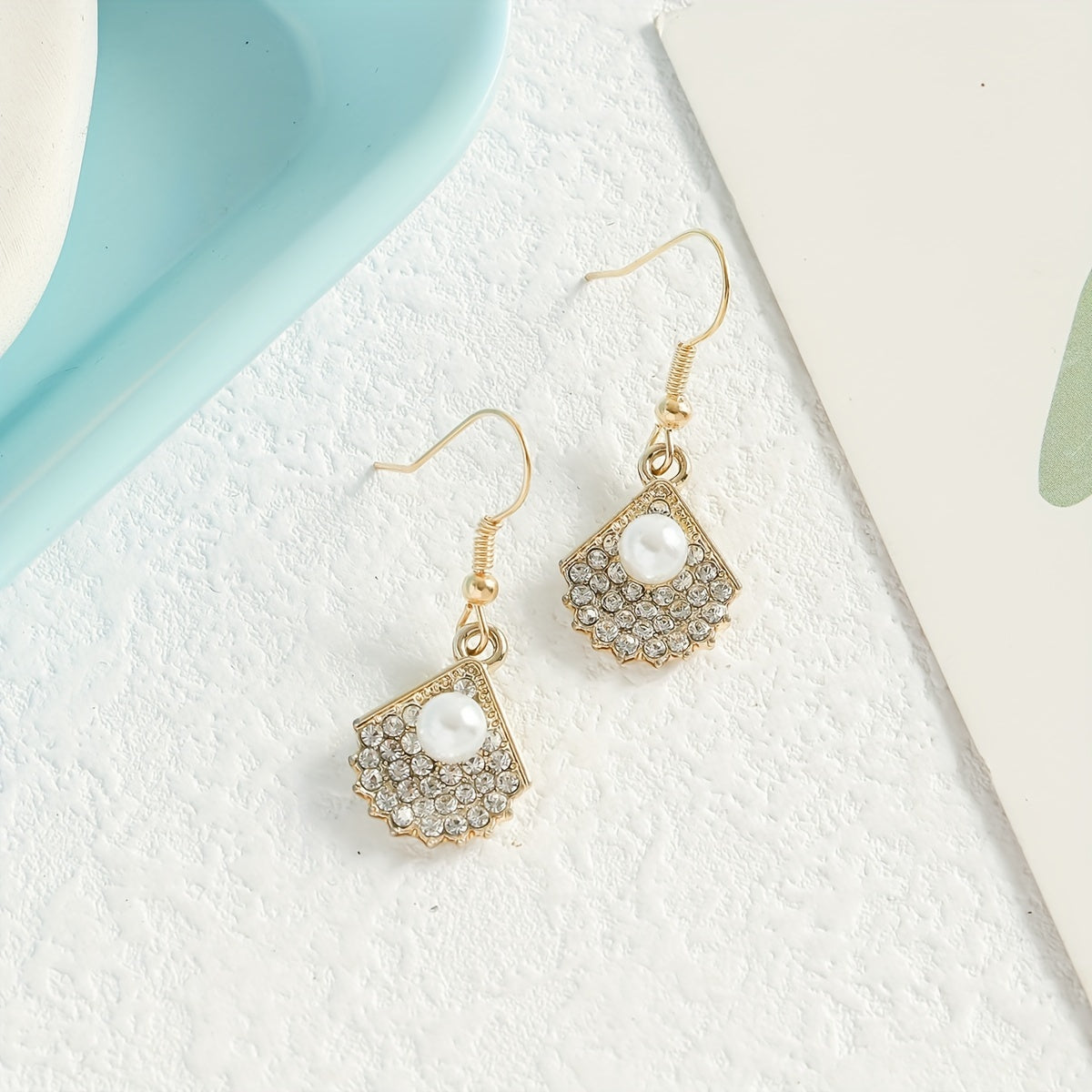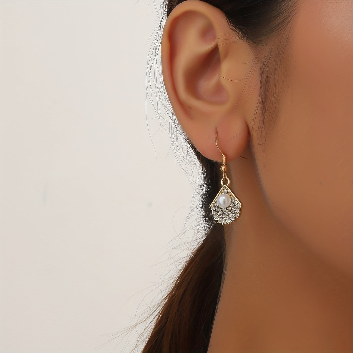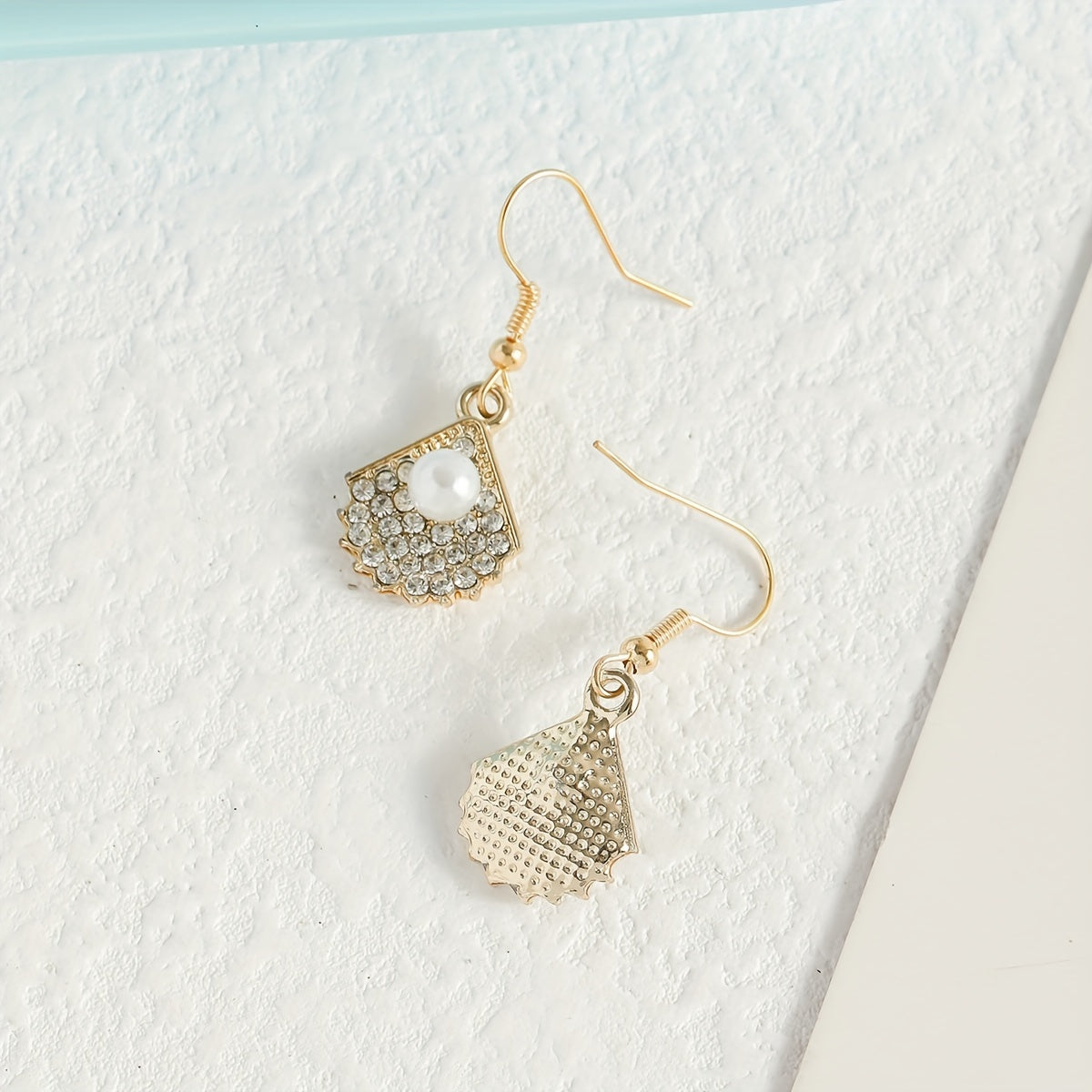 Add a touch of glamour with these sexy scallop-shaped earrings featuring sparkling rhinestones and faux pearls. Perfect for any occasion or as a gift for a special woman.