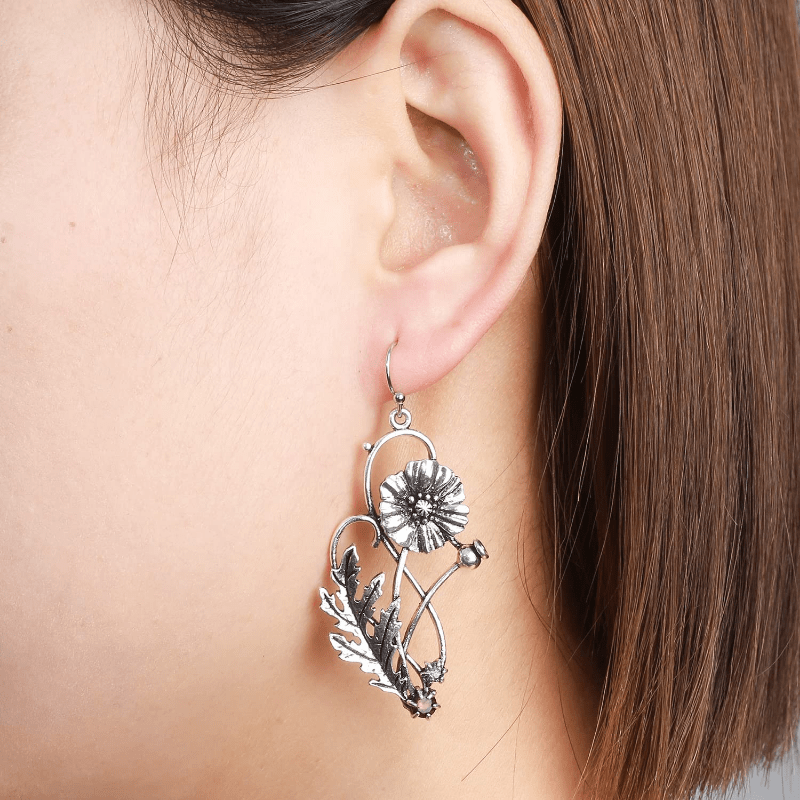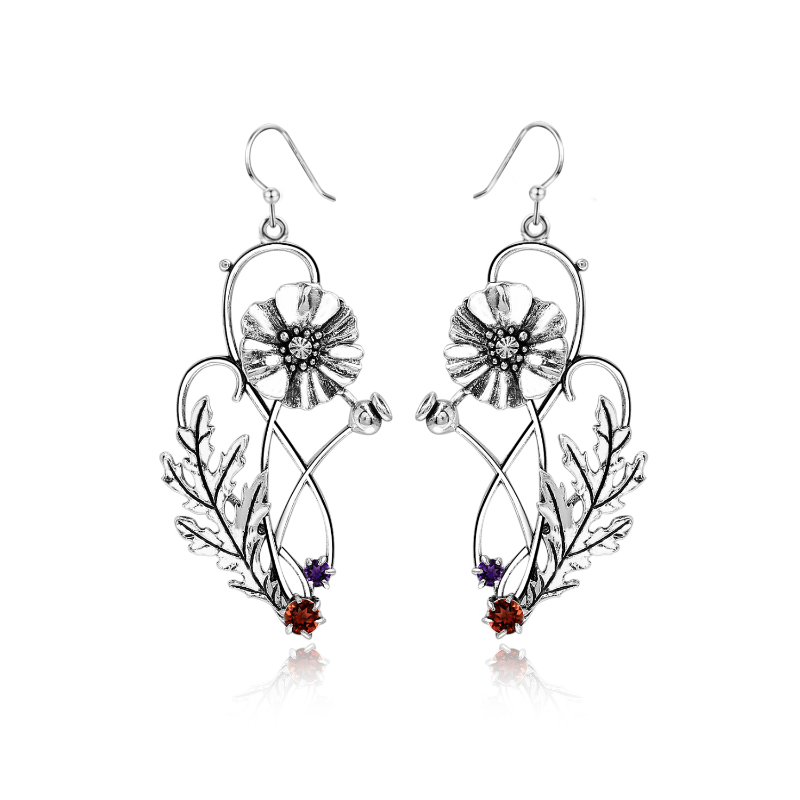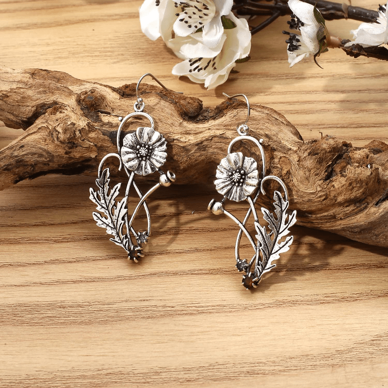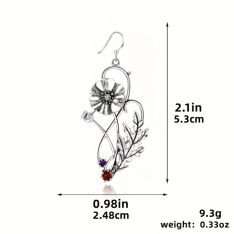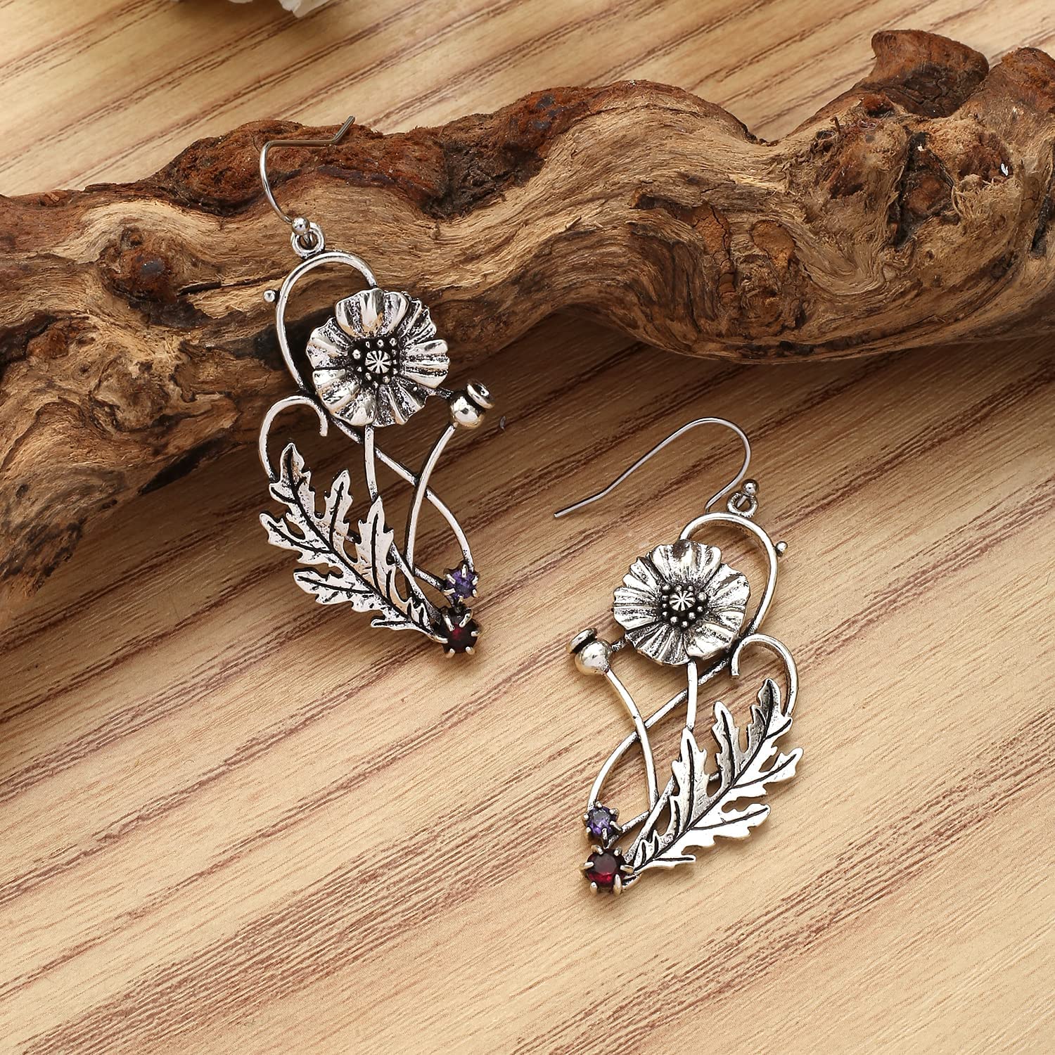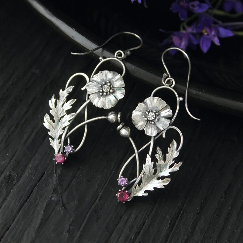 These vintage-style earrings feature a unique design with floral leaf and amethyst inlay. They are perfect for adding a statement boho touch to any outfit.