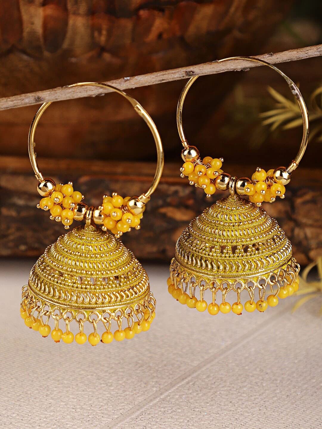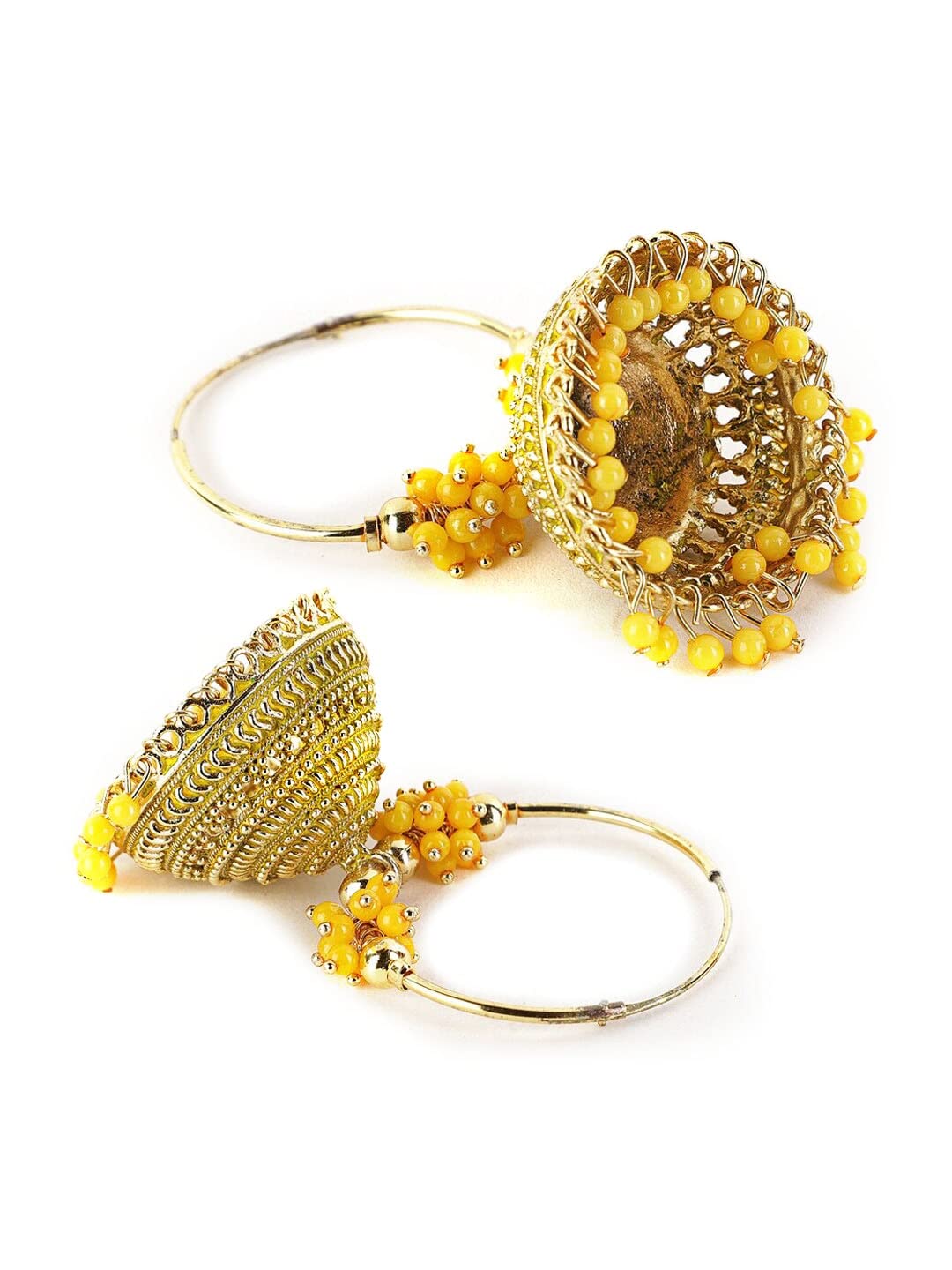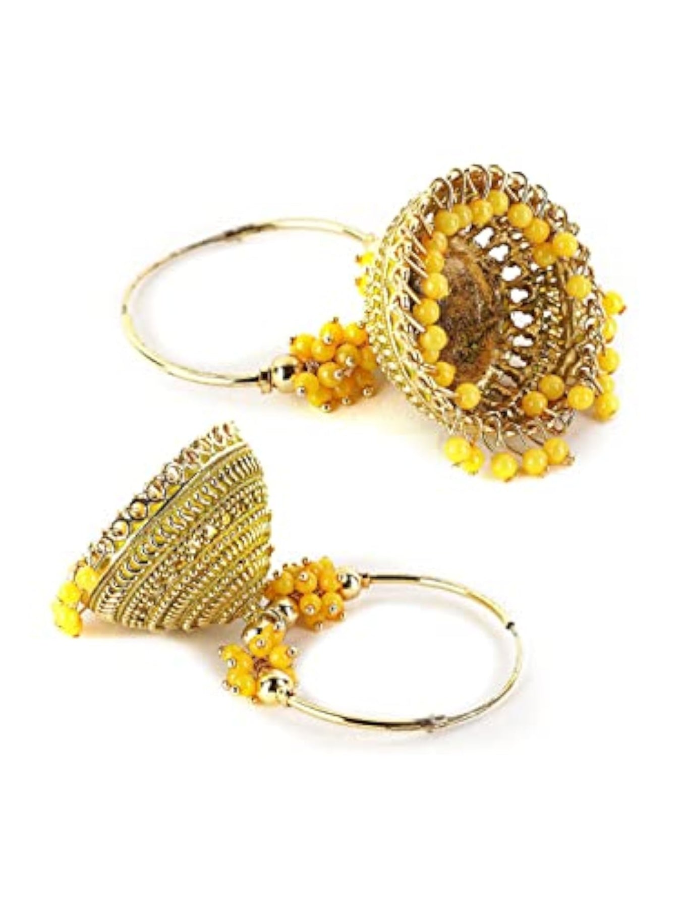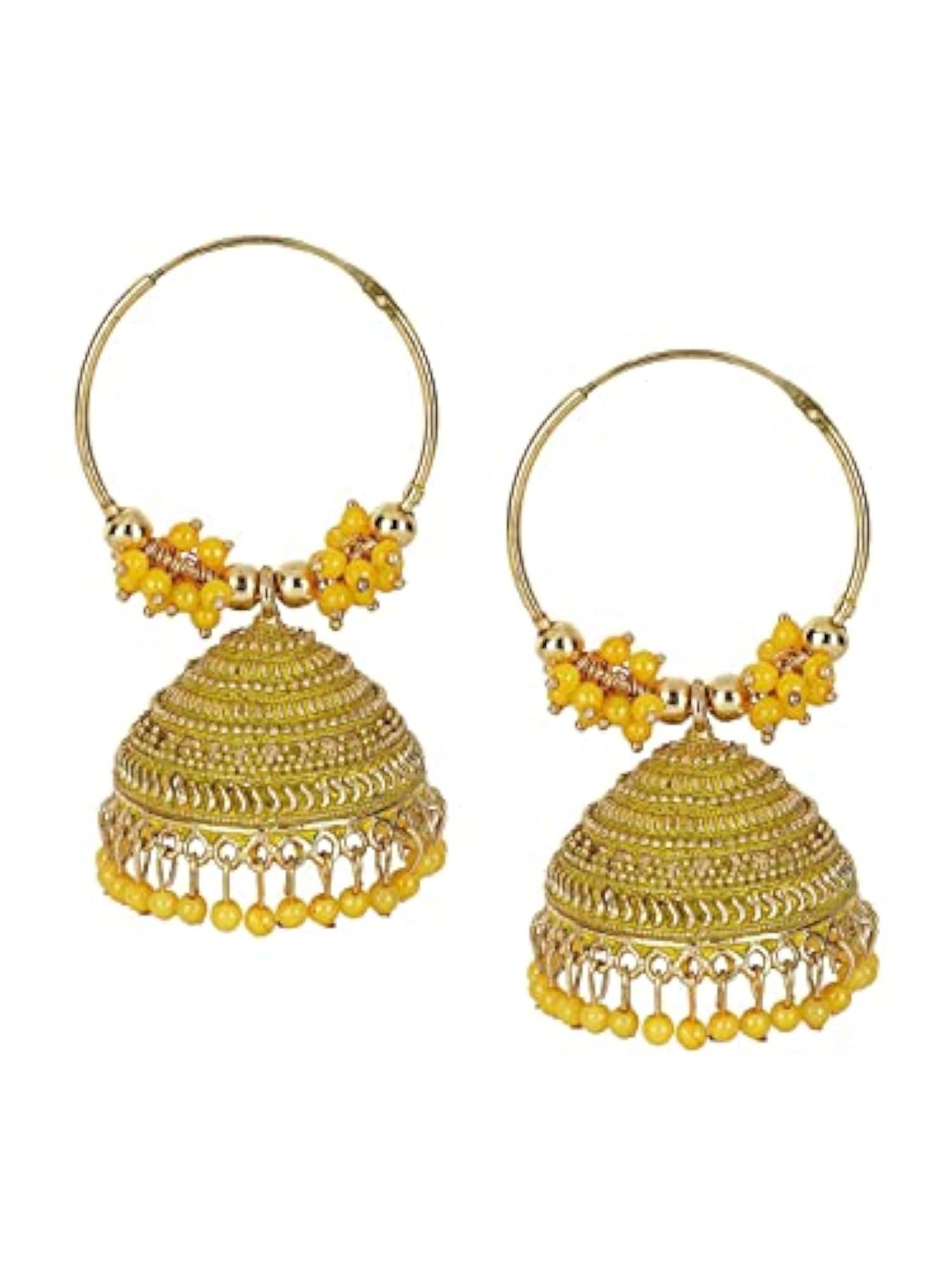 Add a touch of elegance to your look with these beautiful yellow stone jhumkas earrings. Perfect for both casual and special occasions.
