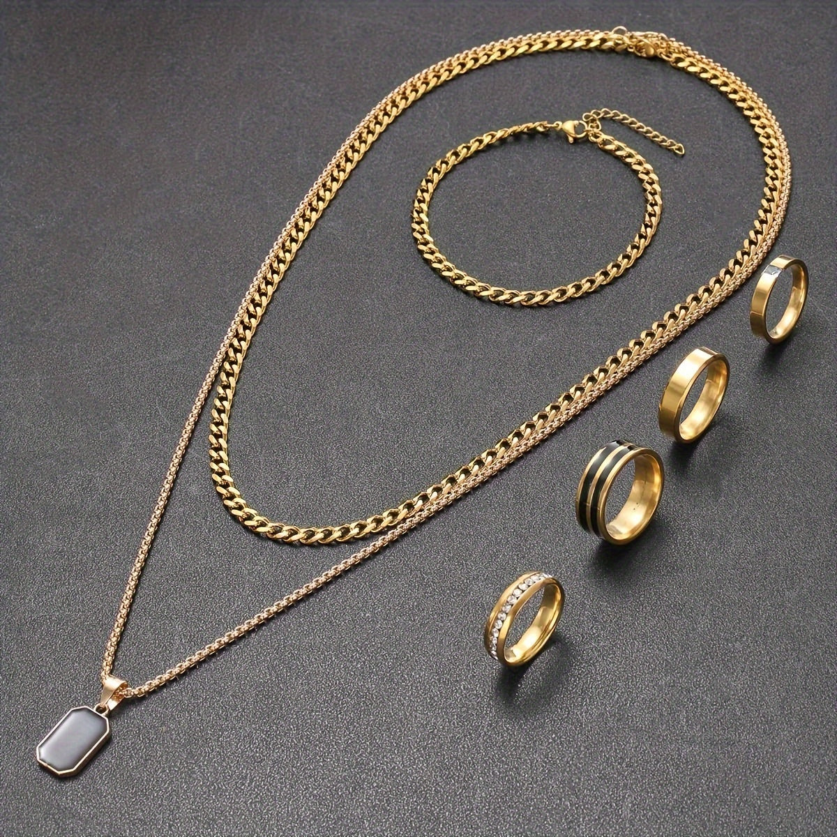 Enhance your casual style with this 7-piece jewelry set featuring synthetic zirconia. Made of durable stainless steel, this set includes bracelets, necklaces, and rings.