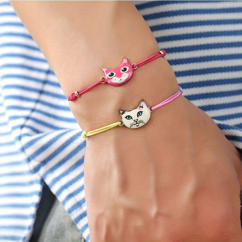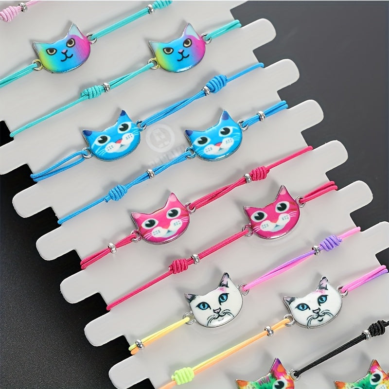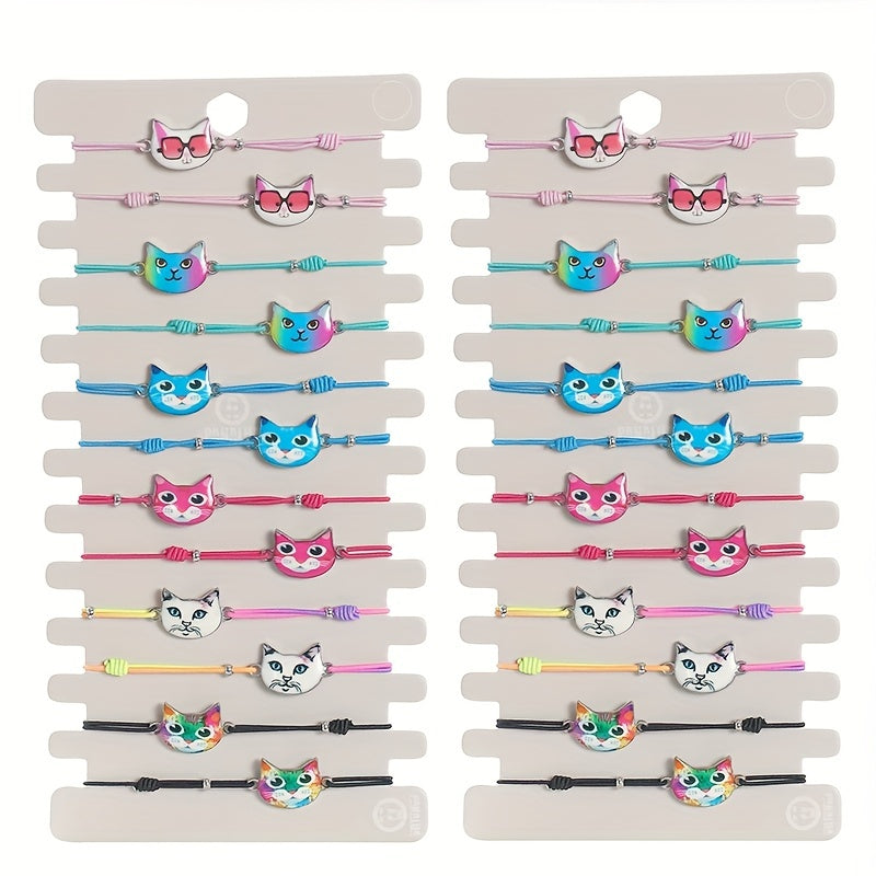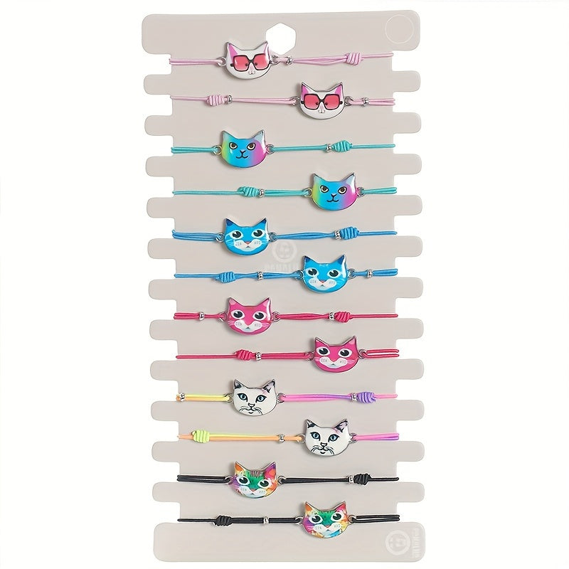 Adorable set of 12 cartoon kitten bracelets with adjustable elastic bands.