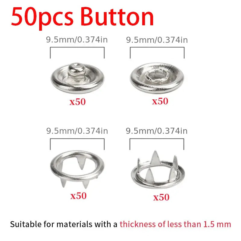 Get this set of 200 snaps with plier tool for clothing and leather projects. The kit includes hollow and solid metal buttons in 9.5mm size with pointed ends.