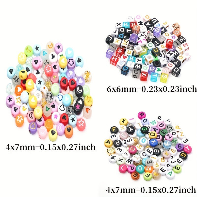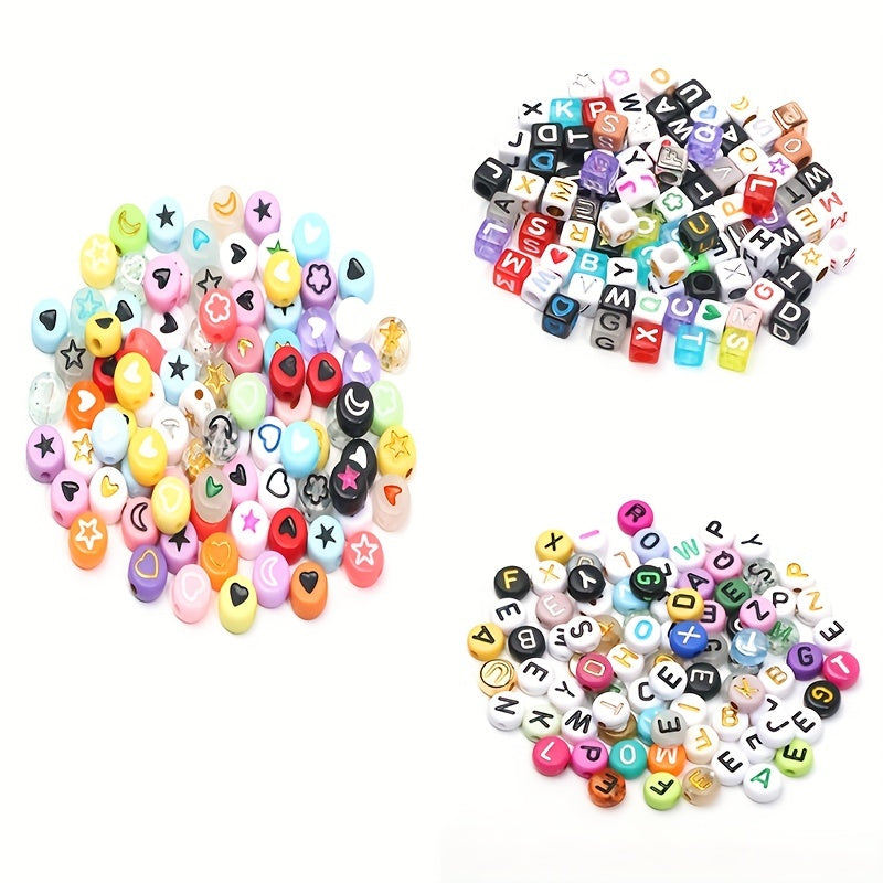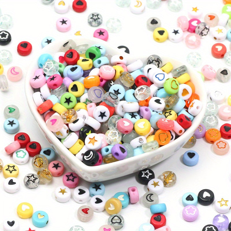 This 20g pack of acrylic beads features random 4x7 and 6x6mm sizes with letter, star, and moon patterns. Ideal for creating children's jewelry, bracelets, necklaces, and hair clip accessories.