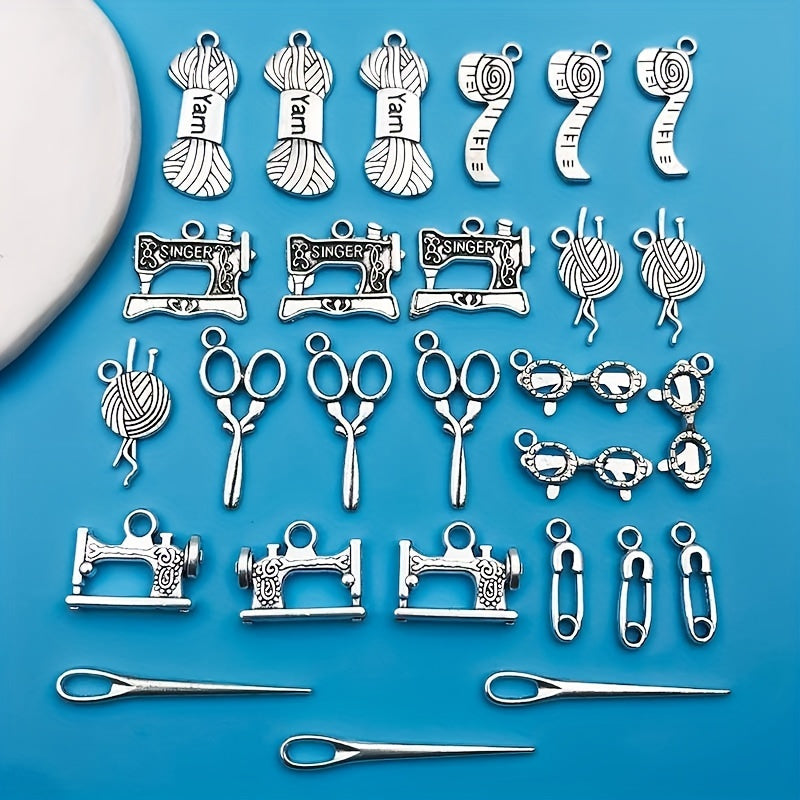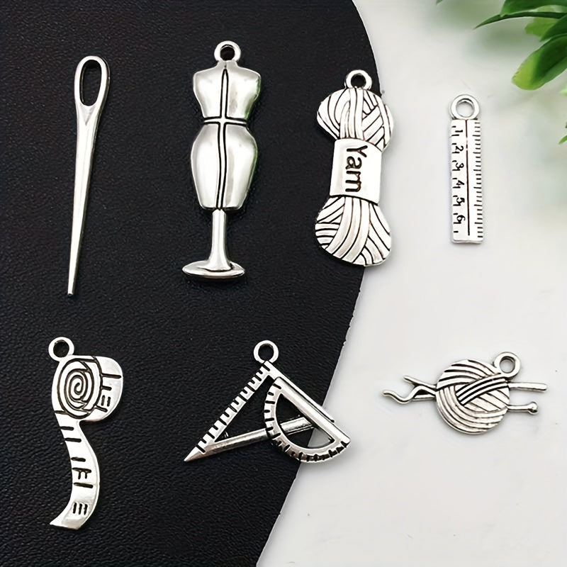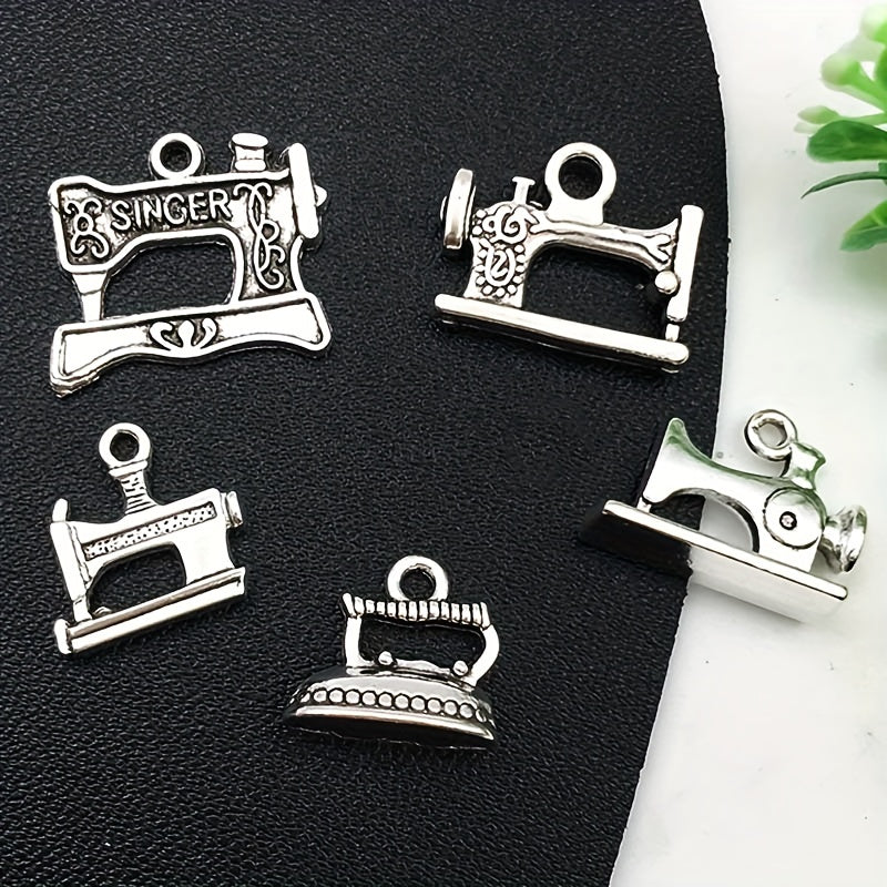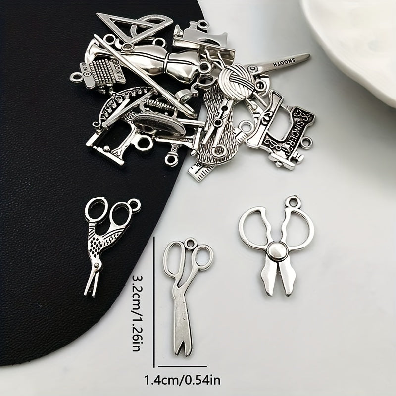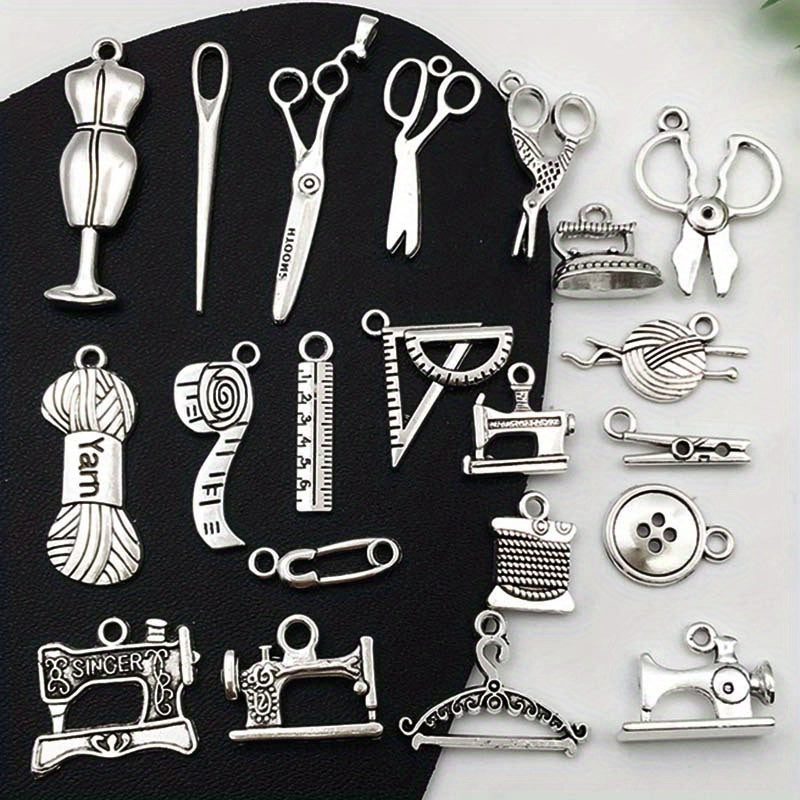 This set includes 21 pieces of zinc alloy pendants in antique silvery finish, featuring sewing machine, cutting machines, scissors, and needle shapes. Perfect for creating DIY necklaces, bracelets, and earrings.