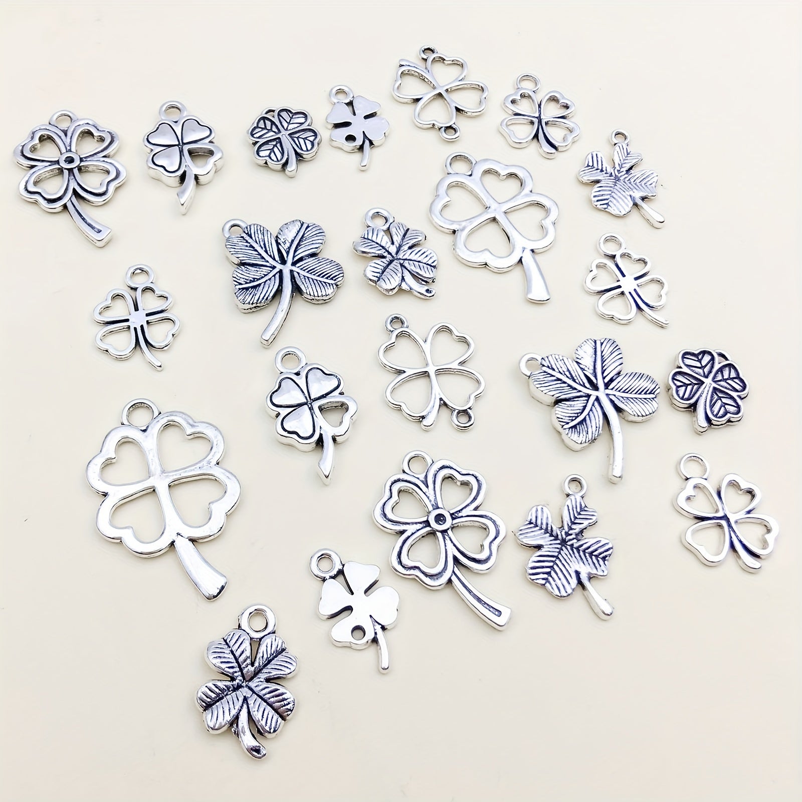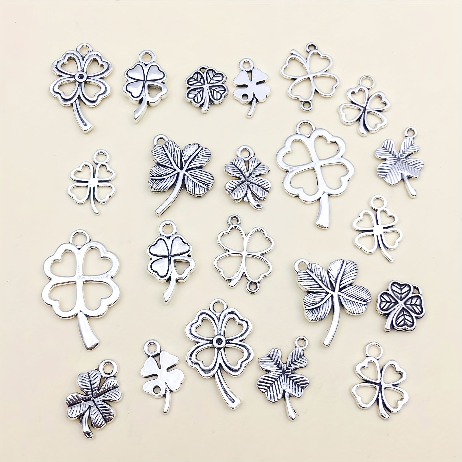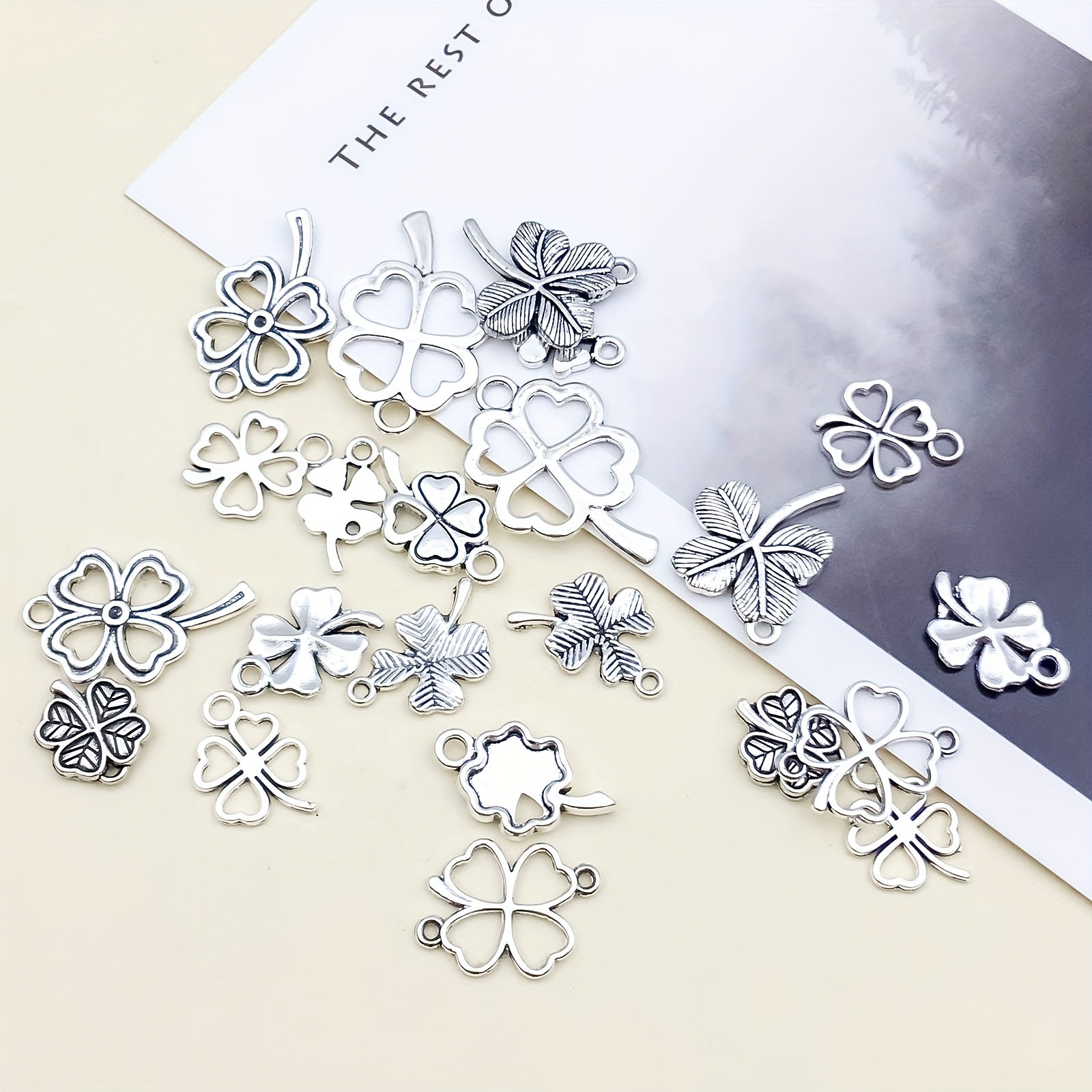 This set includes 22 randomly mixed zinc alloy antique silvery clover leaf shape charms pendants suitable for jewelry making projects.