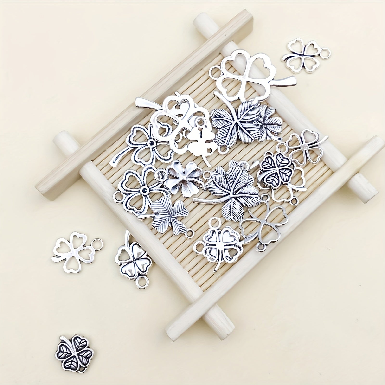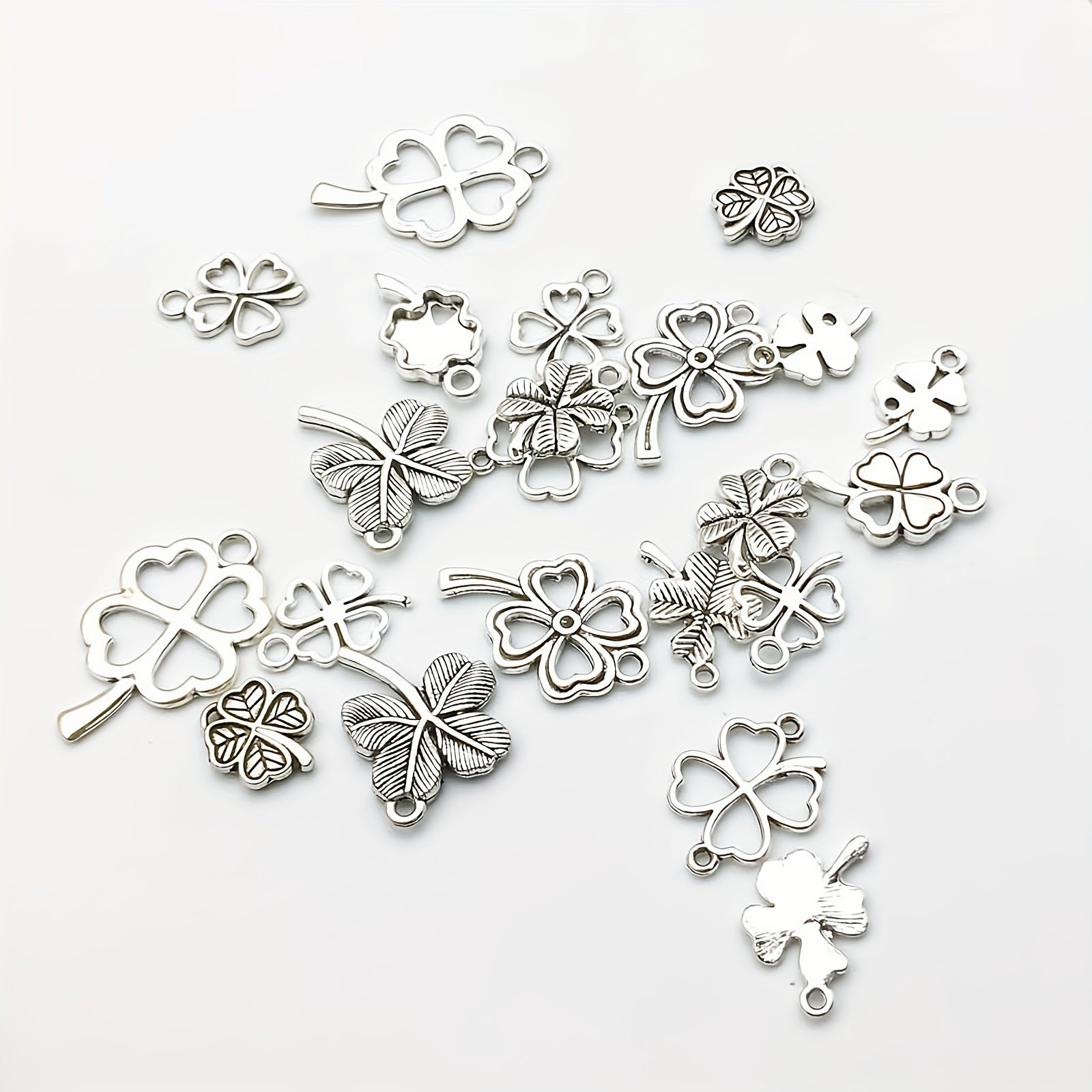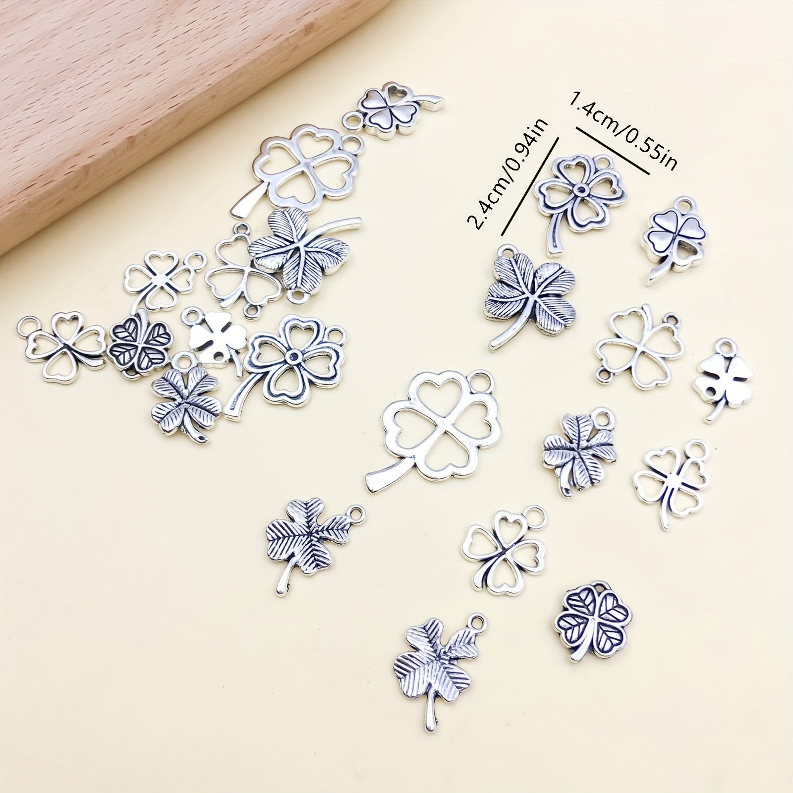 This set includes 22 randomly mixed zinc alloy antique silvery clover leaf shape charms pendants suitable for jewelry making projects.