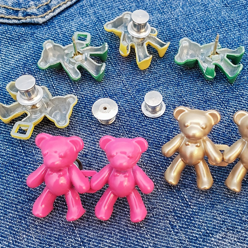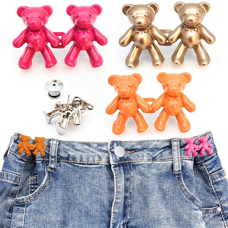 This set includes 2 bear-shaped waist buckles that can be easily attached to jeans and pants to adjust the waist size without sewing. The metal waist buckle clips securely in place to provide a comfortable fit.