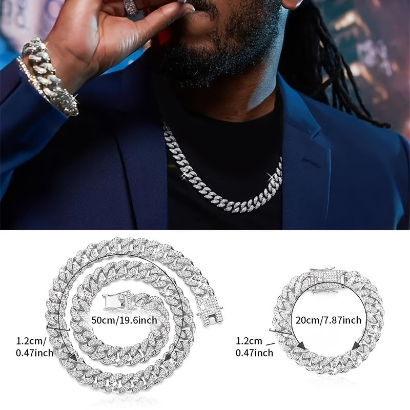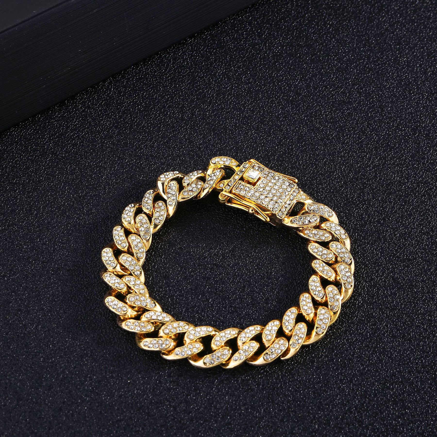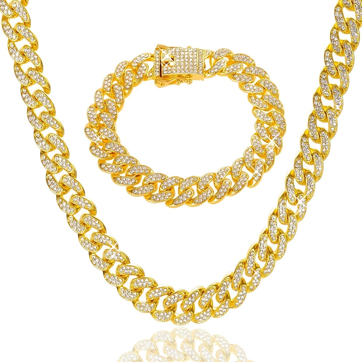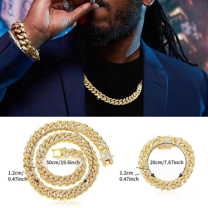 Embrace European and American street culture with this big golden chain set adorned with artificial diamonds. Perfect for hip hop enthusiasts.