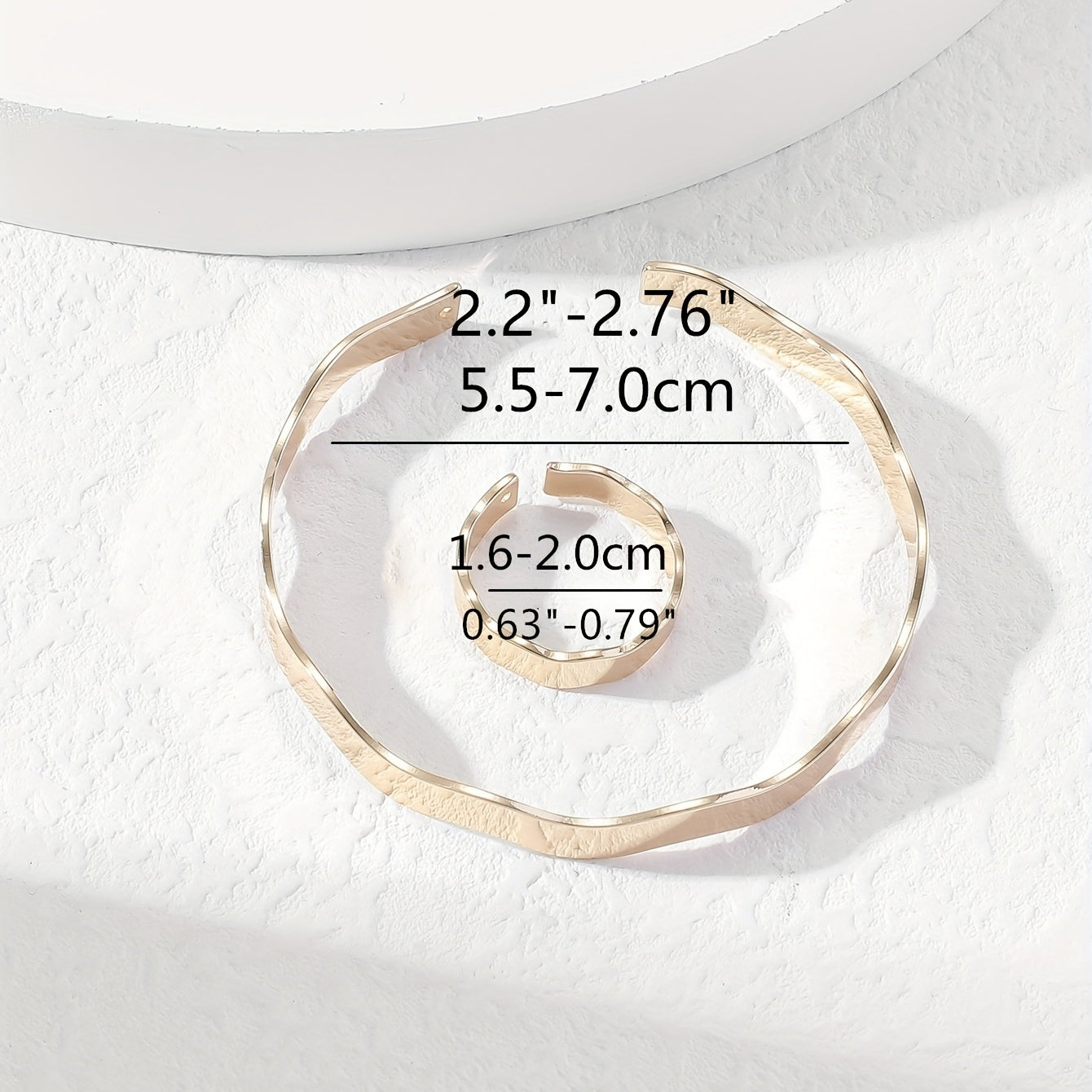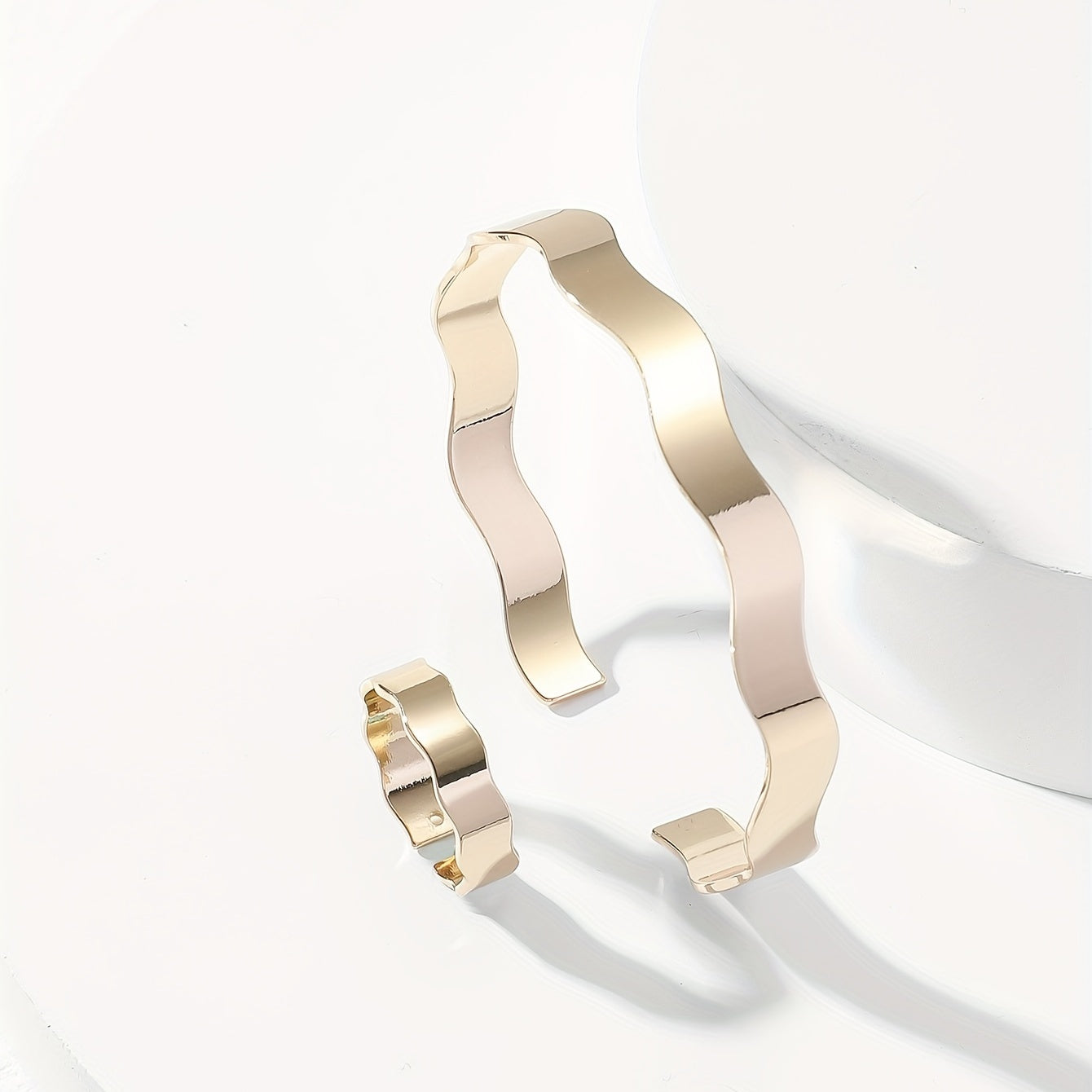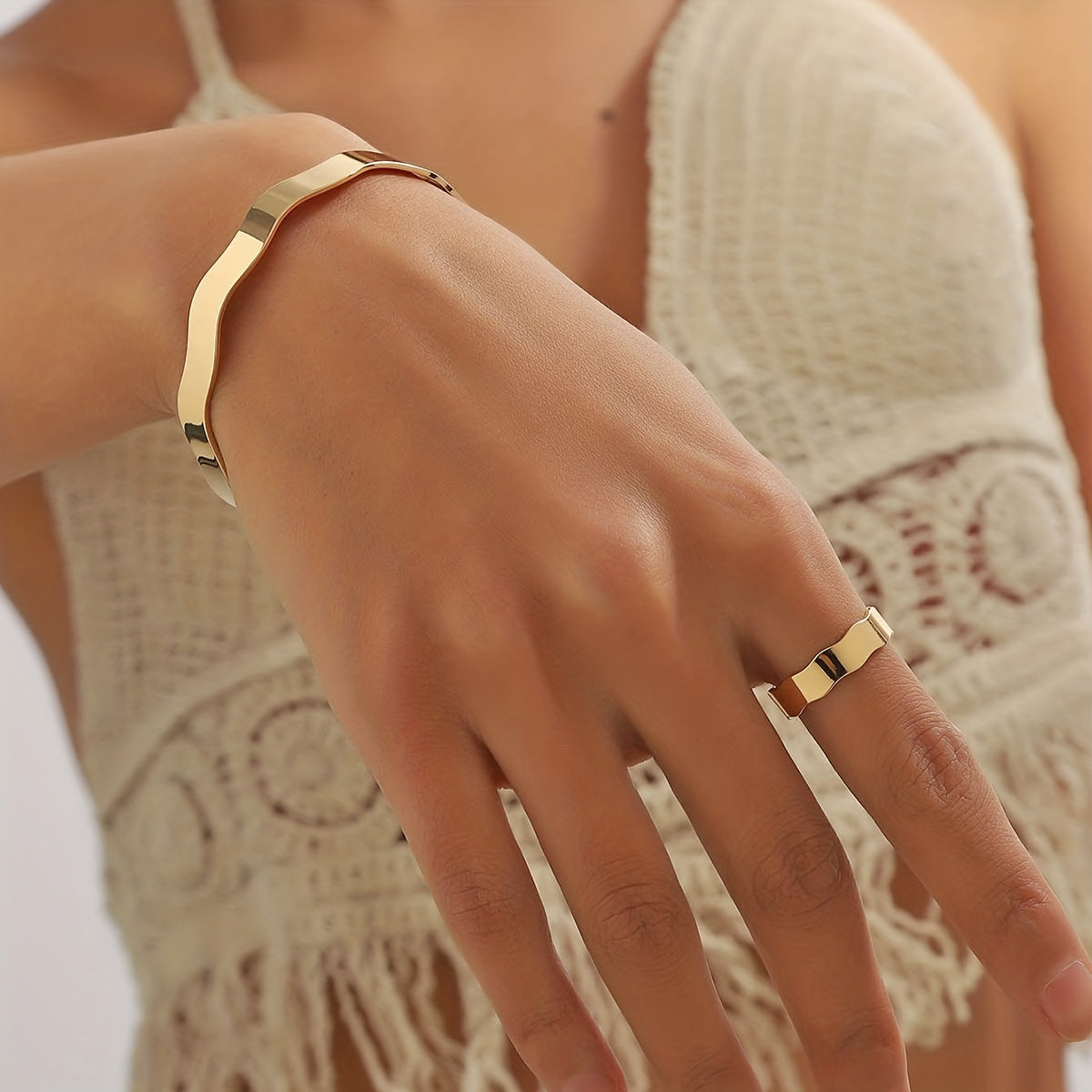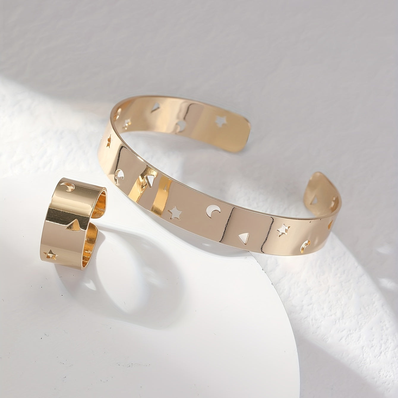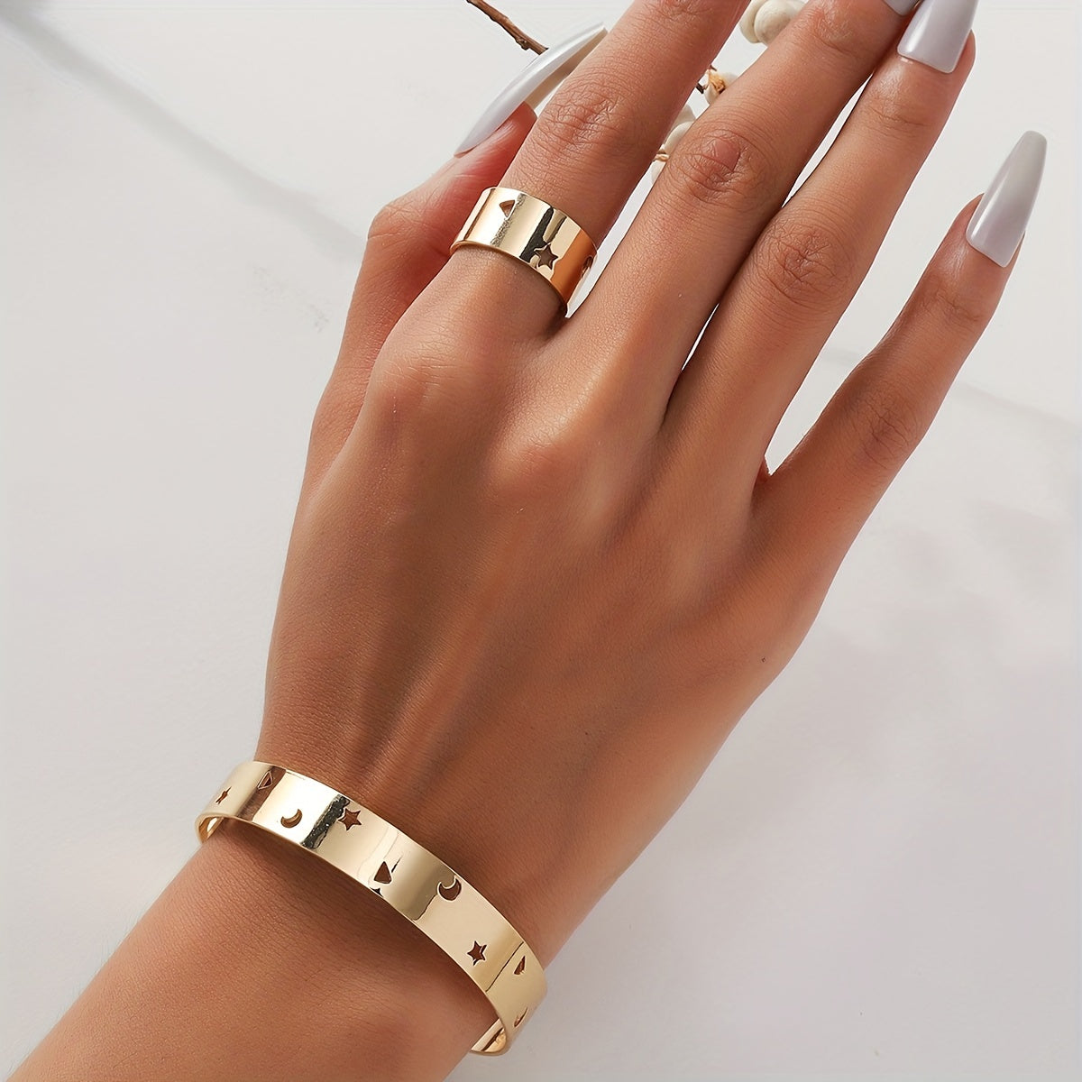 Elevate your style with this stunning jewelry set. The 18k plated rings and bracelets feature a wide wave design or hallow moon and star motifs. Perfect for adding a touch of elegance to your daily outfits or as a special gift for girls.