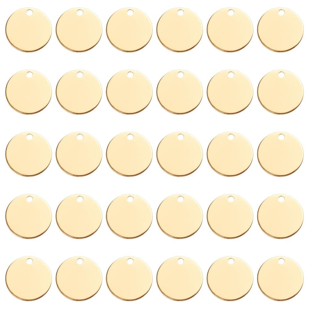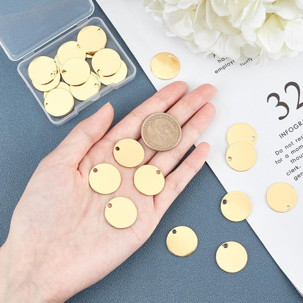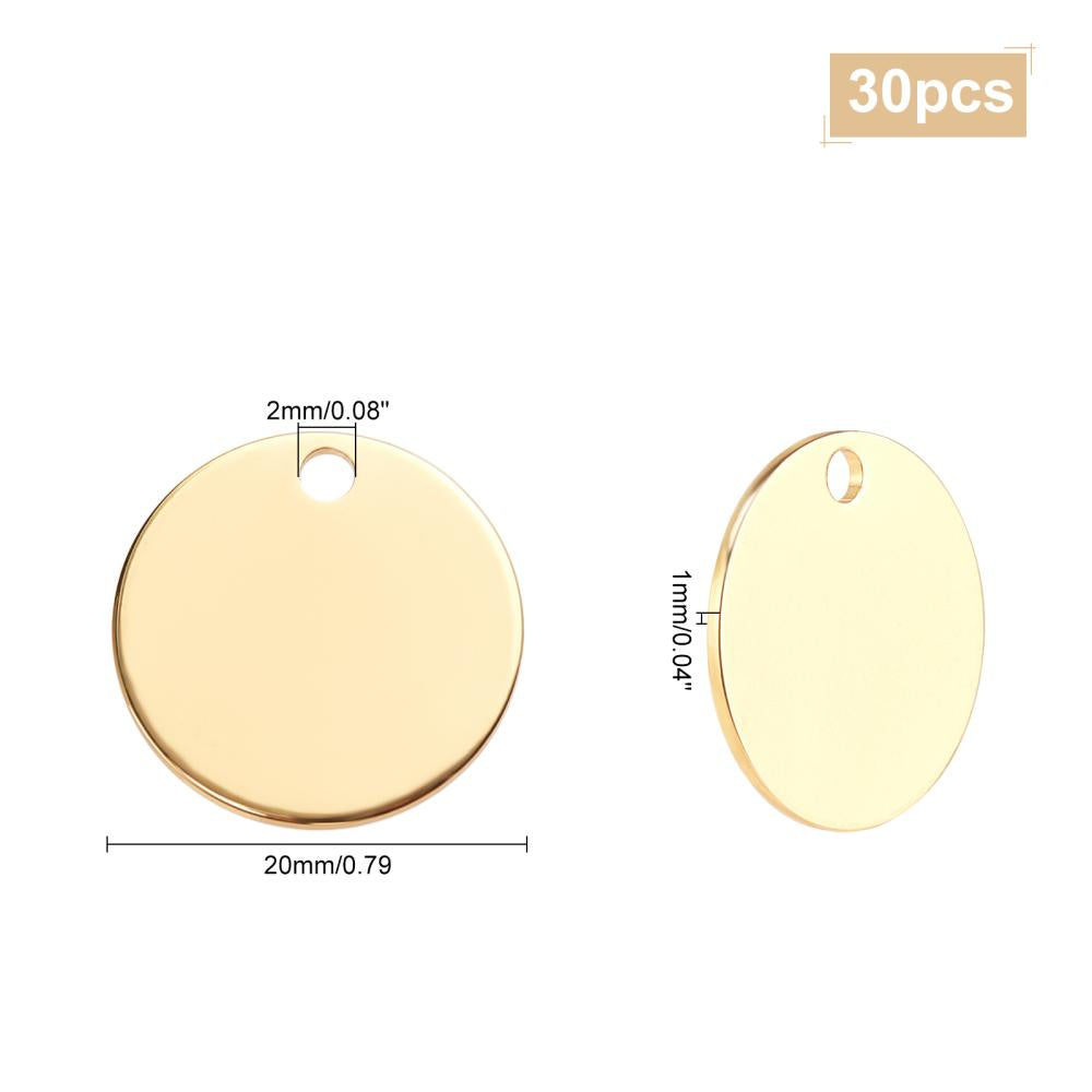 Get a pack of 30 flat round golden brass pendants with a 20x1mm size and a 2mm hole. Perfect for stamping or creating personalized tags.