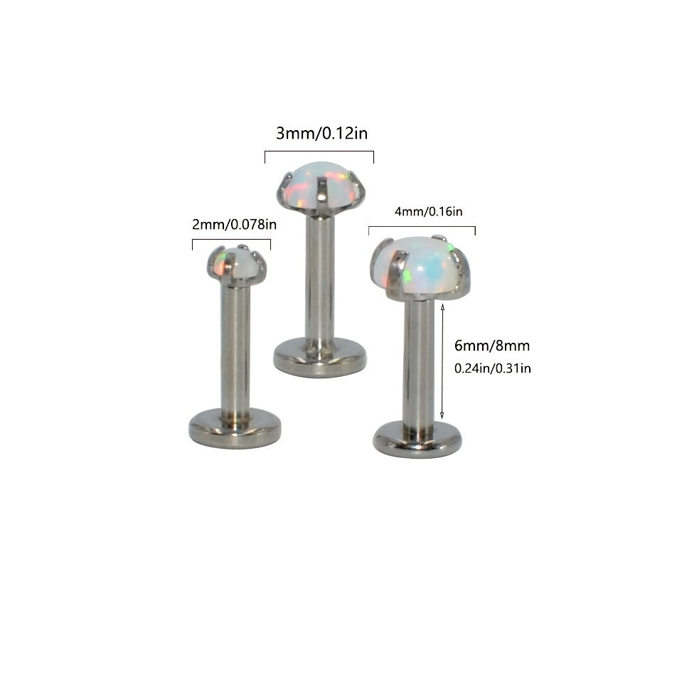 Upgrade your ear or lip piercings with this set of 3 internally threaded prong round opal zircon labret studs. Perfect for tragus, cartilage, and lip piercings.