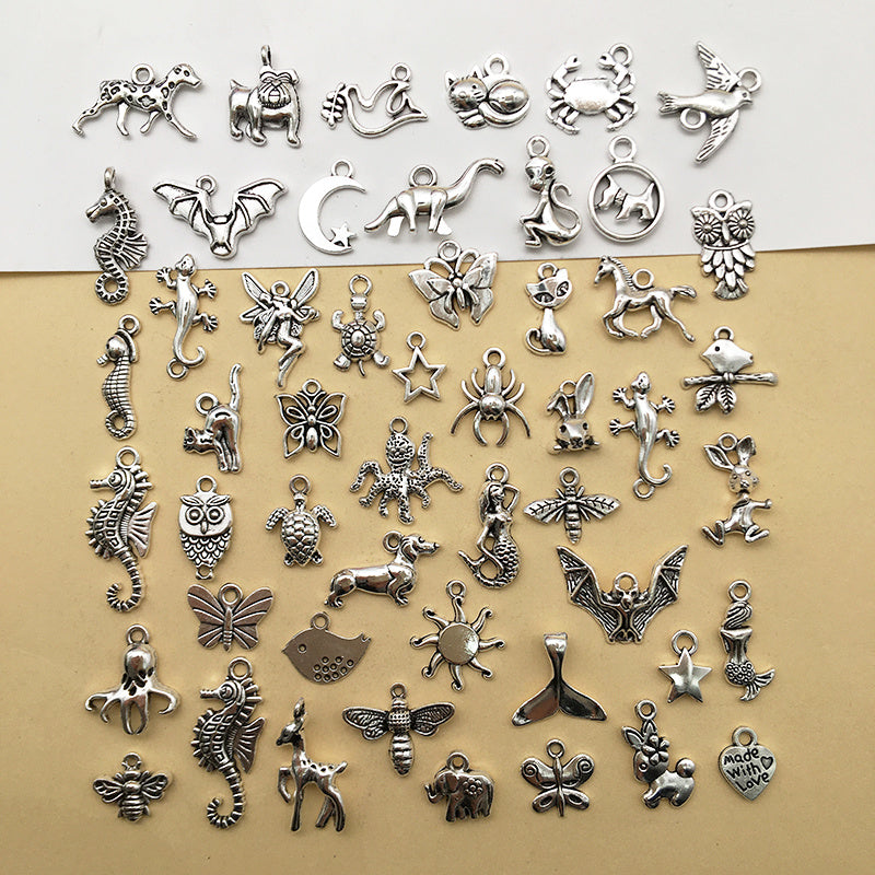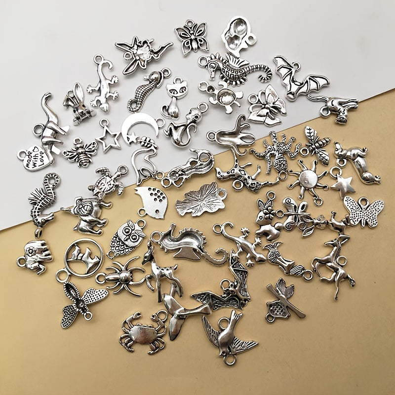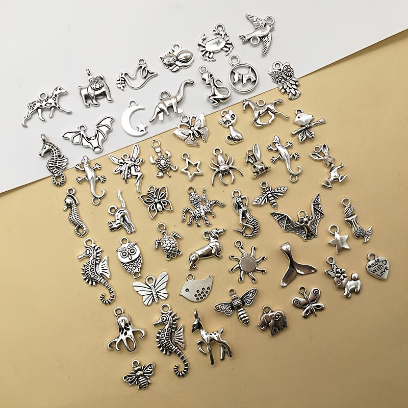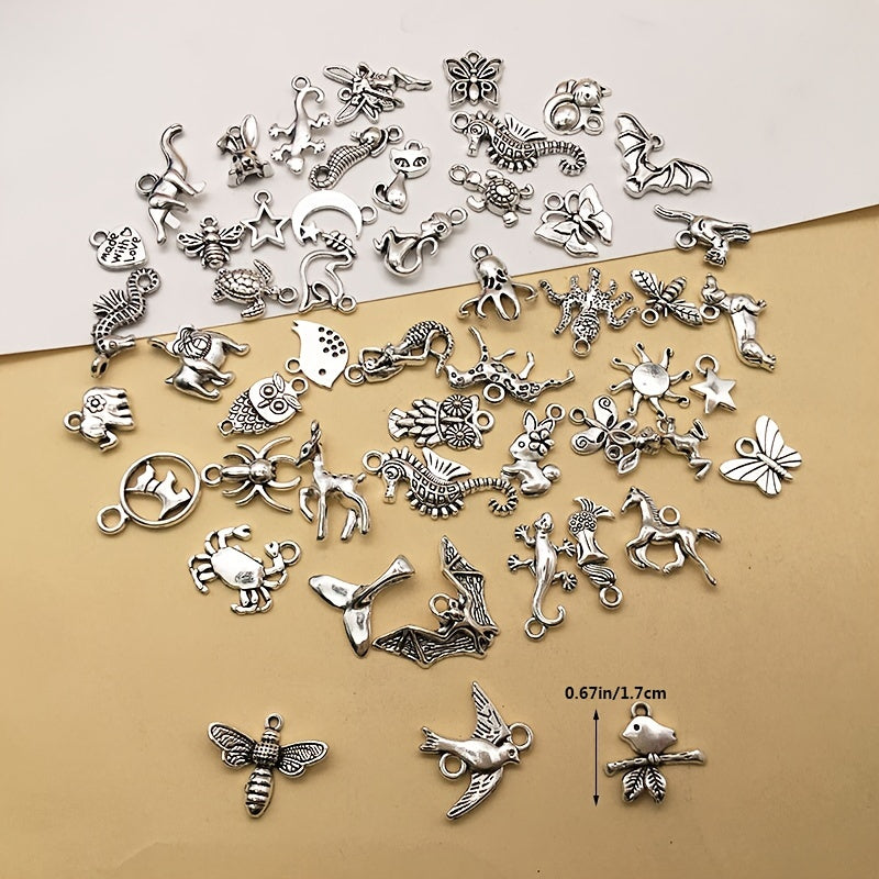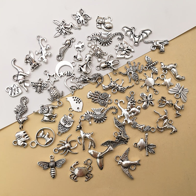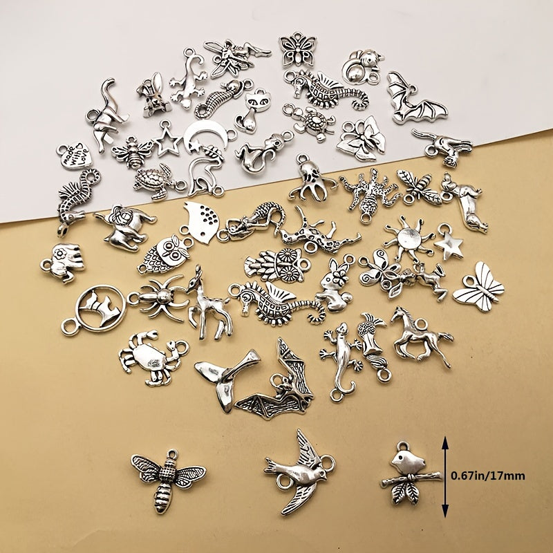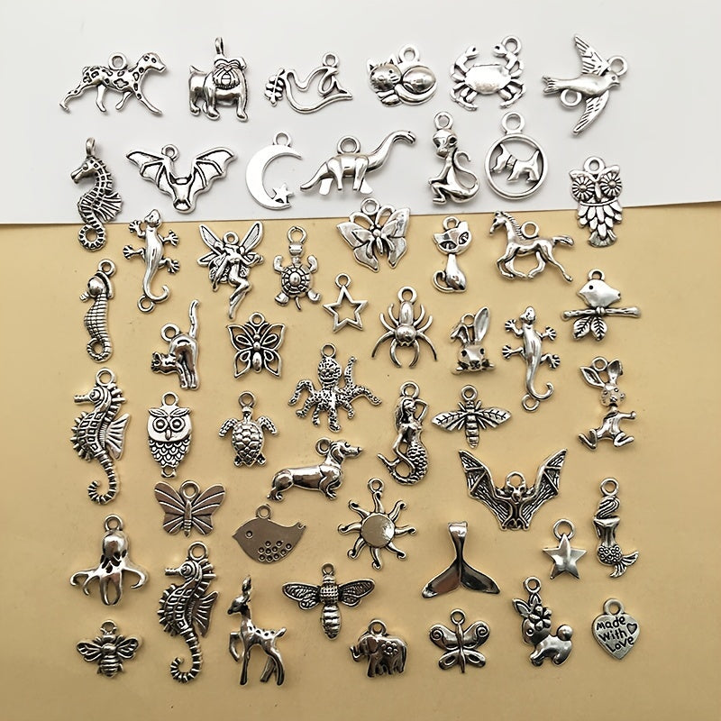 This set includes 50 zinc alloy charms in antique silver finish with a mix of animal shapes, perfect for adding to your DIY jewelry projects. Each charm is ideal for necklaces, bracelets, and other handmade accessories.