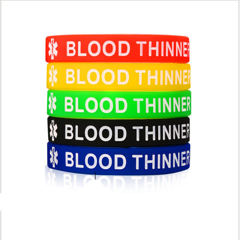This set includes 5 silicone bracelets designed for men with blood thinners. Each bracelet features a medical emergency alert ID.