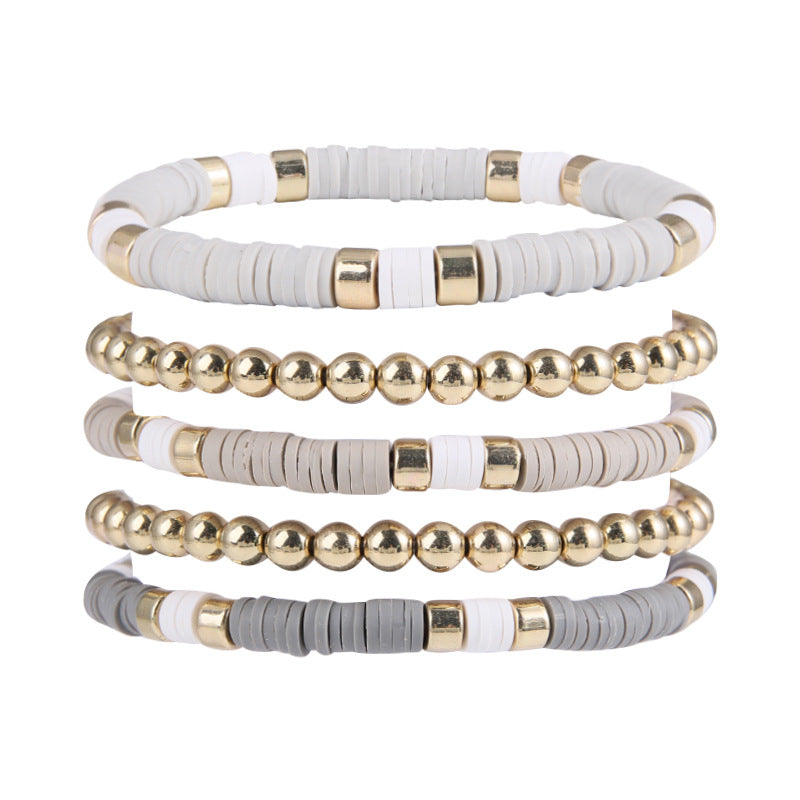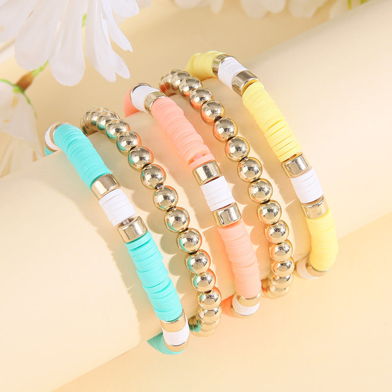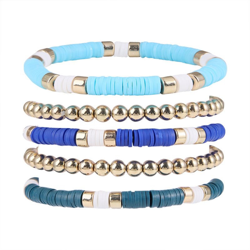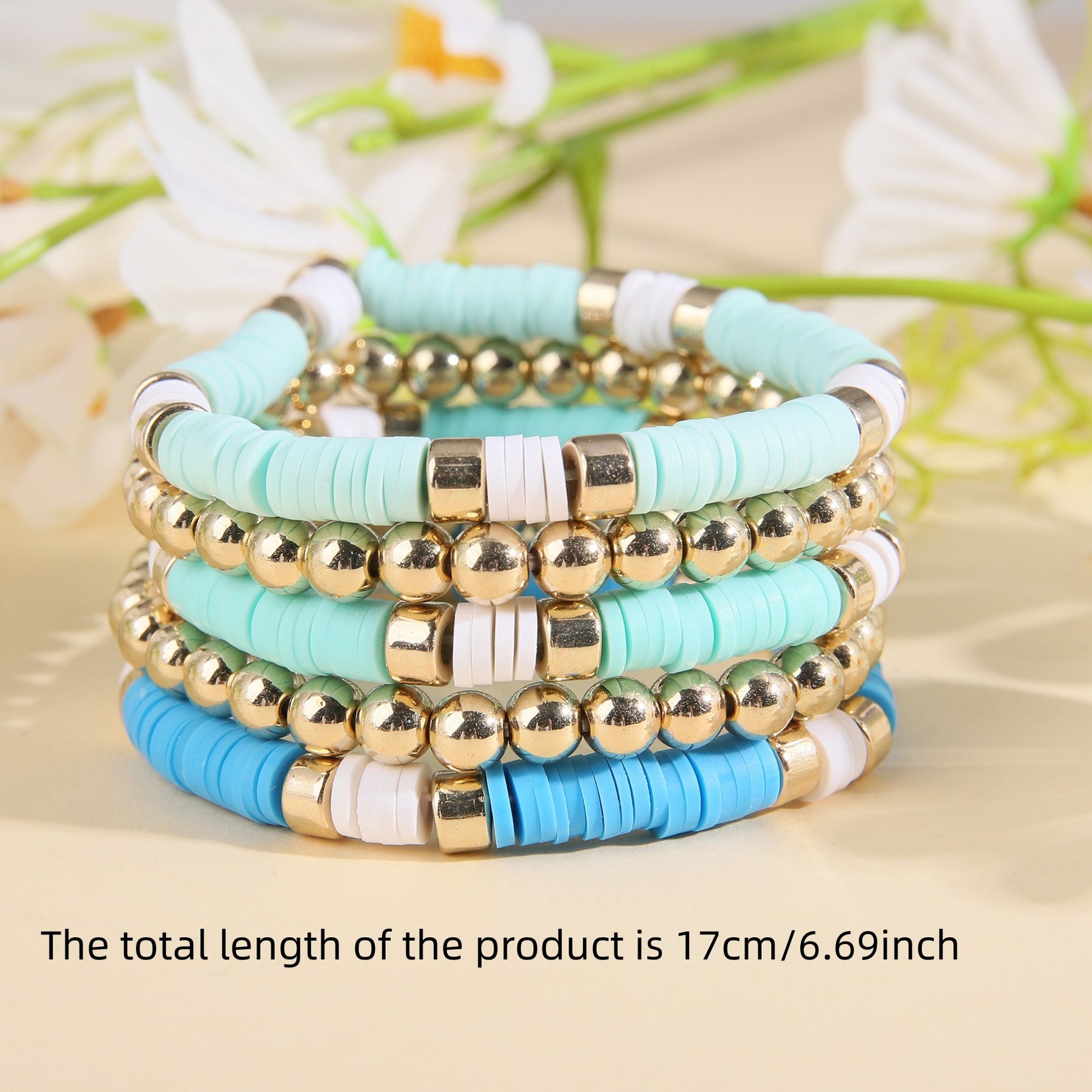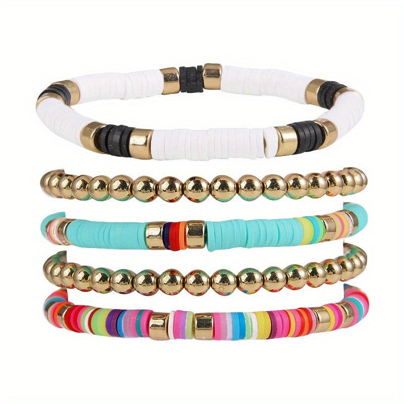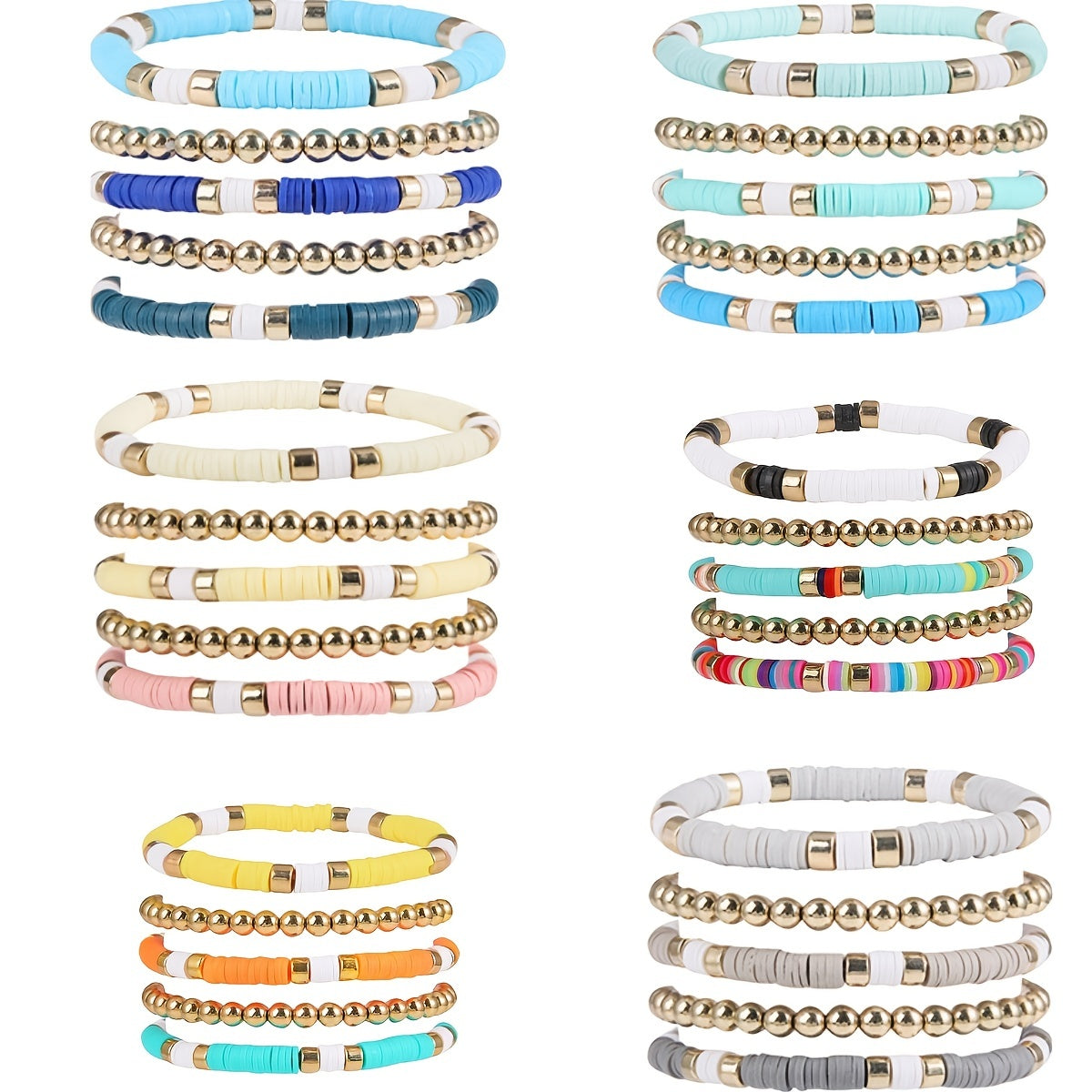 This 5-piece set features round soft pottery beads on a bracelet, perfect for a retro boho look. It is ideal for men and women to wear during the summer beach season. The charm, elastic design offers a comfortable fit.