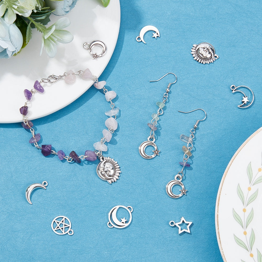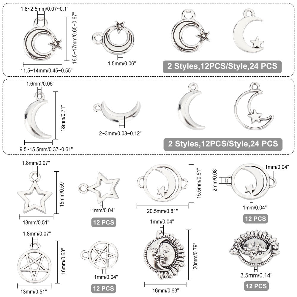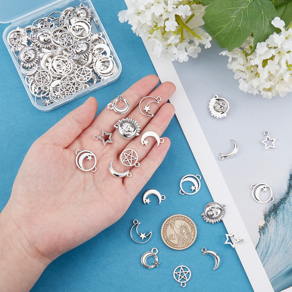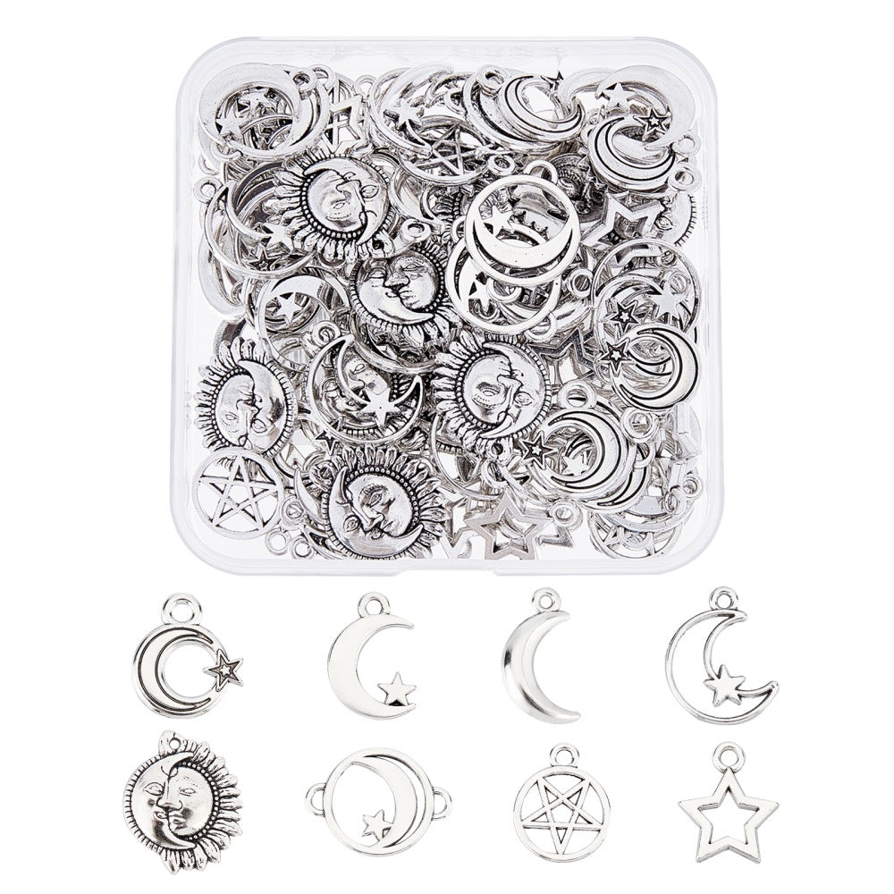 Get 96pcs of 8 different styles of alloy star and moon charms for creating unique necklaces and bracelets. These dangle pendants are perfect for DIY jewelry projects.