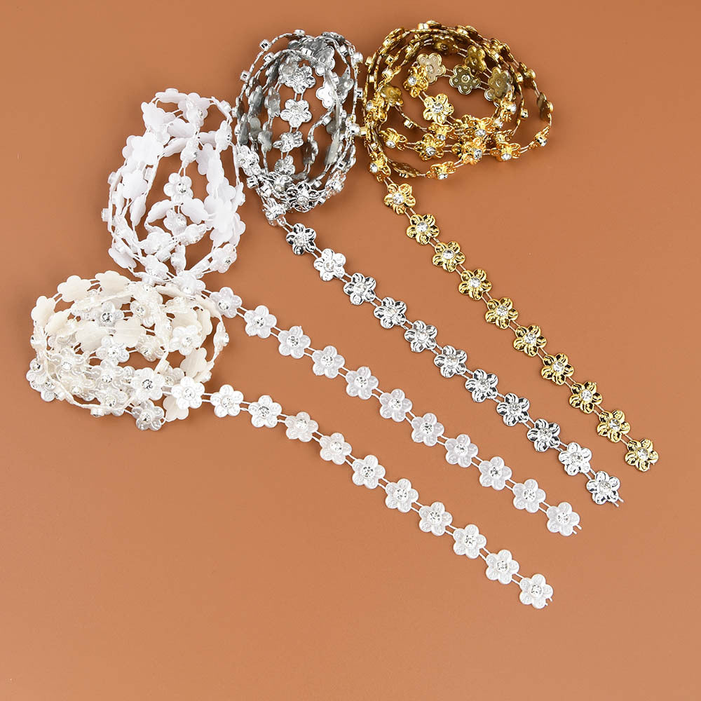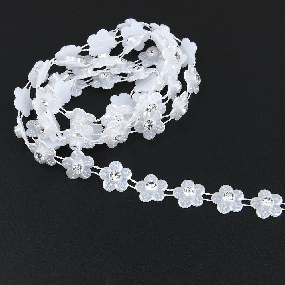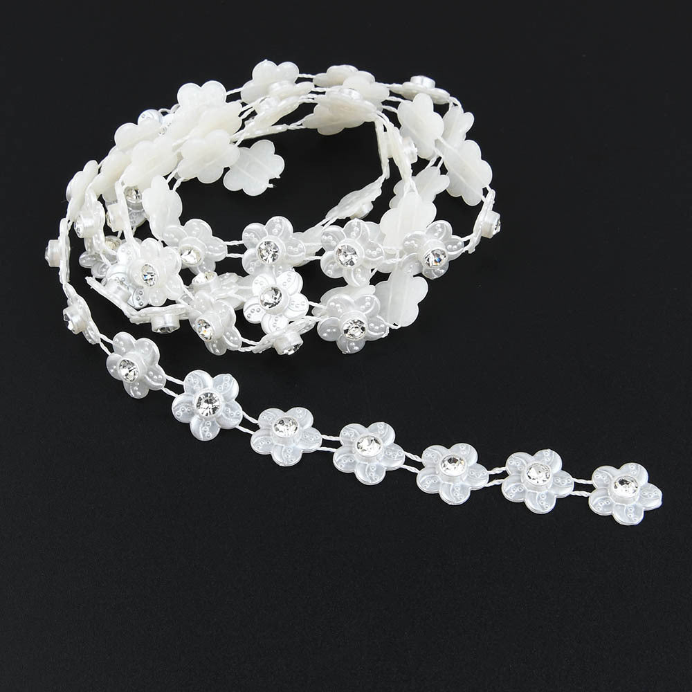 This ABS flat back faux pearl with round rhinestone chain trim lace is perfect for sewing onto wedding clothes, cake decoration, home decor, and more.