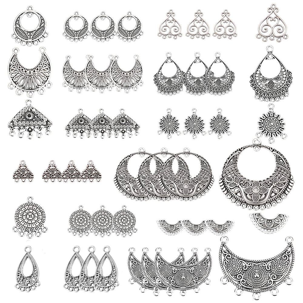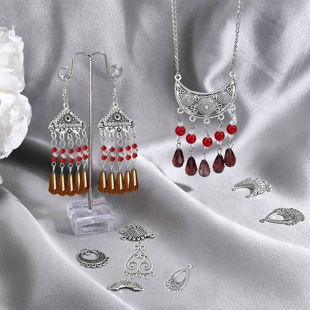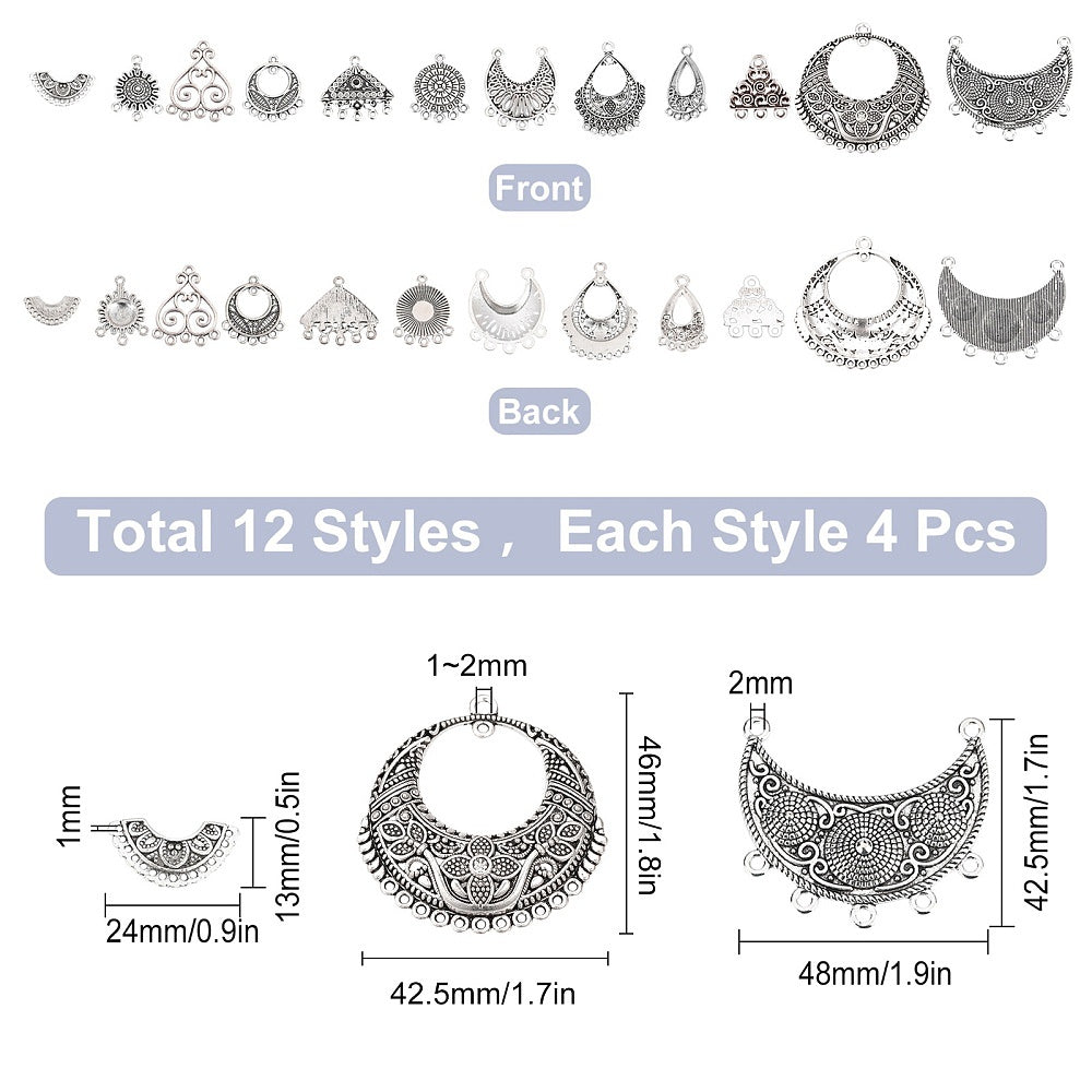 Get this pack of 48pcs alloy chandelier components with 12 different styles including flat round, triangle, teardrop, moon, and fan in antique silver. Perfect for creating unique jewelry pieces!