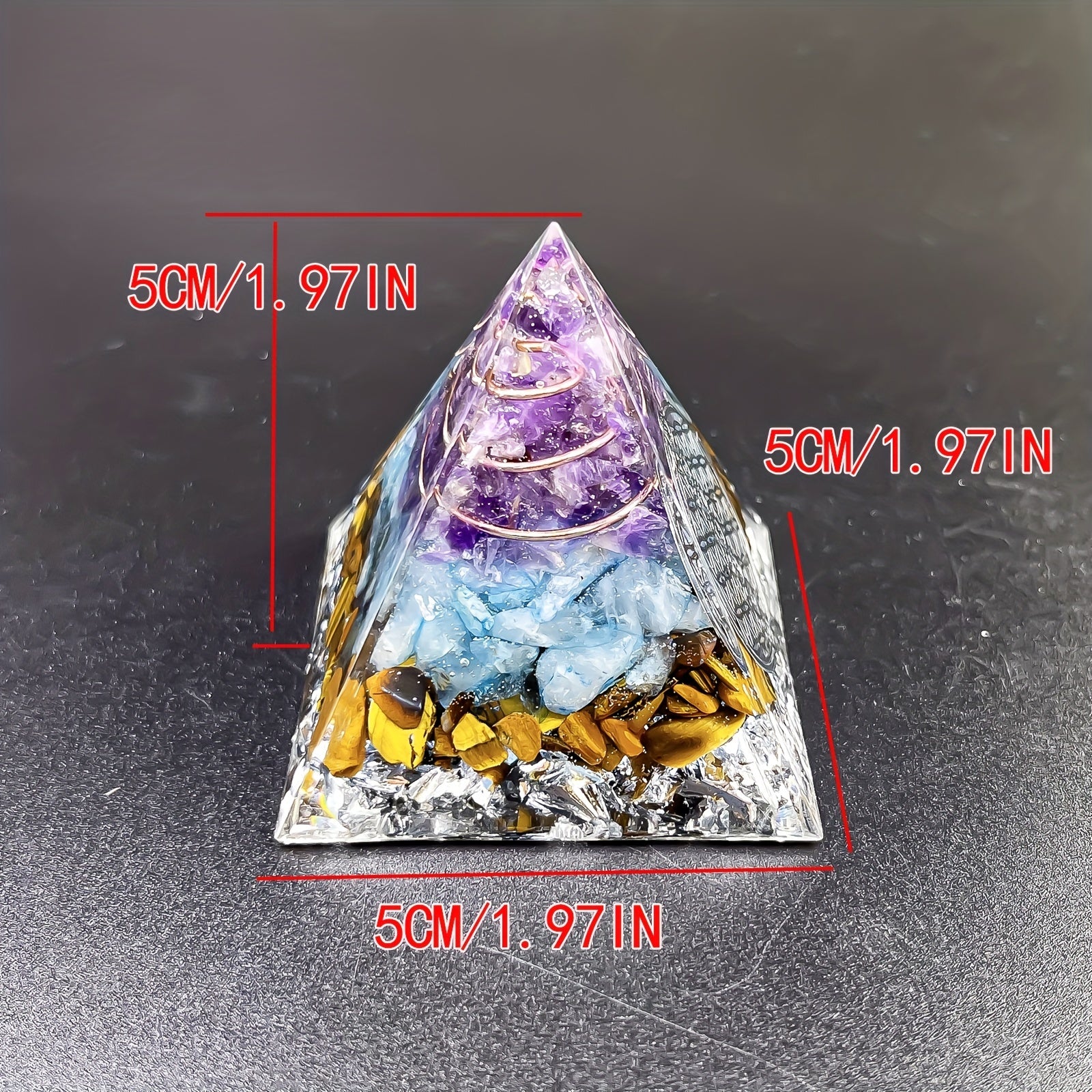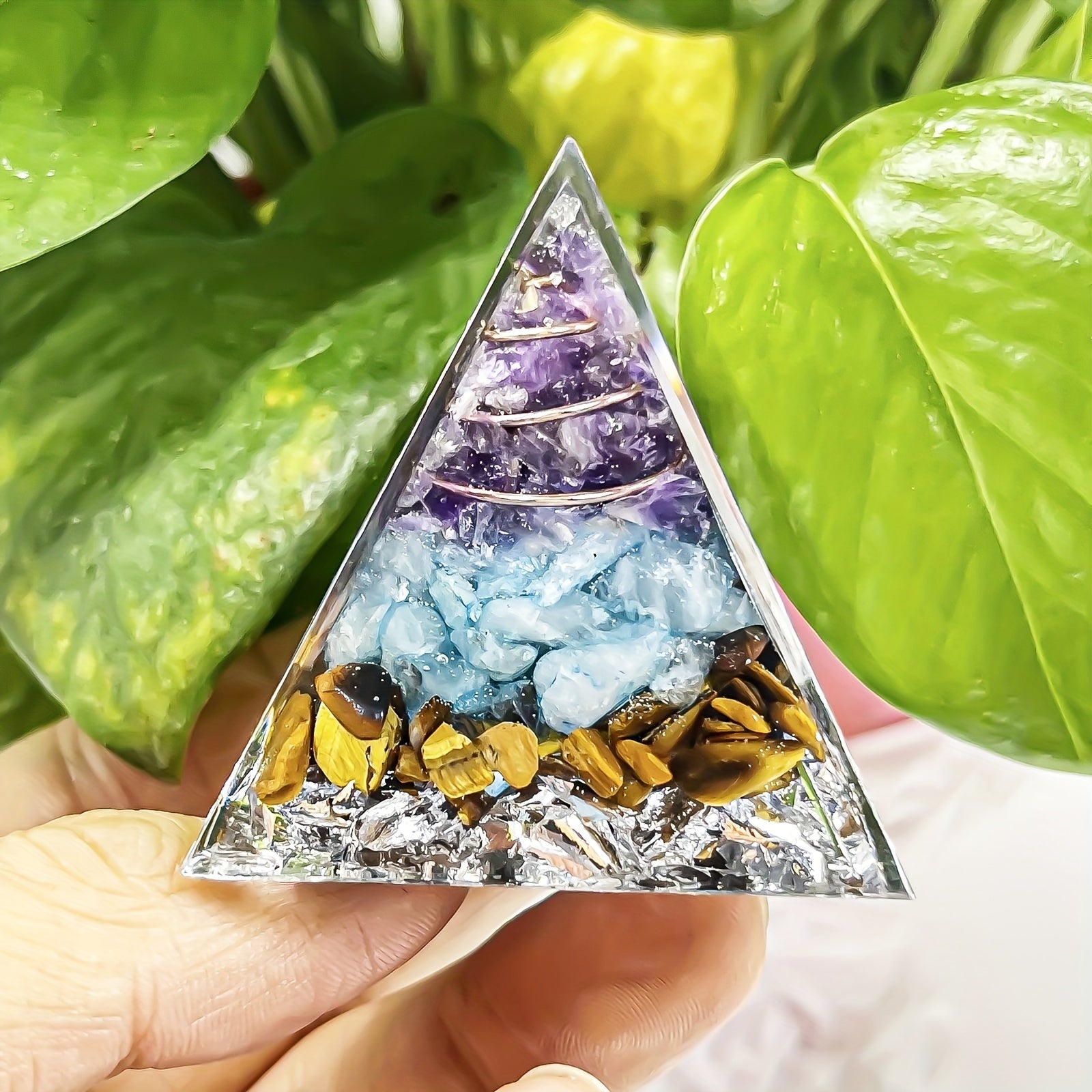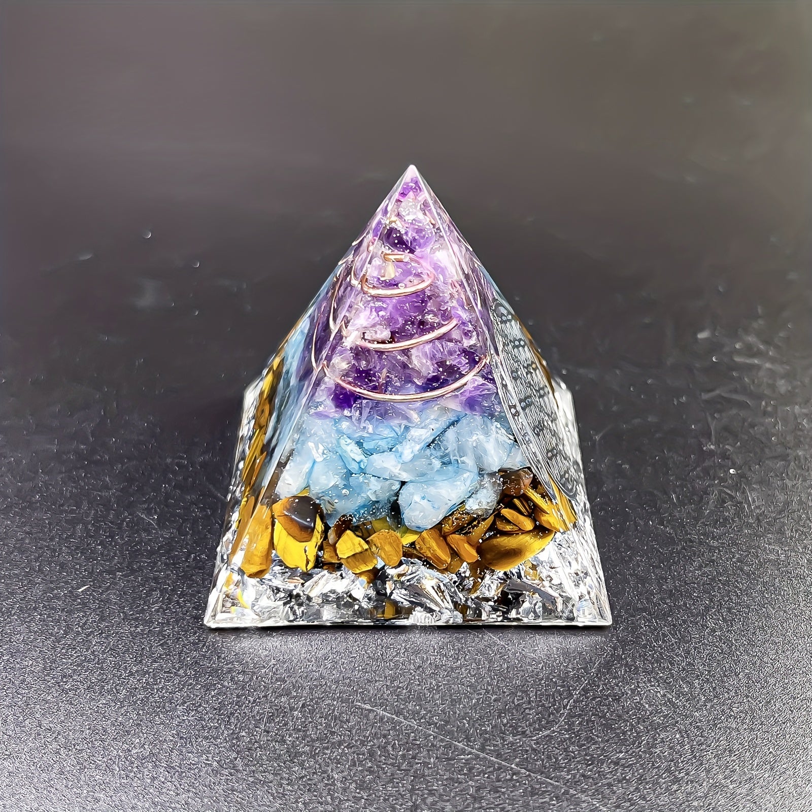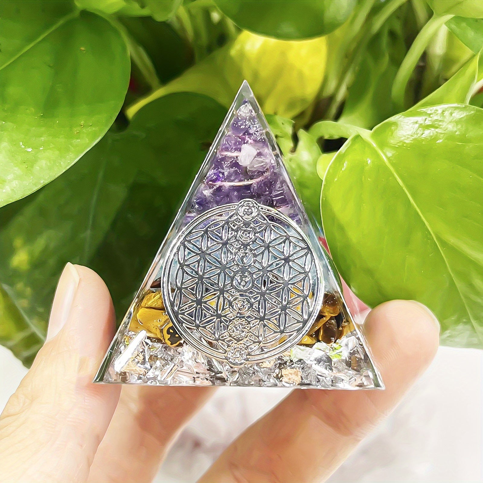 Enhance your space with this beautiful amethyst and tiger eye pyramid designed for interior decoration, meditation, yoga, and more.