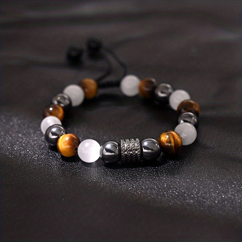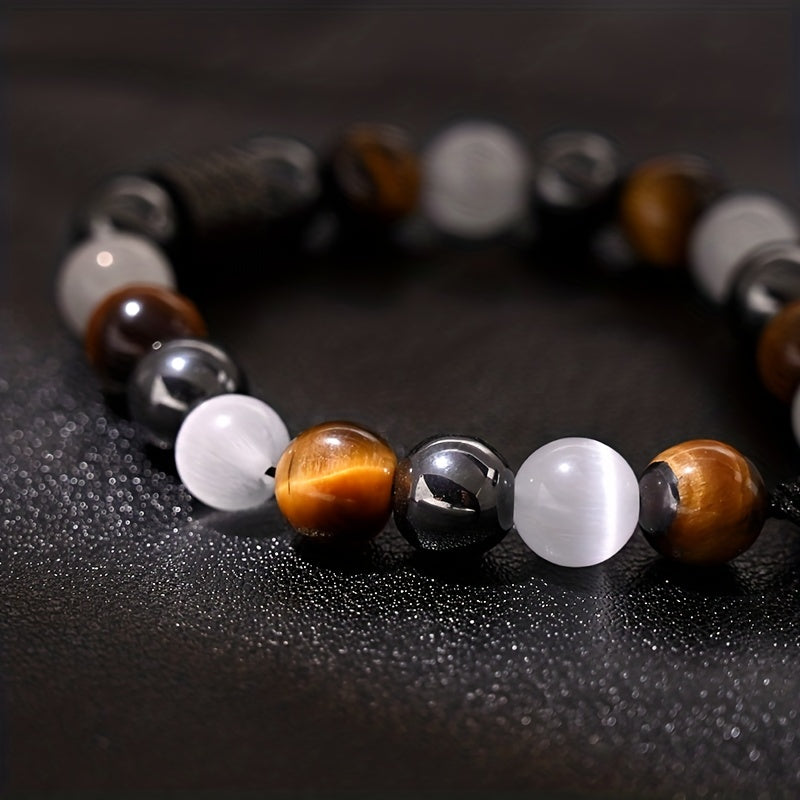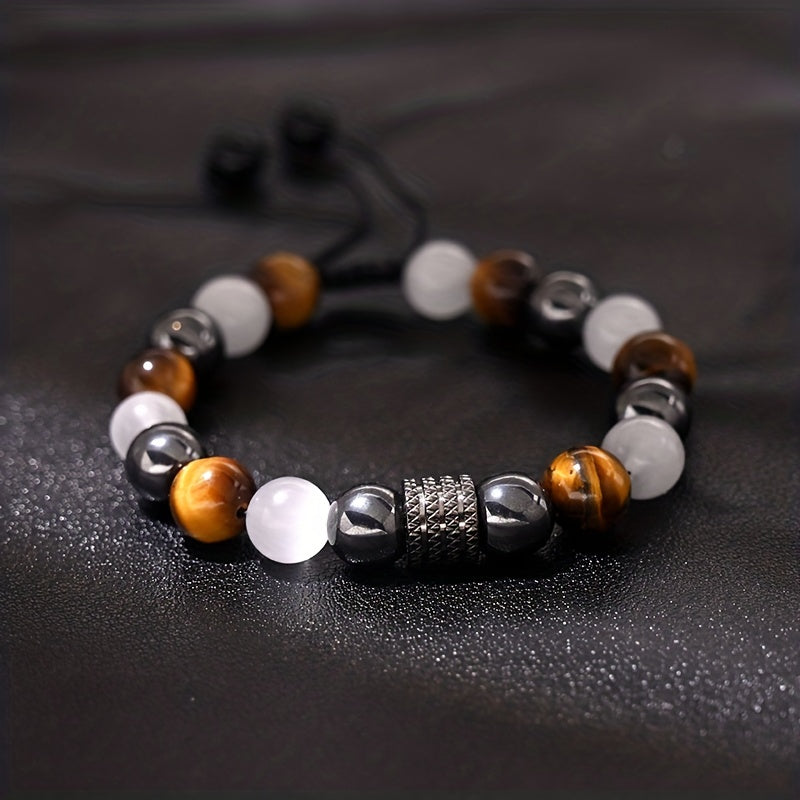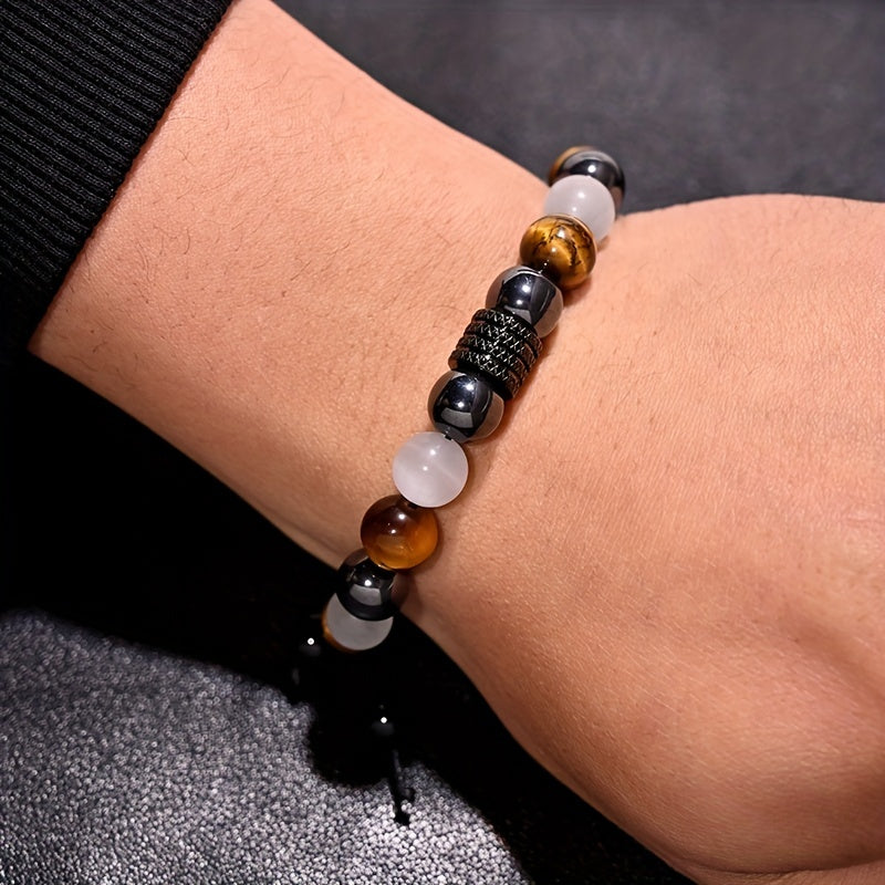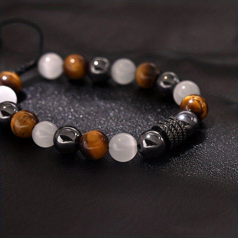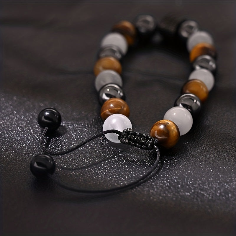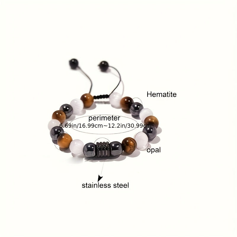 This hand string bracelet features black gallstone tiger eye cat eye stones and stainless steel, creating a lucky beaded hand-braided design.