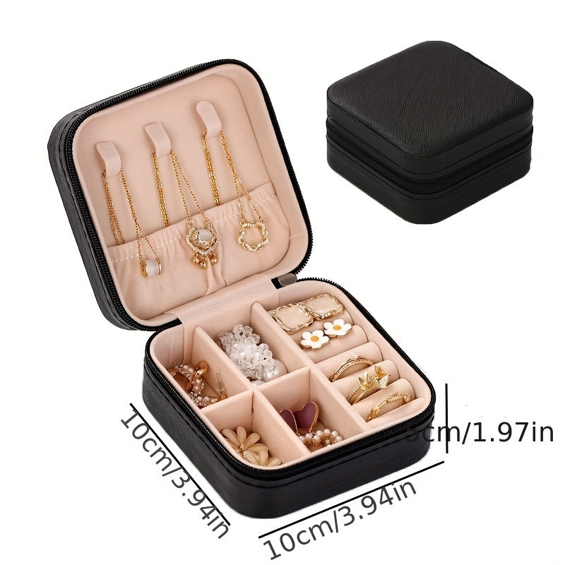 Keep your jewelry organized while on the go with this compact and portable storage box. It features compartments for earrings, necklaces, and rings.