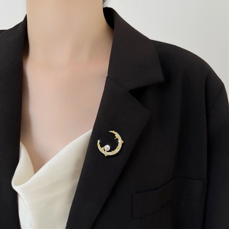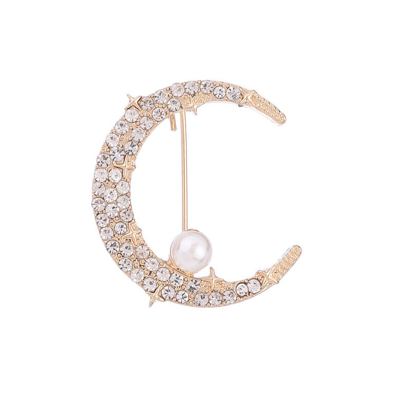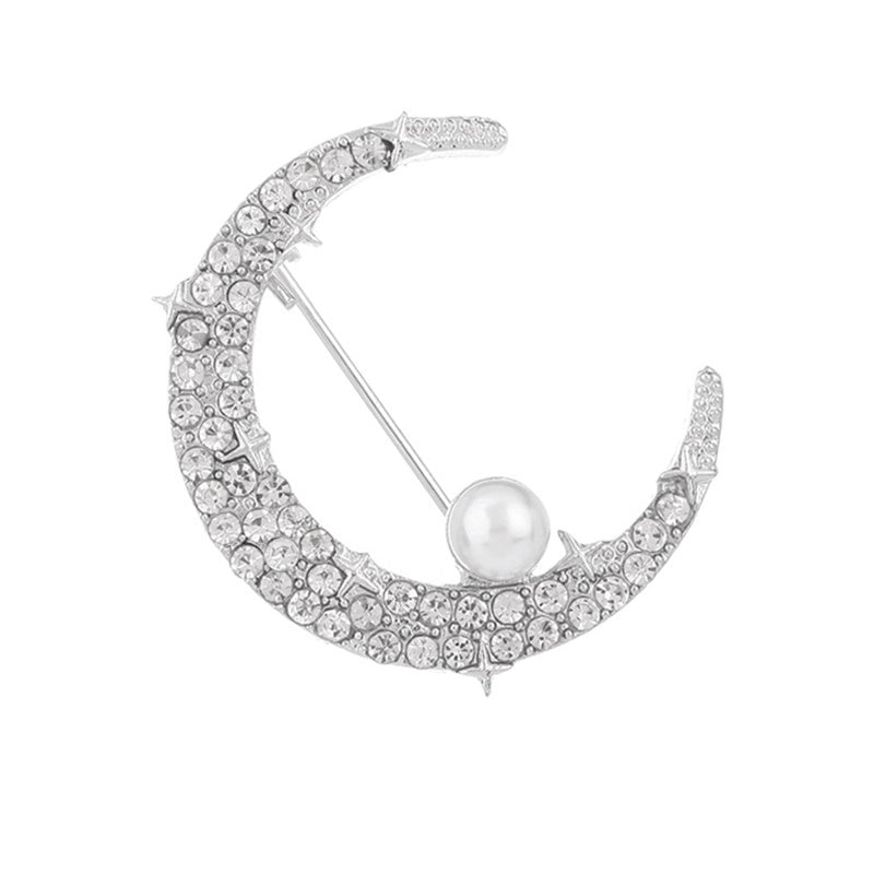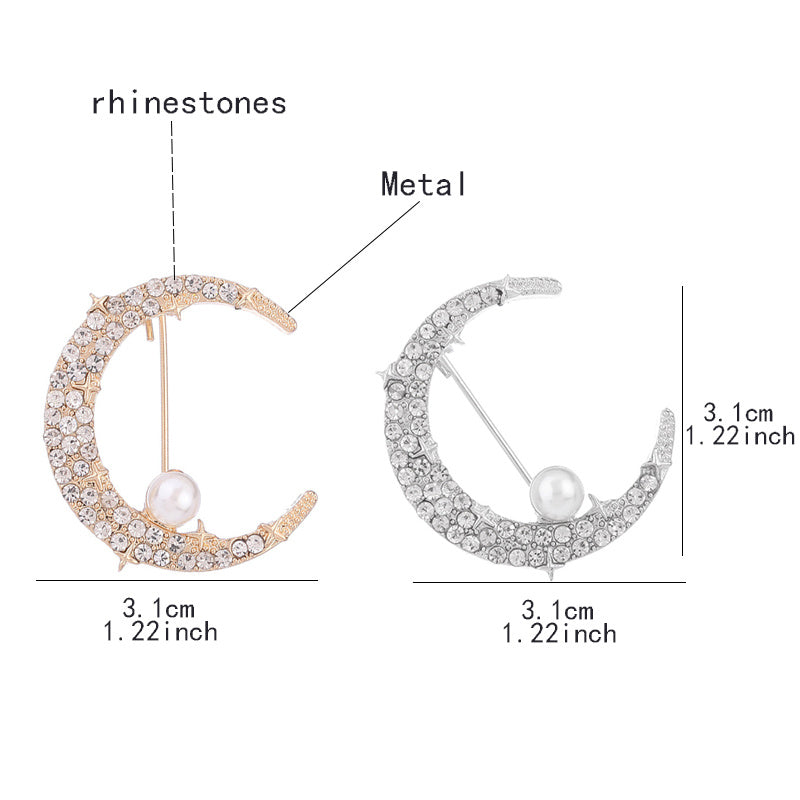 Add a touch of elegance with this crescent moon brooch featuring rhinestones and faux pearls. The safety pin ensures a non-slip attachment to your clothing.
