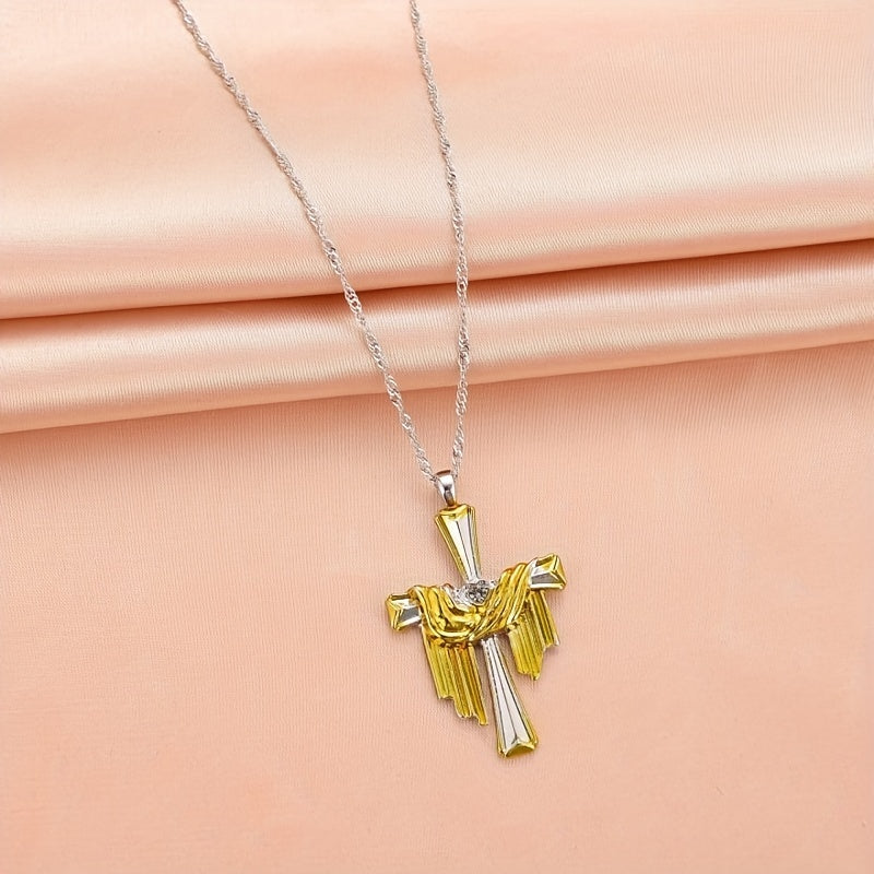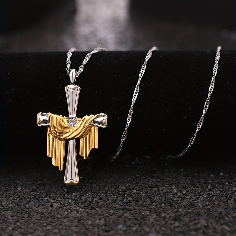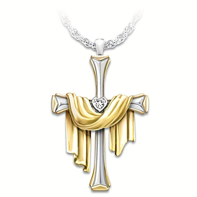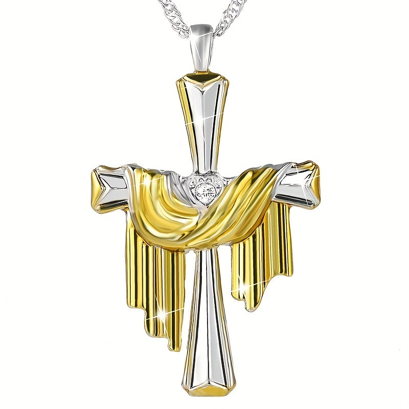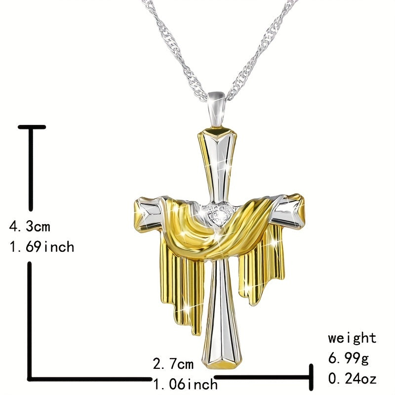 This elegant pendant features a cross holy coat design with inlaid rhinestones, perfect for men or women or couples. The two-tone finish adds a touch of sophistication and style.