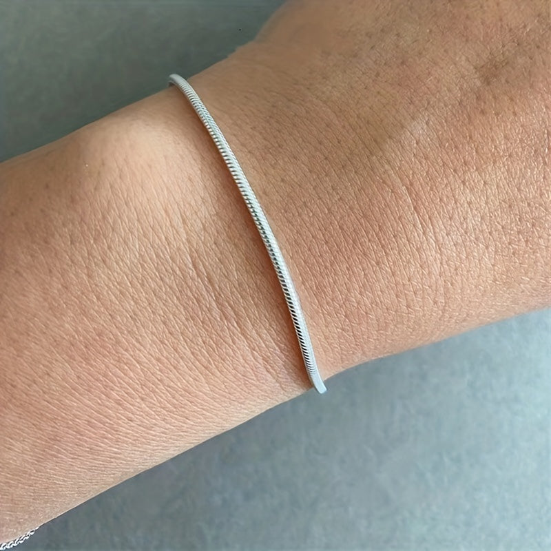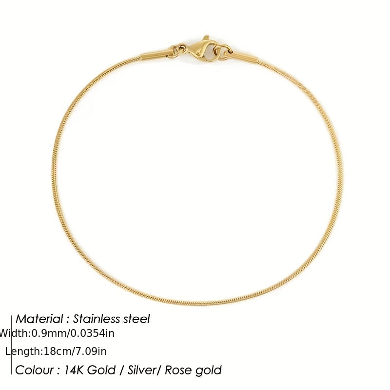 This minimalist golden bracelet features a snake link chain design and a lobster clasp closure. It is made of high-quality stainless steel, making it durable and stylish.