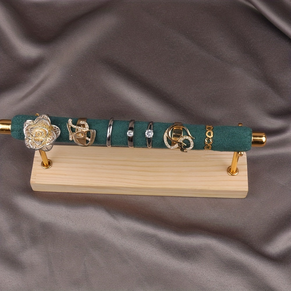 Keep your rings and earrings organized with this green velvet jewelry display stand featuring a solid wood base. Ideal for tabletops or jewelry store counters.