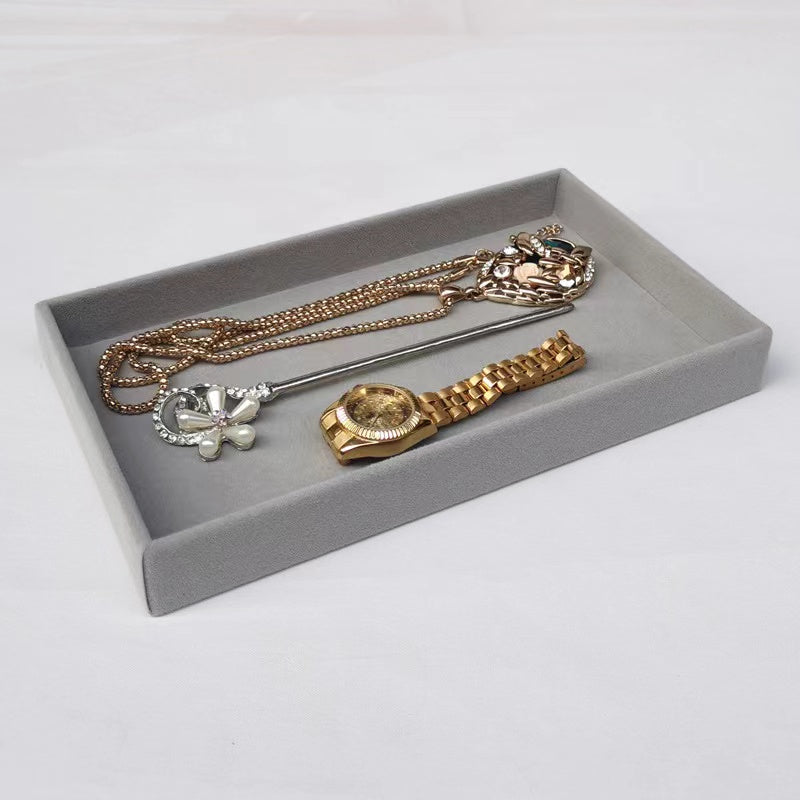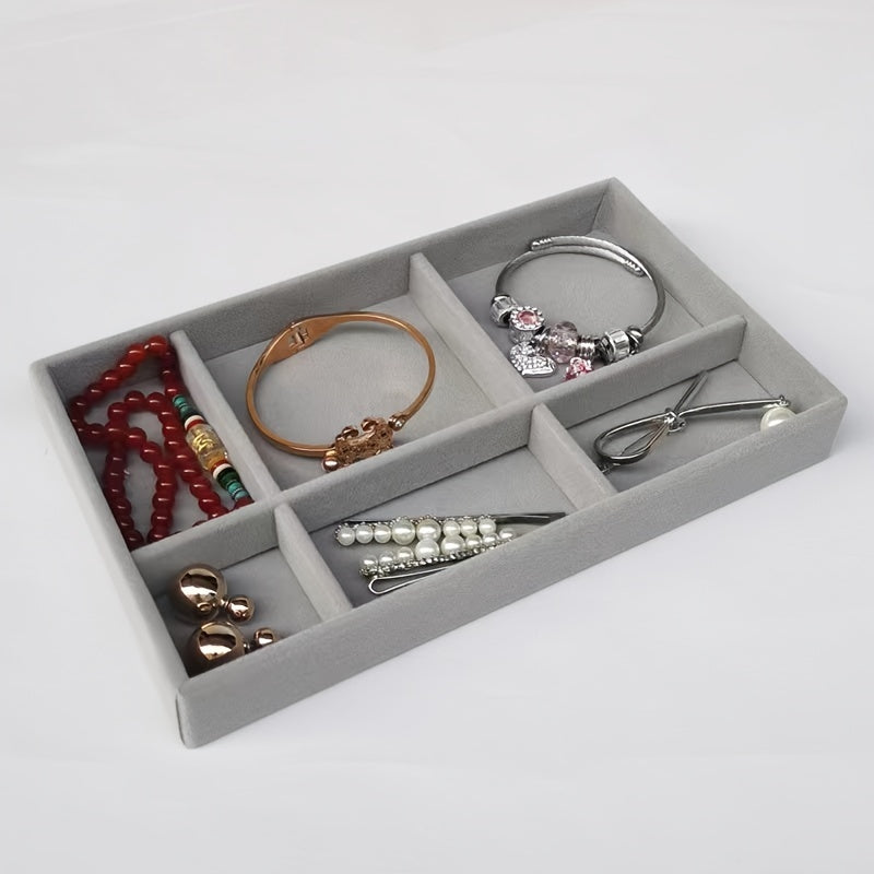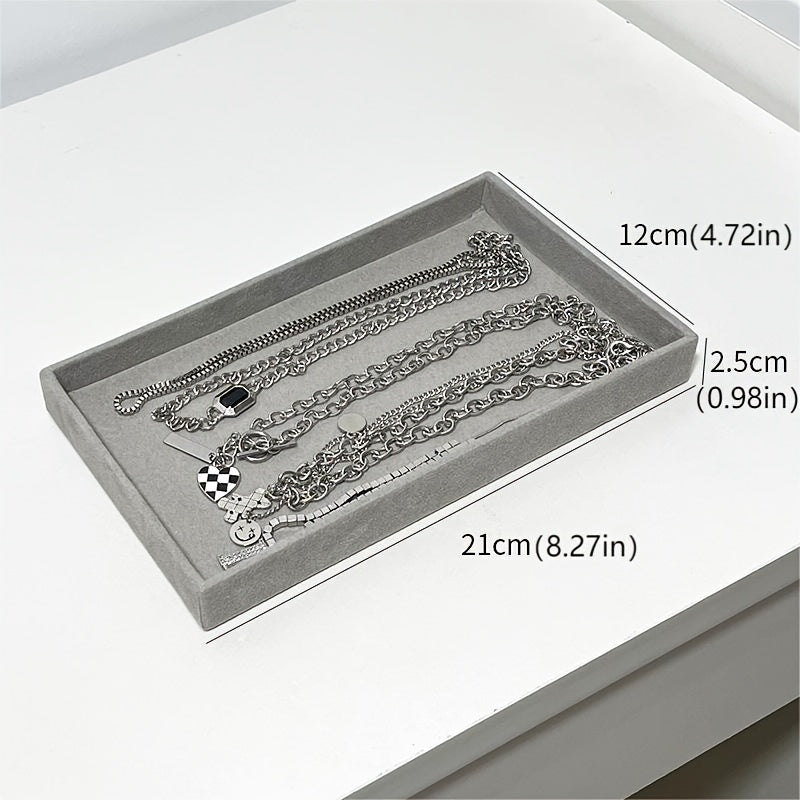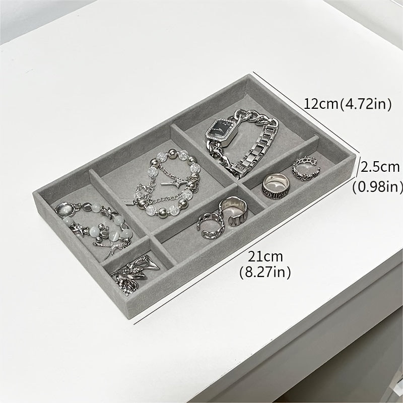 Keep your stud earrings organized and dust-free with this grey velvet jewelry display tray. The tray also features a drawer for additional jewelry storage.
