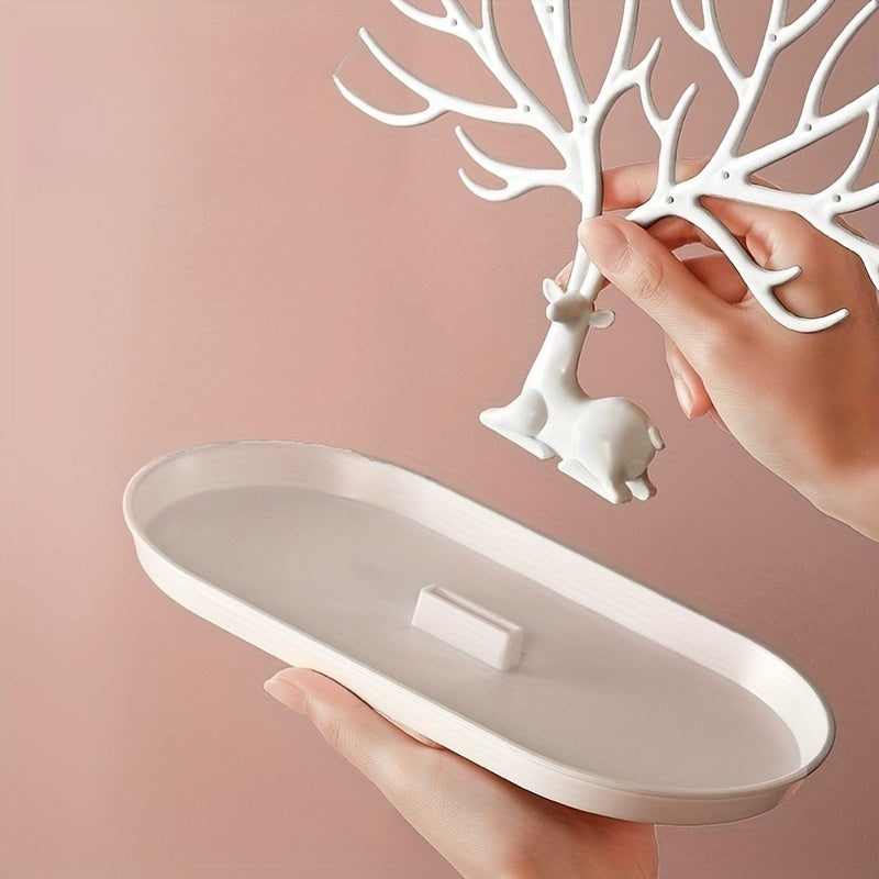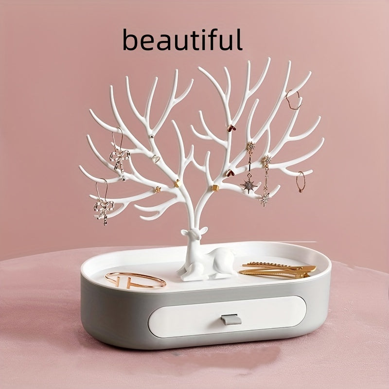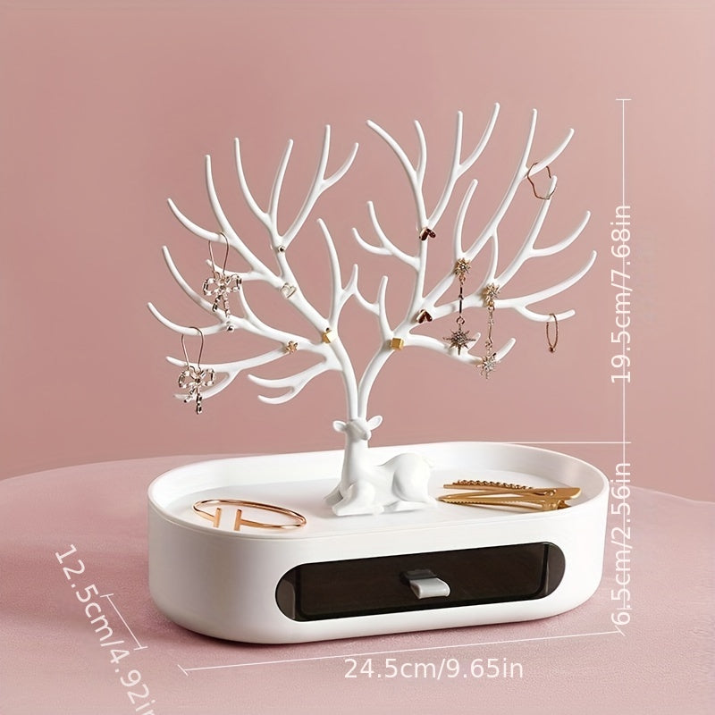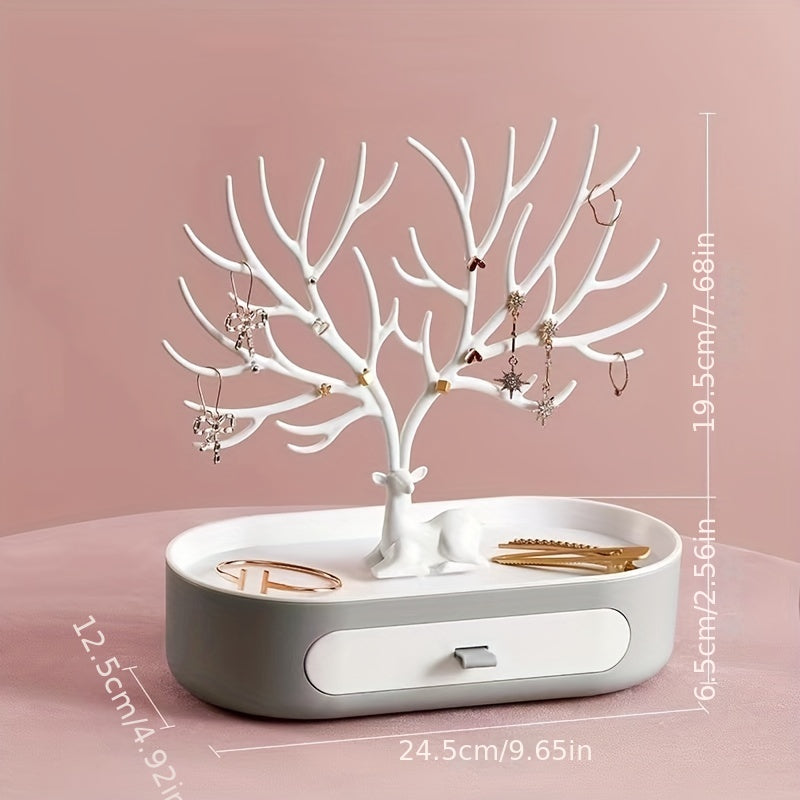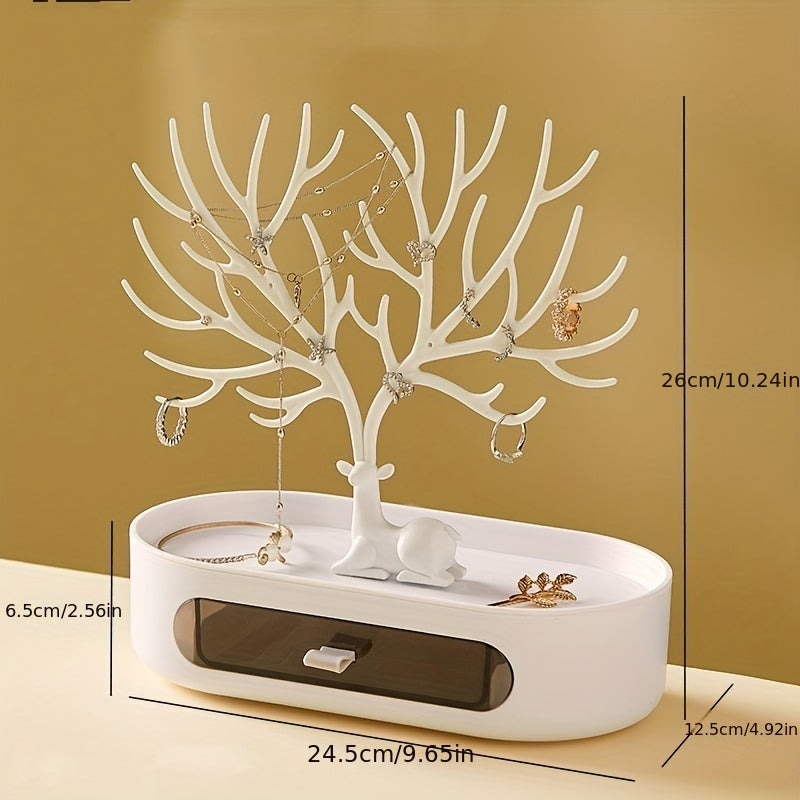 Keep your jewelry organized and easily accessible with this hanging jewelry organizer. Featuring a cute fawn corner tree shape design and a convenient drawer, it is perfect for home or office use. Makes a great gift for your loved ones.