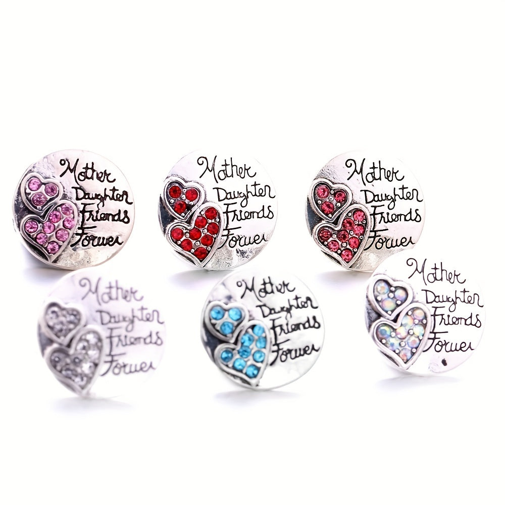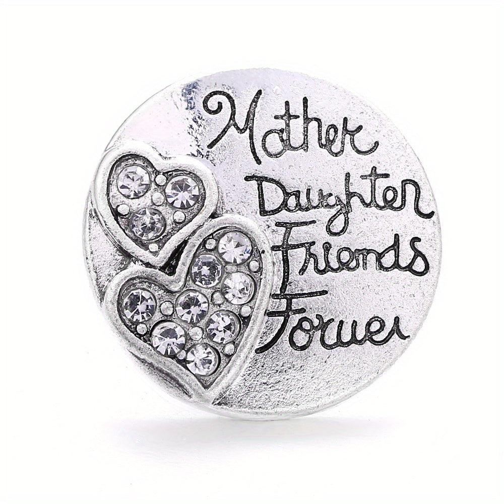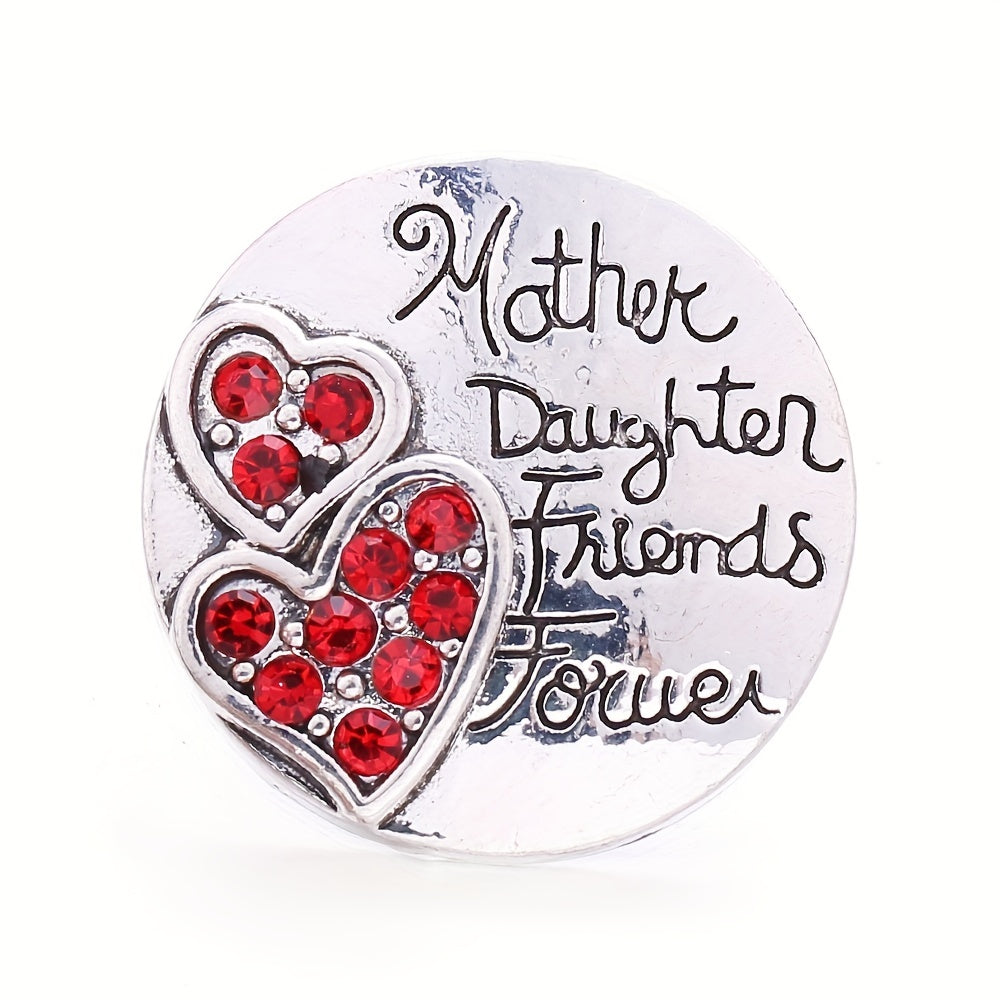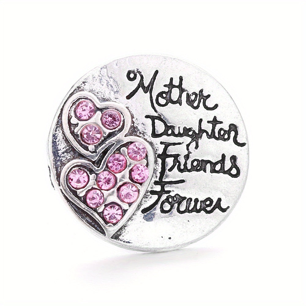 Alloy round bracelet accessory with heart letter print and inlaid rhinestone. Features 18mm snap button and pendant buckle.