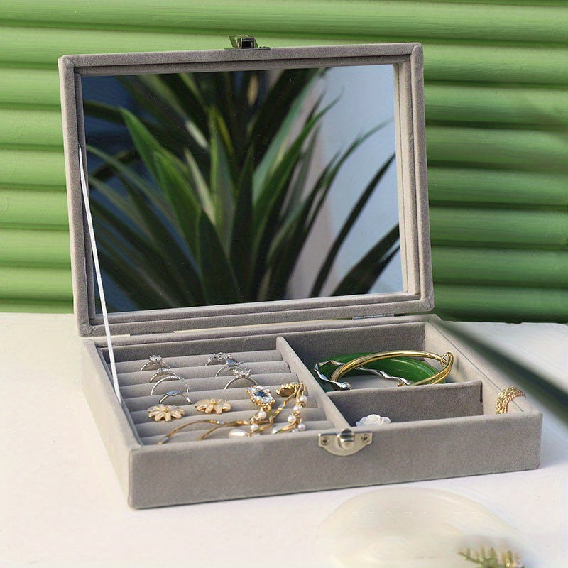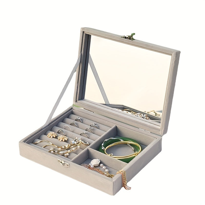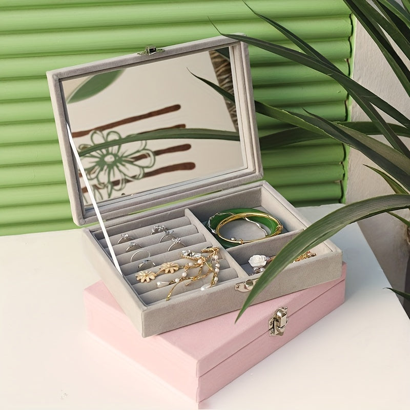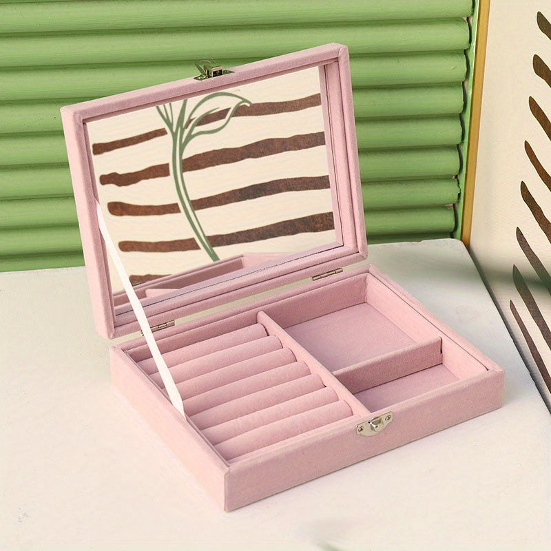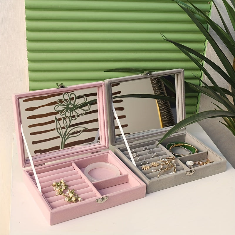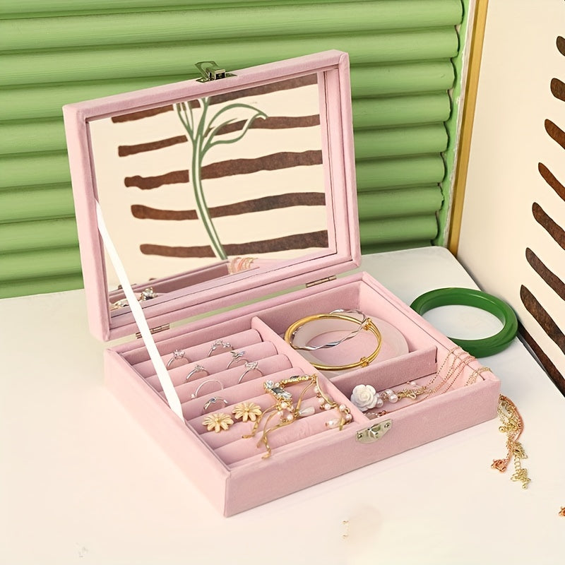 Keep your jewelry organized and safe with this stylish jewelry storage box. It features a mirror for easy viewing, compartments for earrings and studs, and space for bracelets. Perfect for daily use or travel.