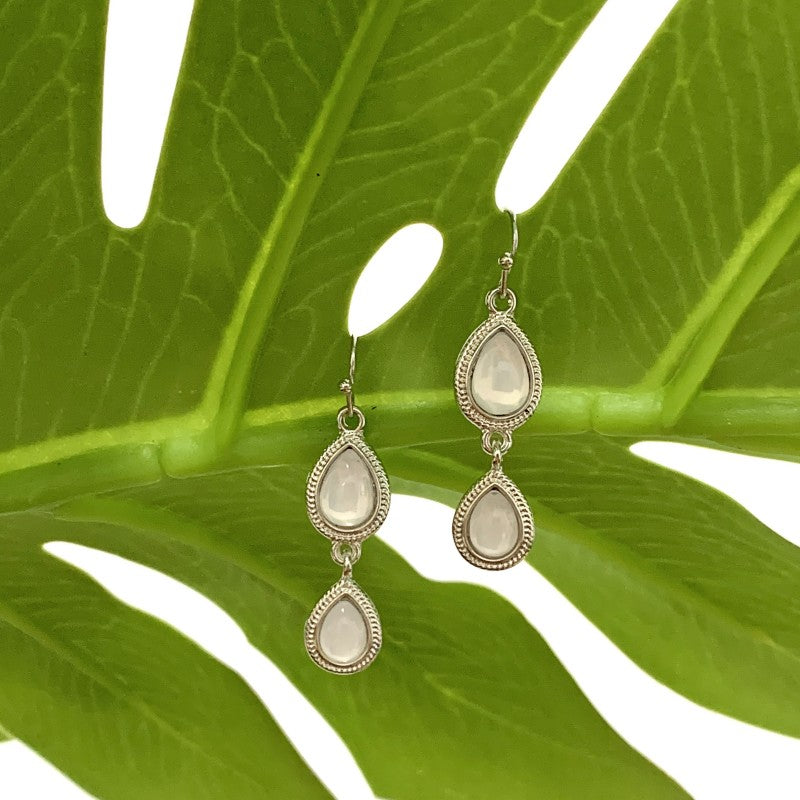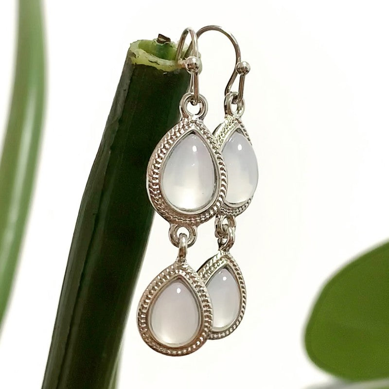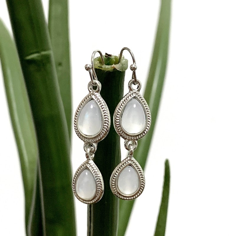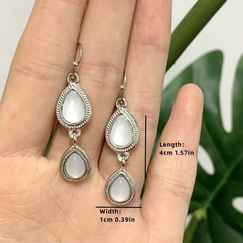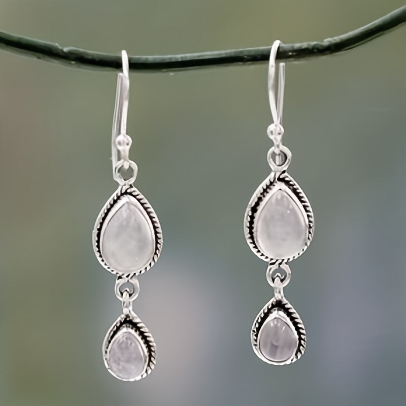 Enhance your look with these unique unisex earrings featuring double moonstone pendants. Perfect for adding a touch of retro style to your outfit.