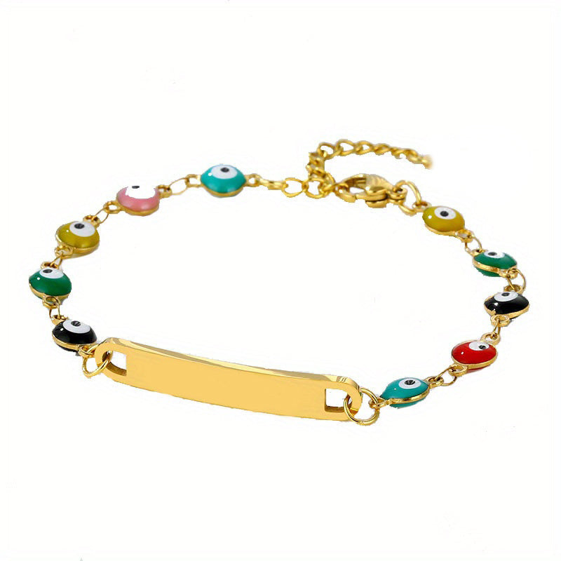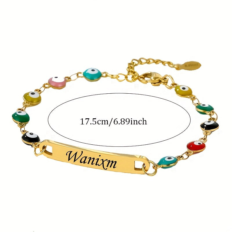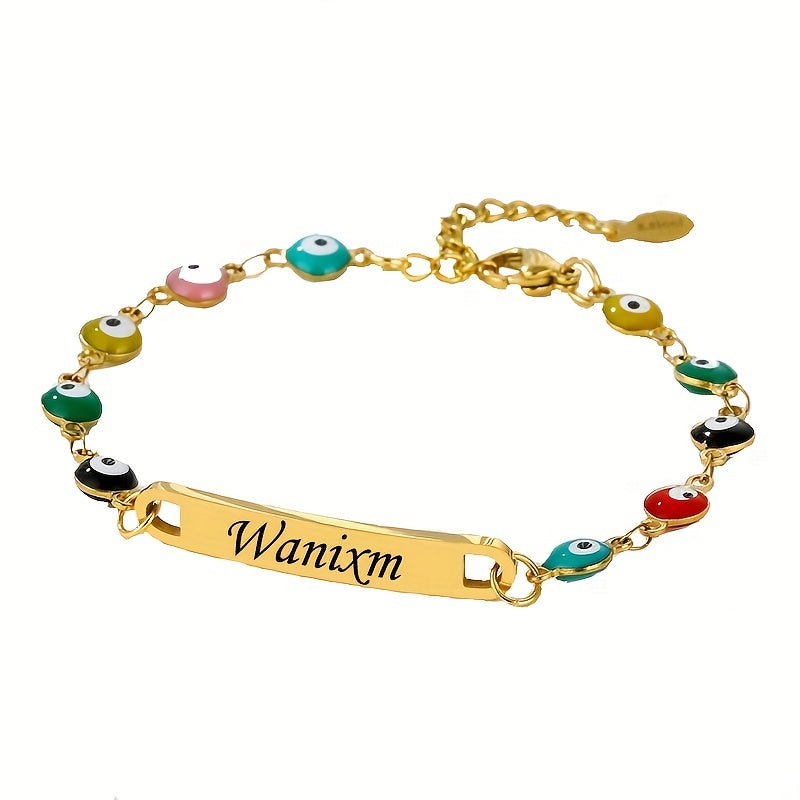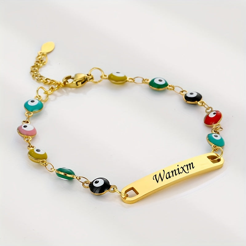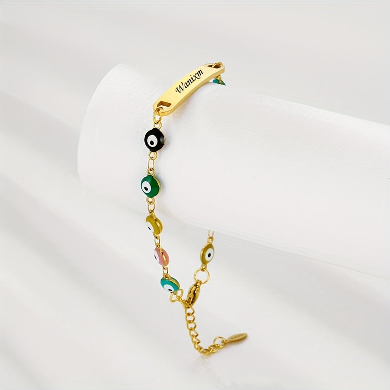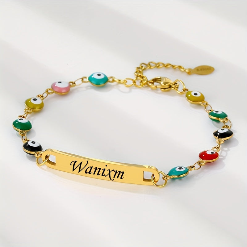 This custom bracelet features a Devil's Eye design with an engraved name ID bangle. It is made of high-quality stainless steel and includes a golden pendant.