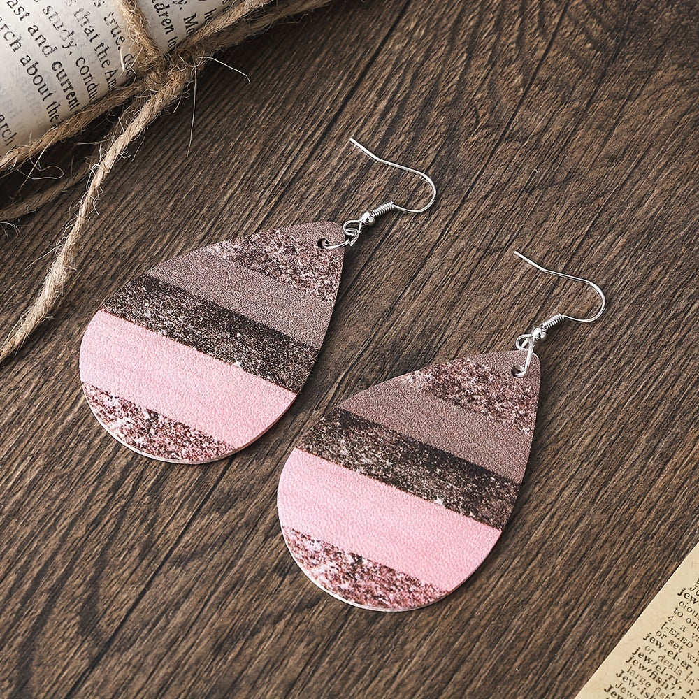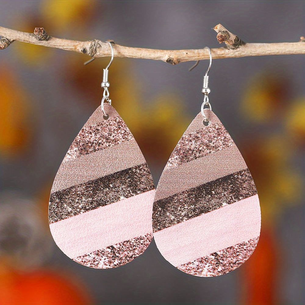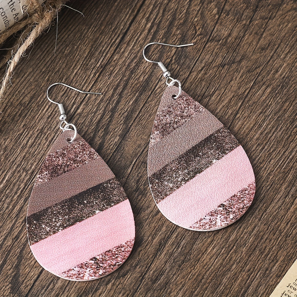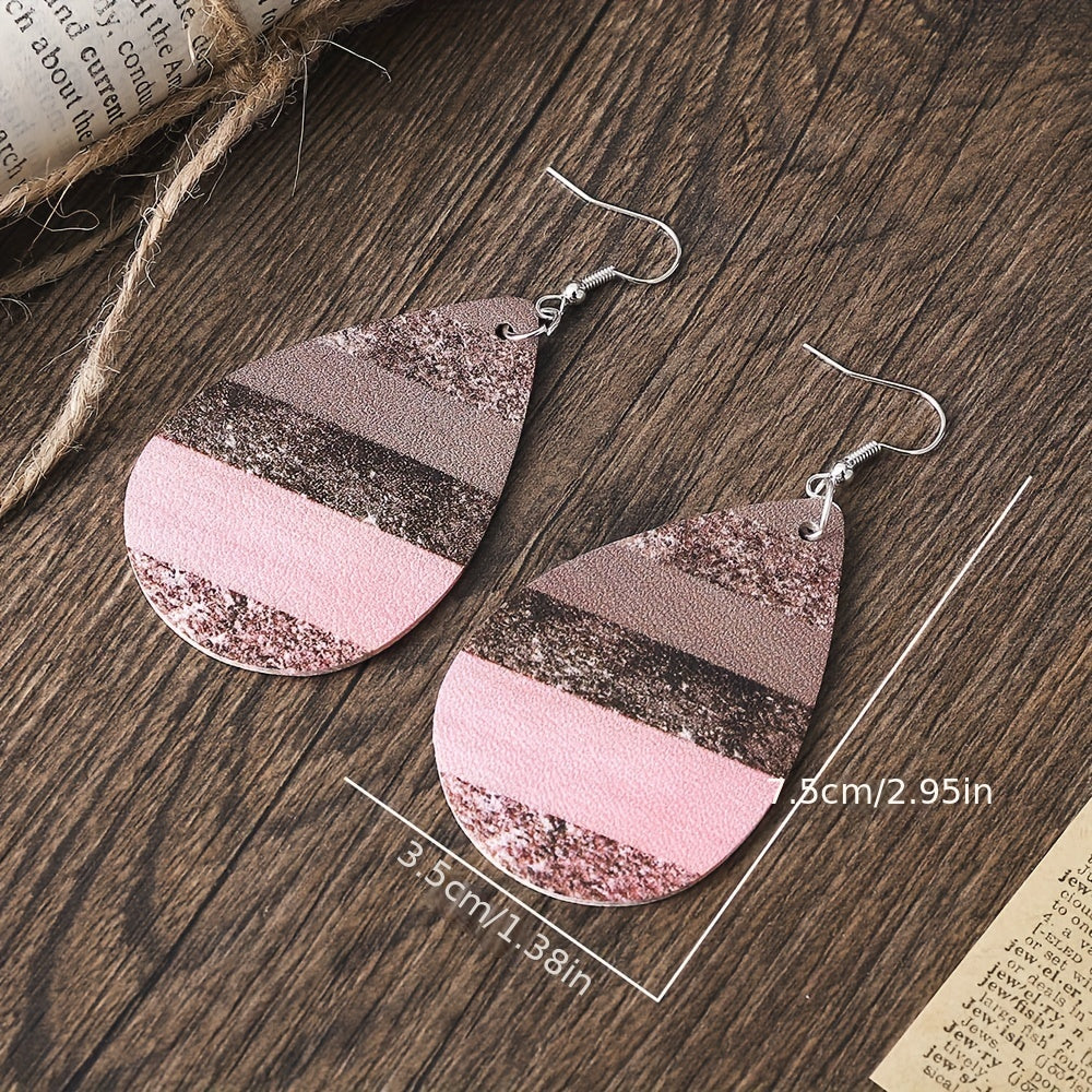 Add a touch of elegance to your outfit with these water drop shape earrings featuring a pink striped pattern. Made of high-quality PU leather, they are lightweight and comfortable to wear.