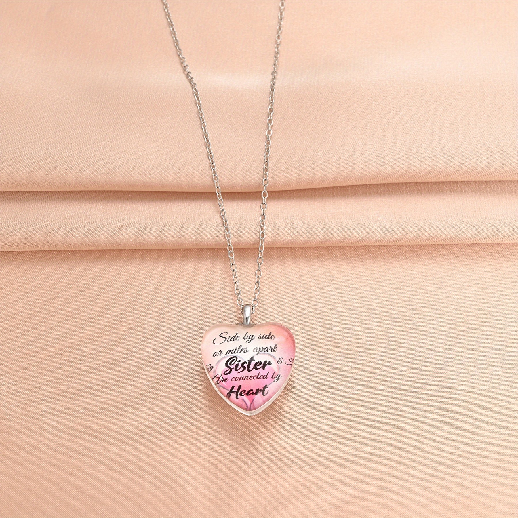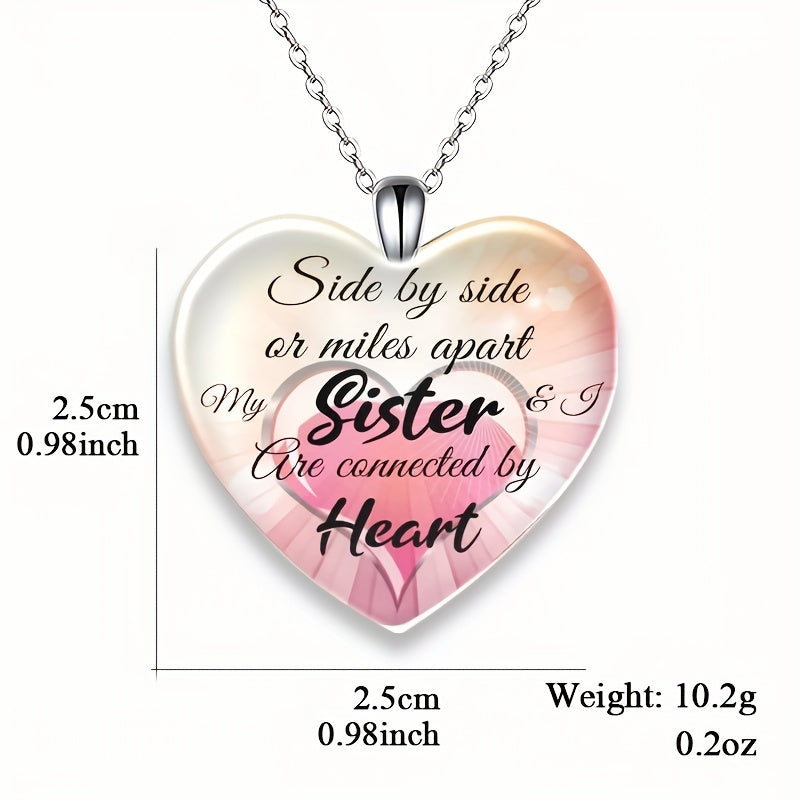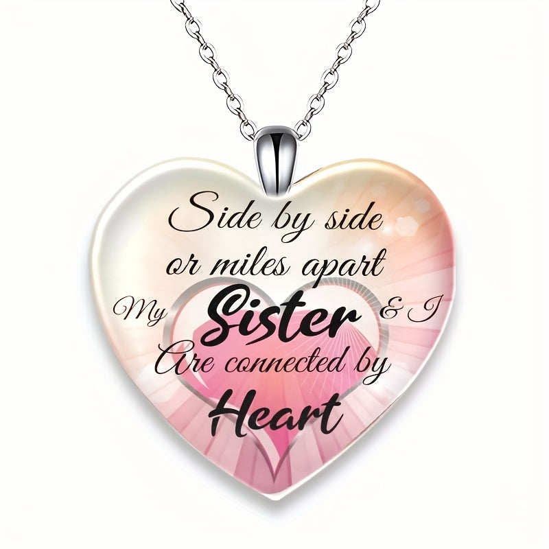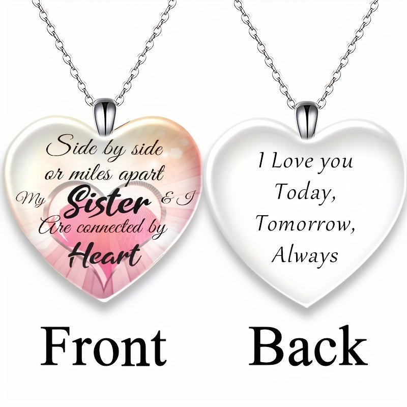 This beautiful pendant necklace features a heart-shaped crystal with the word 'Sister' engraved on it. It makes a perfect gift for family and friends, especially during the Christmas holiday season.