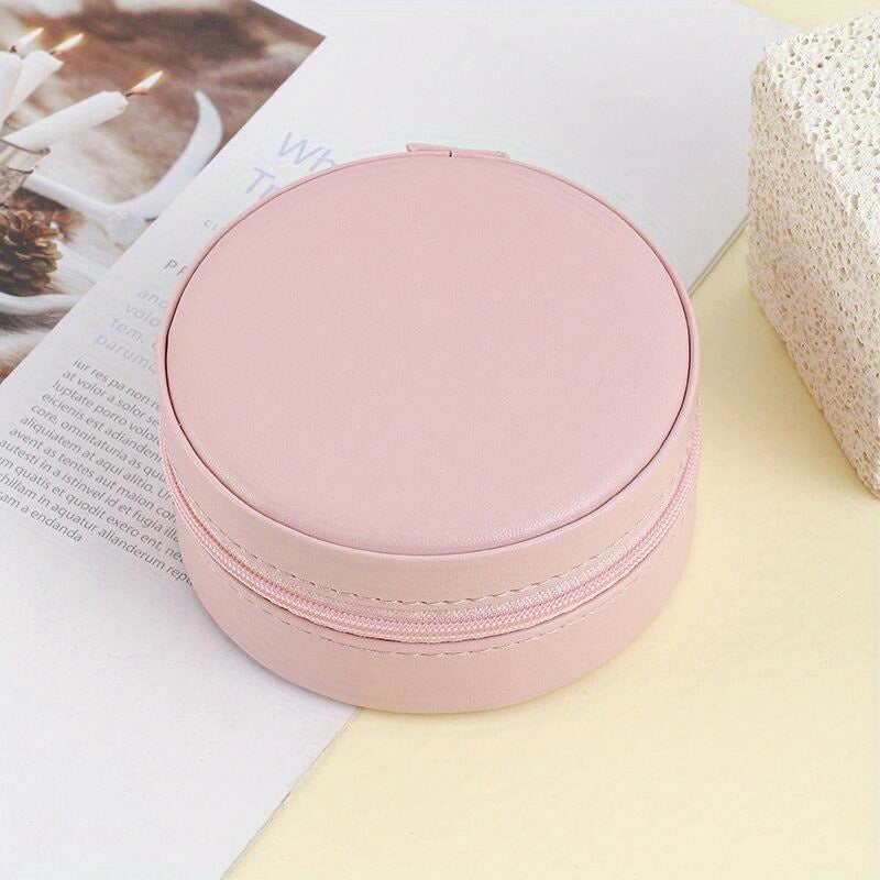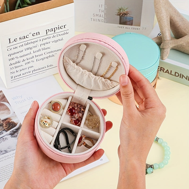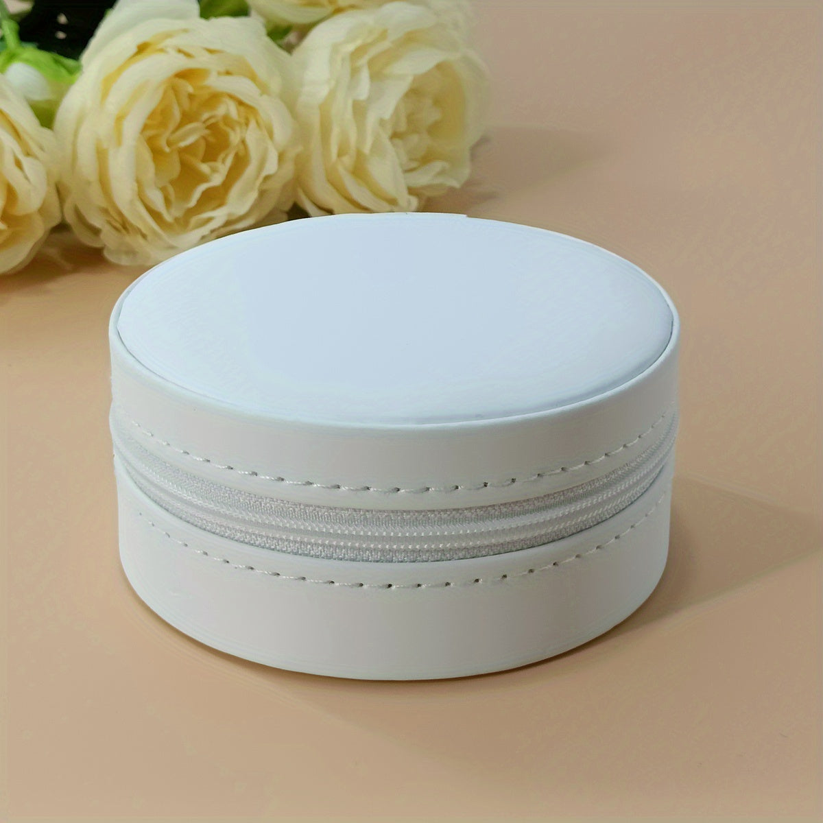 Keep your jewelry safe and organized while traveling with this minimalist round storage box. Perfect for rings, necklaces, and more.