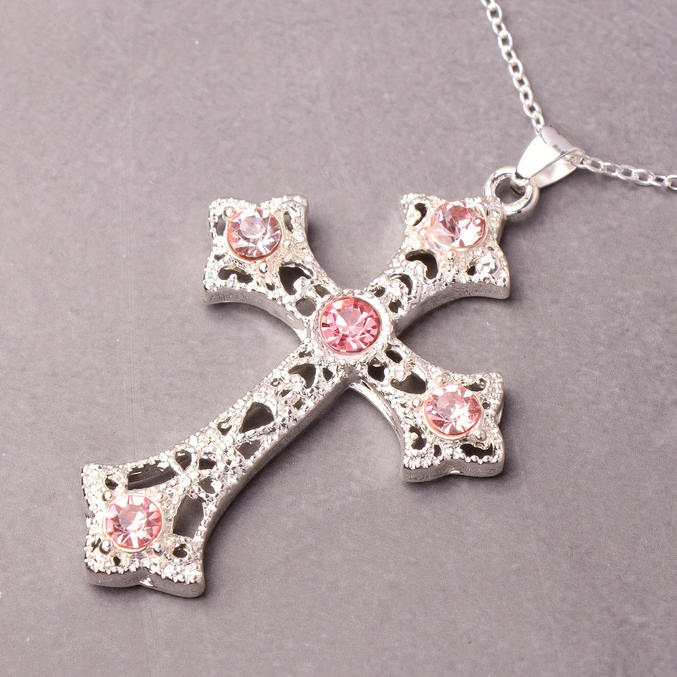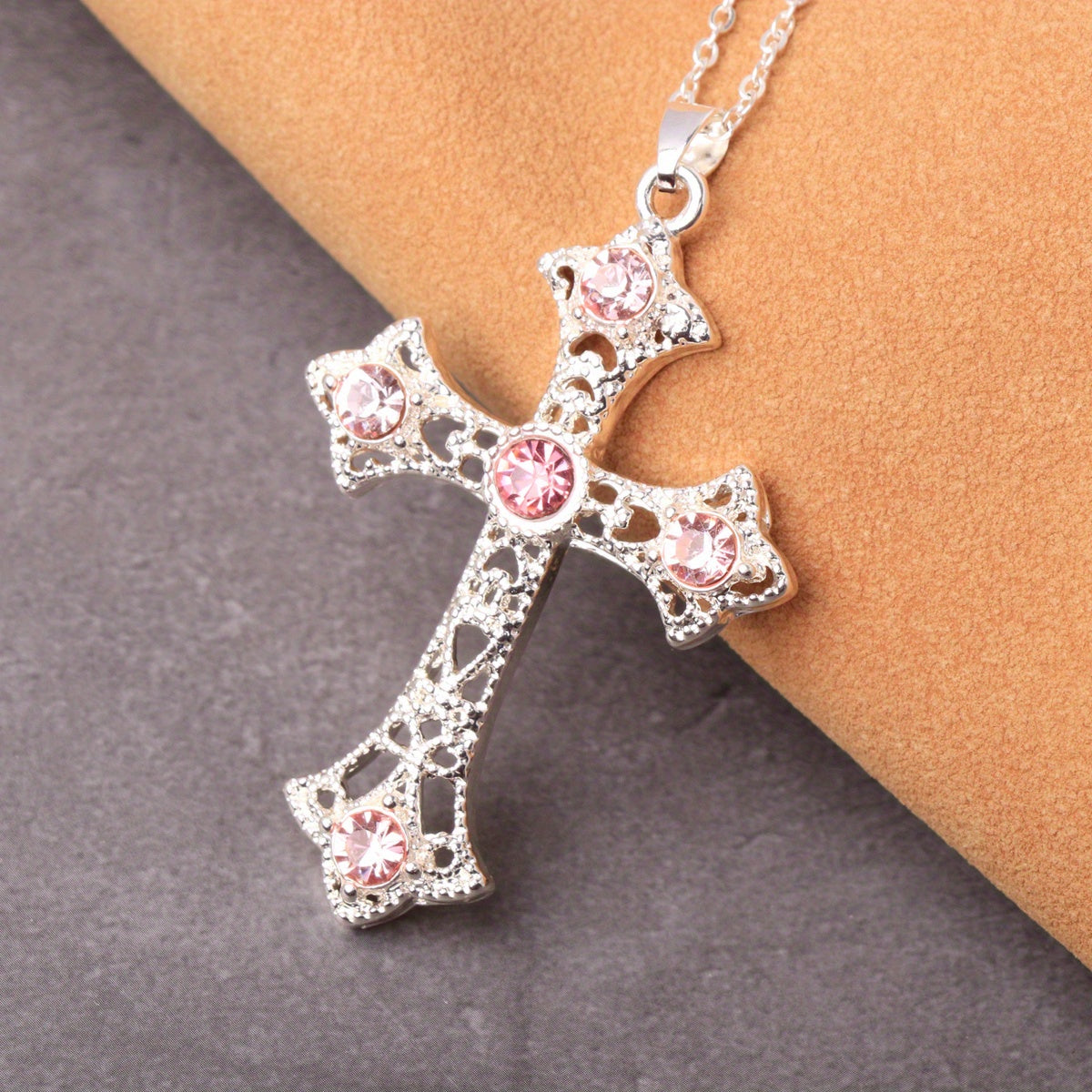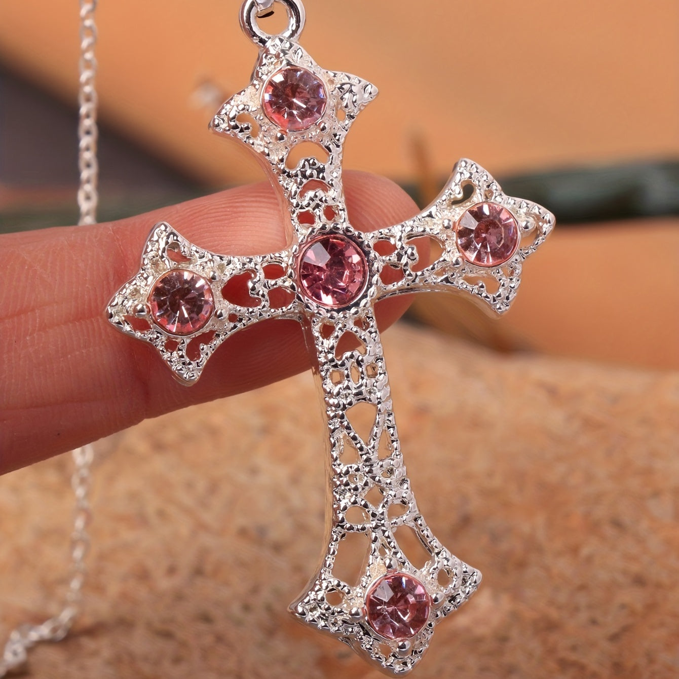 Sparkle Pink Cross Pendant Necklace Crystal Silver Plated Neck Jewelry