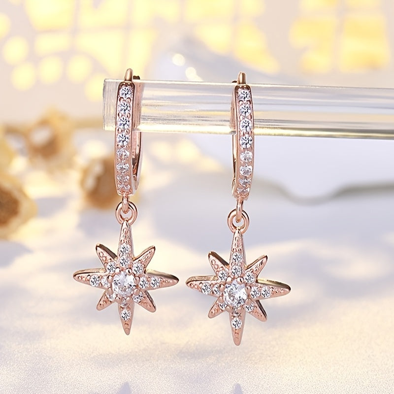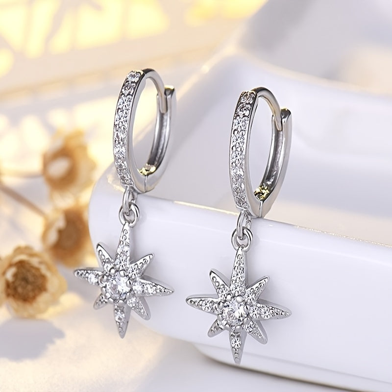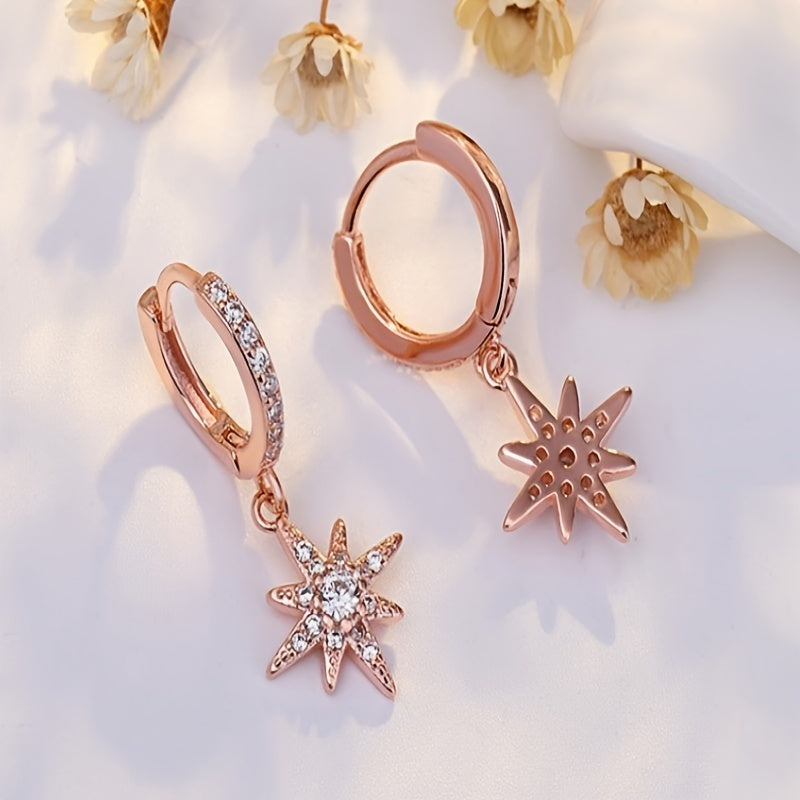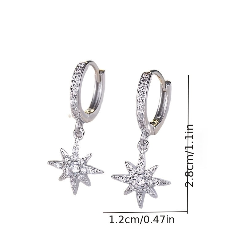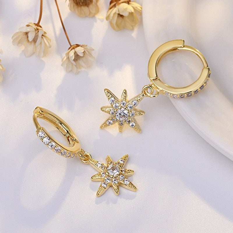 These elegant hoop drop earrings are plated with 18K gold and feature a compass dangle design with star zircon accents. Perfect for holiday parties or everyday wear.