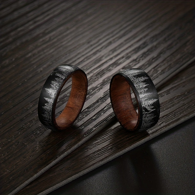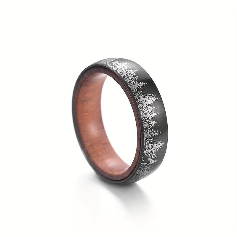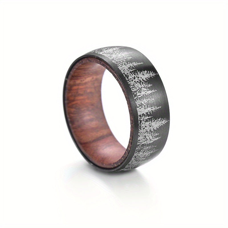 This stunning ring features a laser forest wolf design on titanium steel with a high-density pear wood solid wood inner ring. Perfect for men who appreciate unique and high-quality accessories.