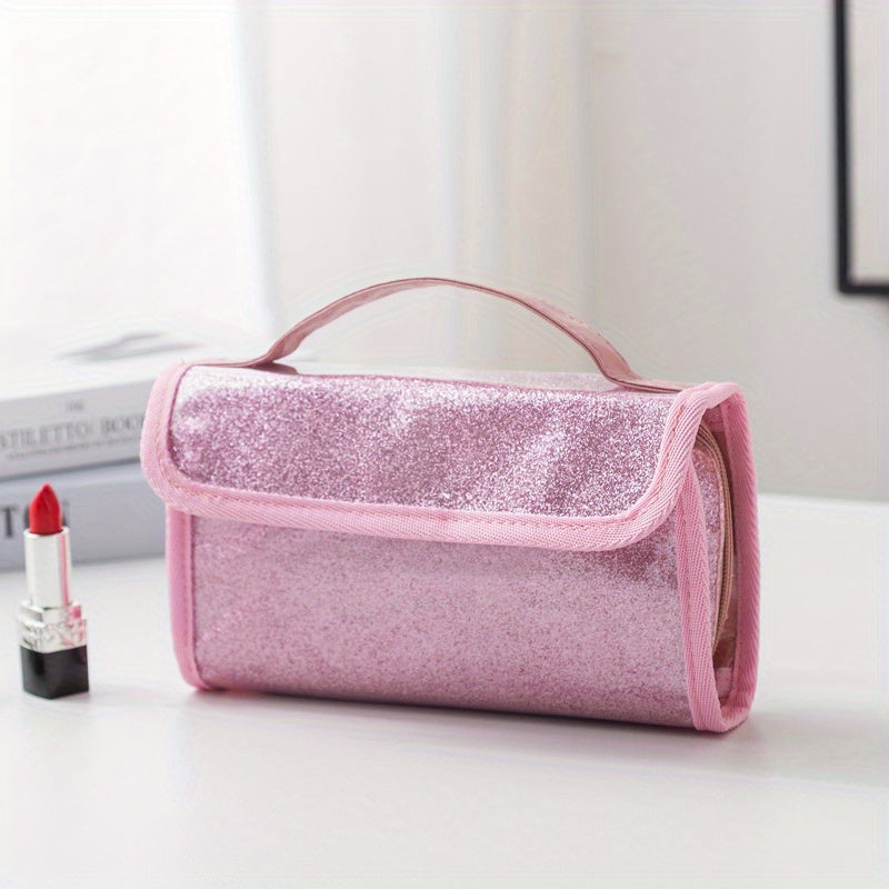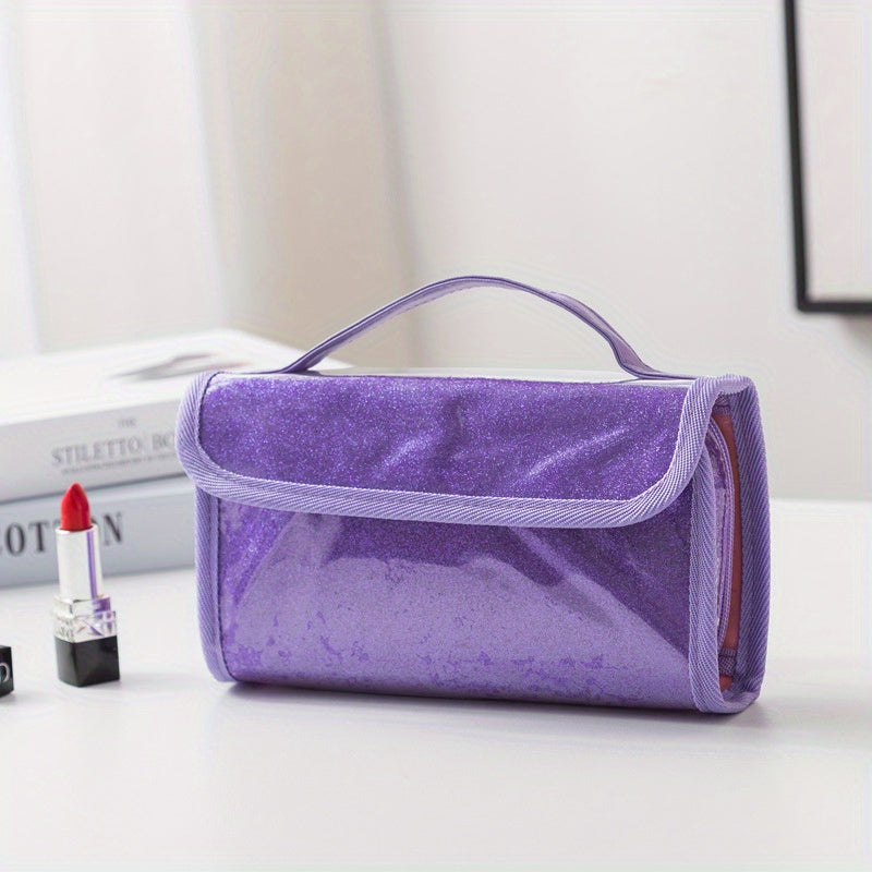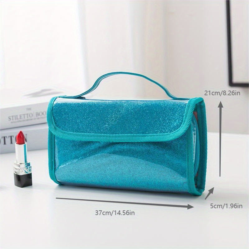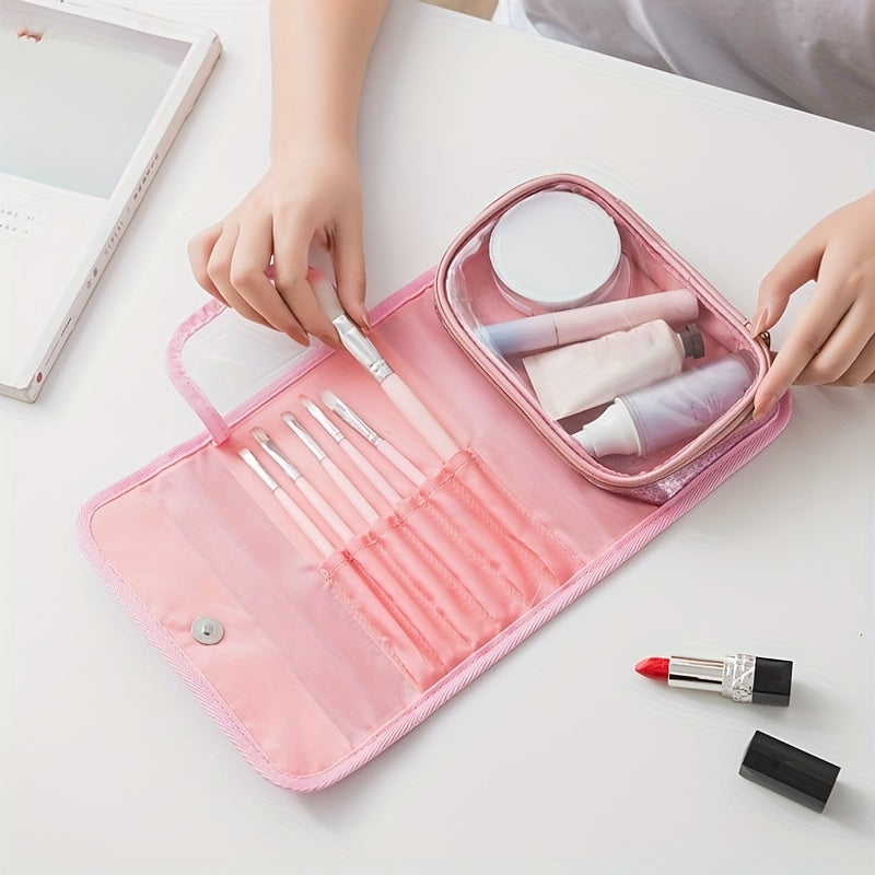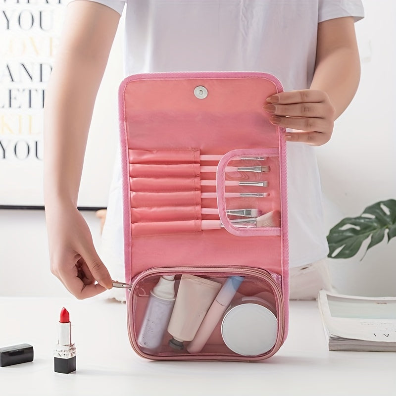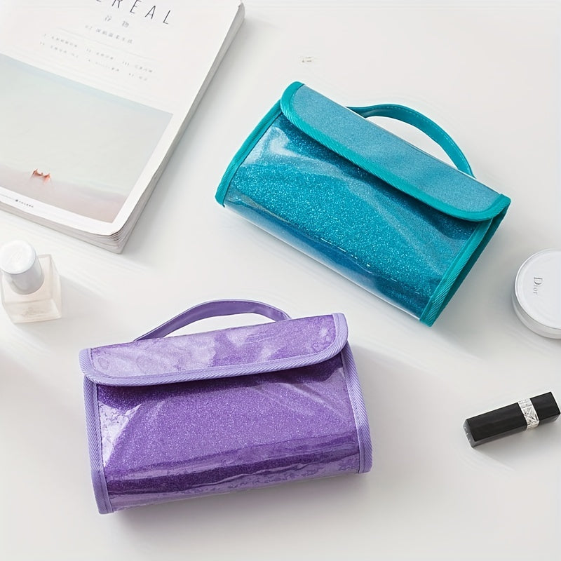 This portable cosmetic bag is made of PVC material and features a waterproof design. It has a button closure and can be easily hung in the bathroom. Perfect for travel or daily use.
